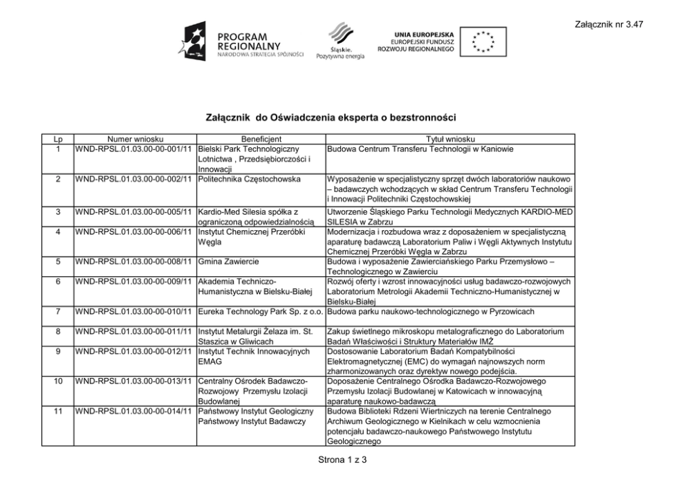 Załącznik nr 3.47 Załącznik do Oświadczenia eksperta o bezstronności Lp 1 2 3 4 5 6 7 8 9 10 11 Numer wniosku Beneficjent WND-RPSL.01.03.00-00-001/11 Bielski Park Technologiczny Lotnictwa , Przedsiębiorczości i Innowacji WND-RPSL.01.03.00-00-002/11 Politechnika Częstochowska Tytuł wniosku Budowa Centrum Transferu Technologii w Kaniowie Wyposażenie w specjalistyczny sprzęt dwóch laboratoriów naukowo – badawczych wchodzących w skład Centrum Transferu Technologii i Innowacji Politechniki Częstochowskiej WND-RPSL.01.03.00-00-005/11 Kardio-Med Silesia spółka z ograniczoną odpowiedzialnością WND-RPSL.01.03.00-00-006/11 Instytut Chemicznej Przeróbki Węgla Utworzenie Śląskiego Parku Technologii Medycznych KARDIO-MED SILESIA w Zabrzu Modernizacja i rozbudowa wraz z doposażeniem w specjalistyczną aparaturę badawczą Laboratorium Paliw i Węgli Aktywnych Instytutu Chemicznej Przeróbki Węgla w Zabrzu WND-RPSL.01.03.00-00-008/11 Gmina Zawiercie Budowa i wyposażenie Zawierciańskiego Parku Przemysłowo – Technologicznego w Zawierciu WND-RPSL.01.03.00-00-009/11 Akademia TechniczoRozwój oferty i wzrost innowacyjności usług badawczo-rozwojowych Humanistyczna w Bielsku-Białej Laboratorium Metrologii Akademii Techniczno-Humanistycznej w Bielsku-Białej WND-RPSL.01.03.00-00-010/11 Eureka Technology Park Sp. z o.o. Budowa parku naukowo-technologicznego w Pyrzowicach WND-RPSL.01.03.00-00-011/11 Instytut Metalurgii Żelaza im. St. Staszica w Gliwicach WND-RPSL.01.03.00-00-012/11 Instytut Technik Innowacyjnych EMAG WND-RPSL.01.03.00-00-013/11 Centralny Ośrodek BadawczoRozwojowy Przemysłu Izolacji Budowlanej WND-RPSL.01.03.00-00-014/11 Państwowy Instytut Geologiczny Państwowy Instytut Badawczy Zakup świetlnego mikroskopu metalograficznego do Laboratorium Badań Właściwości i Struktury Materiałów IMŻ Dostosowanie Laboratorium Badań Kompatybilności Elektromagnetycznej (EMC) do wymagań najnowszych norm zharmonizowanych oraz dyrektyw nowego podejścia. Doposażenie Centralnego Ośrodka Badawczo-Rozwojowego Przemysłu Izolacji Budowlanej w Katowicach w innowacyjną aparaturę naukowo-badawczą Budowa Biblioteki Rdzeni Wiertniczych na terenie Centralnego Archiwum Geologicznego w Kielnikach w celu wzmocnienia potencjału badawczo-naukowego Państwowego Instytutu Geologicznego Strona 1 z 3 Załącznik nr 3.47 12 WND-RPSL.01.03.00-00-016/11 Wyższa Szkoła Techniczna w Katowicach 13 WND-RPSL.01.03.00-00-017/11 Stowarzyszenie 'Misericordia' w Zabrzu WND-RPSL.01.03.00-00-020/11 Instytut Techniki Górniczej KOMAG 14 Rozbudowa laboratoriów Instytutu Techniki Górniczej KOMAG celem prowadzenia badań na rzecz bezpieczeństwa użytkowania wyrobów. Śląski Park PrzemysłowoUtworzenie w ramach ŚPPT laboratorium projektowania Technologiczy przestrzennego Śląski Uniwersytet Medyczny w Modernizacja laboratoriów Katedry i Zakładu Mikrobiologii i Katowicach Immunologii na potrzeby naukowo – usługowe związane z transferem technologii i innowacjami Górnośląski Park Przemysłowy sp. Budowa drugiego energooszczędnego budynku administracyjnoz o.o. biurowego na potrzeby Parku Technologicznego dla Górnośląskiego Parku Przemysłowego w Katowicach Fundacja Rozwoju Kardiochirurgii Przebudowa i doposażenie w aparaturę specjalistyczną części im. prof. Zbigniewa Religi budynku na potrzeby Laboratorium Technologicznego Pracowni Sztucznego Serca w ramach CD Fundacji Rozwoju Kardiochirurgii w Zabrzu Park Naukowo-Technologiczny Wzmocnienie potencjału poprzez doposażenie w aparaturę „TECHNOPARK GLIWICE” Spółka specjalistyczną Parku Naukowo- Technologicznego „TECHNOPARK z ograniczoną odpowiedzialnością GLIWICE” Sp. z o. o. w Gliwicach 15 WND-RPSL.01.03.00-00-022/11 16 WND-RPSL.01.03.00-00-024/11 17 WND-RPSL.01.03.00-00-026/11 18 WND-RPSL.01.03.00-00-028/11 19 WND-RPSL.01.03.00-00-029/11 20 WND-RPSL.01.03.00-00-030/11 Miasto Radlin 21 22 Budowa i doposażenie w aparaturę specjalistyczną CTT Silesia w Katowicach -w ramach Centrum biurowo-usługowego Brynów Center I - świadczącego usługi w zakresie innowacji i transferu technologii. Budowa Zabrzańskiego Centrum Innowacji Dynamizacja rozwoju społeczno-gospodarczego Subregionu Zachodniego i wzmocnienie potencjału technologicznego śląskich przedsiębiorstw dzięki utworzeniu Parku PrzemysłowoTechnologicznego w Radlinie WND-RPSL.01.03.00-00-031/11 Polska Akademia Nauk, pl. Defilad Remont i modernizacja laboratorium badawczego Zakładu 1, 00-901 Warszawa, PAN, Zakład Ichtiobiologii i Gospodarki Rybackiej w Zaborzu Ichtiobiologii i Gospodarki Rybackiej WND-RPSL.01.03.00-00-033/11 Politechnika Śląska Przemysłowo Zorientowane Laboratorium Badań, Transferu Technologii i Zastosowań Zaawansowanych Materiałów Inżynierskich i Biomedycznych w Gliwicach Strona 2 z 3 Załącznik nr 3.47 23 WND-RPSL.01.03.00-00-034/11 Wyższa Szkoła Zarządzania Ochroną Pracy w Katowicach 24 WND-RPSL.01.03.00-00-035/11 Centrum Materiałów Polimerowych i Weglowych PAN 25 WND-RPSL.01.03.00-00-036/11 AGENCJA ROZWOJU PRZEDSIĘBIORCZOŚCI SP. Z WND-RPSL.01.03.00-00-038/11 O.O. Agencja Rozwoju Regionalnego w Częstochowie Spółka Akcyjna 26 27 WND-RPSL.01.03.00-00-040/11 Akademia im. Jana Długosza w Częstochowie 28 WND-RPSL.01.03.00-00-041/11 Akademia im. Jana Długosza w Częstochowie 29 WND-RPSL.01.03.00-00-046/11 Optirem Sp. z o.o. i spółka - spółka komandytowa WND-RPSL.01.03.00-00-047/11 Optirem Sp. z o.o. i spółka - spółka komandytowa WND-RPSL.01.03.00-00-048/11 Optirem Sp. z o.o. i spółka - spółka komandytowa WND-RPSL.01.03.00-00-049/11 CENTRUM TRANSFERU TECHNOLOGII HEMARPOL SP. Z O.O. 30 31 32 Budowa kompleksu innowacyjnych laboratoriów Wyższej Szkoły Zarządzania Ochroną Pracy w Katowicach na potrzeby gospodarki regionu Modernizacja bazy laboratoryjnej zespołów materiałów polimerowych, w tym biomedycznych i materiałów z źródeł odnawialnych - wkład w transfer technologii i innowacji 'Umocnien