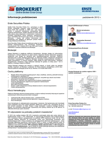 październik 2012 r. Informacje podstawowe Erste Securities Polska Zespół ESP/Brokerjet w Polsce Spółka Erste Securities Polska S.A., wchodząca w skład struktur wiodącego dostawcy usług finansowych Erste Group Bank AG, powstała w 1995 roku i jest obecnie jednym z czołowych uczestników warszawskiej Giełdy Papierów Wartościowych. Spółka zatrudnia 40 osób i oferuje pełny zakres usług związanych z zawieraniem i rozliczaniem transakcji dotyczących obrotu papierami wartościowymi, opcji i kontraktów terminowych typu futures na instrumenty finansowe i towary, jak również instrumenty rynku pieniężnego oraz obligacje na głównych rynkach Polski i Europy Środkowo-Wschodniej. Michał Jarmakowicz Makler [email protected] Przemysław Nowosad Makler Erste Securities Polska oferuje kompleksowe usługi na rzecz klientów instytucjonalnych oraz zamożnych inwestorów indywidualnych. Od 4 kwietnia 2012 roku ESP pełni funkcję pośrednika w zakresie otwierania kont Brokerjet. [email protected] Zasięg geograficzny Brokerjet Brokerjet Usługa Brokerjet to wyjątkowa platforma transakcyjna, oferująca dostęp do instrumentów finansowych z różnych regionów na całym świecie. Zapewnia również różnorodne narzędzia analityczne oraz dostęp do aktualnej bazy wyselekcjonowanych informacji. Platforma oferowana jest w wielu wersjach językowych, co zapewnia szybkie i bezpieczne zarządzanie rachunkami inwestycyjnymi. Platforma Brokerjet umożliwia przeprowadzanie transakcji w czasie rzeczywistym i w różnych walutach, dając dostęp do wielu instrumentów i lokalizacji geograficznych. Inwestorzy mogą realizować operacje 24 godziny na dobę przez 7 dni w tygodniu z każdego miejsca na świecie. Usługa Brokerjet dostępna jest obecnie w czterech krajach: w Austrii, gdzie ma siedzibę centrala, Czechach, na Słowacji i w Słowenii. W Polsce zostanie udostępniona w 2012 roku. Obecnie platforma obsługuje ponad 56 tys. klientów, a ich liczba stale rośnie. Cechy platformy Dostęp Brokerjet do rynków regionu CEE i rynków światowych Bogata oferta instrumentów inwestycyjnych: akcje, certyfikaty, warranty, jednostki funduszy inwestycyjnych, certyfikaty ETF. Transakcje na 27 kluczowych giełdach światowych; wszystkie typy zleceń oraz limitów dotyczących transakcji oraz ich realizacji. Ponad 4 tys. krajowych oraz zagranicznych funduszy inwestycyjnych. Pożyczki zabezpieczone zagranicznymi papierami wartościowymi. Cross-selling/arbitraż. Brak opłat za przechowywanie. Prosta, w pełni zintegrowana funkcja składania zleceń w obrocie bezpośrednim. Polska wersja językowa. Klucz transakcyjny Platforma Brokerjet zapewnia bezpieczeństwo w trakcie realizacji transakcji dotyczących papierów wartościowych online przy pomocy trzech rozwiązań: szyfrowanie SSL (Secure Socket Layer) – protokół HTTPS, dowolnie dobierane hasła (kontrola zgodności z regułami budowy), klucz transakcyjny. Kontakt Klucz transakcyjny to zabezpieczenie nowoczesne i skuteczne. Kod generowany jest równolegle przez urządzenie oraz przez system Brokerjet. Składa się z sześciu cyfr i wprowadza się go na tych samych zasadach, co hasło. Można z niego skorzystać z poziomu każdego terminalu, laptopa, czy komputera stacjonarnego. Dynamiczny kod cyfrowy zmienia się co 60 sekund, co całkowicie eliminuje ryzyko oszustwa. 1 W odpowiedzi na potrzeby polskich inwestorów W 2010 roku według badania GfK 20% inwestorów postrzegało siebie jako osoby skłonne do podejmowania ryzyka, a 74% deklarowało, że dopuszczają poniesienie strat przekraczających 10%. Inwestorzy, których zaangażowanie na parkiecie GPW przekracza kwotę 100 tys. PLN, wykazują większą skłonność do ponoszenia ryzyka oraz dopuszczają poniesienie strat przekraczających 20%. Polscy inwestorzy nie wykazują jednak skłonności spekulacyjnych – akcje pozostają najbardziej popularnym instrumentem (94%), a wybór w drugiej kolejności pada na obligacje (41%). Inwestorzy dysponujący większym kapitałem wybierają również inne instrumenty, zwłaszcza instrumenty pochodne. 78% inwestorów składa zlecenia online, a 24% korzysta w tym celu z usług telefonicznych. Jest to dowód na wysoki potencjał biznesowy dla świadczenia profesjonalnych i wysokiej jakości usług brokerskich online. Erste Securities Polska S.A. ul. Królewska 16, 00-103 Warszawa Tel. +48 (22) 538 62 62 e-mail: [email protected] www.Brokerjet.pl www.esp.pl Platforma Brokerjet jest własnością Brokerjet Bank AG. Brokerjet Bank AG jest spółką w całości należącą do Erste Group Bank AG. Brokerjet jest posiadaczem licencji bankowej grupy w Europejskim Obrzasze Gospodarczym (EOG). Poza Austrią, Brokerjet oferuje swoje usługi w ramach przedsięwzięć typu joint venture 1 Wszystkie dane oparto na wynikach badania GfK, przeprowadzonego w czerwcu 2010 roku na grupie 451 inwestorów (badanie ilościowe online) oraz około 30 respondentów (badanie jakościowe, grupa fokusowa). Erste Securities Polska S.A., Królewska 16, 00-103 Warszawa, www.esp.pl, Tel.:+ 48 22 538 6200, [email protected]