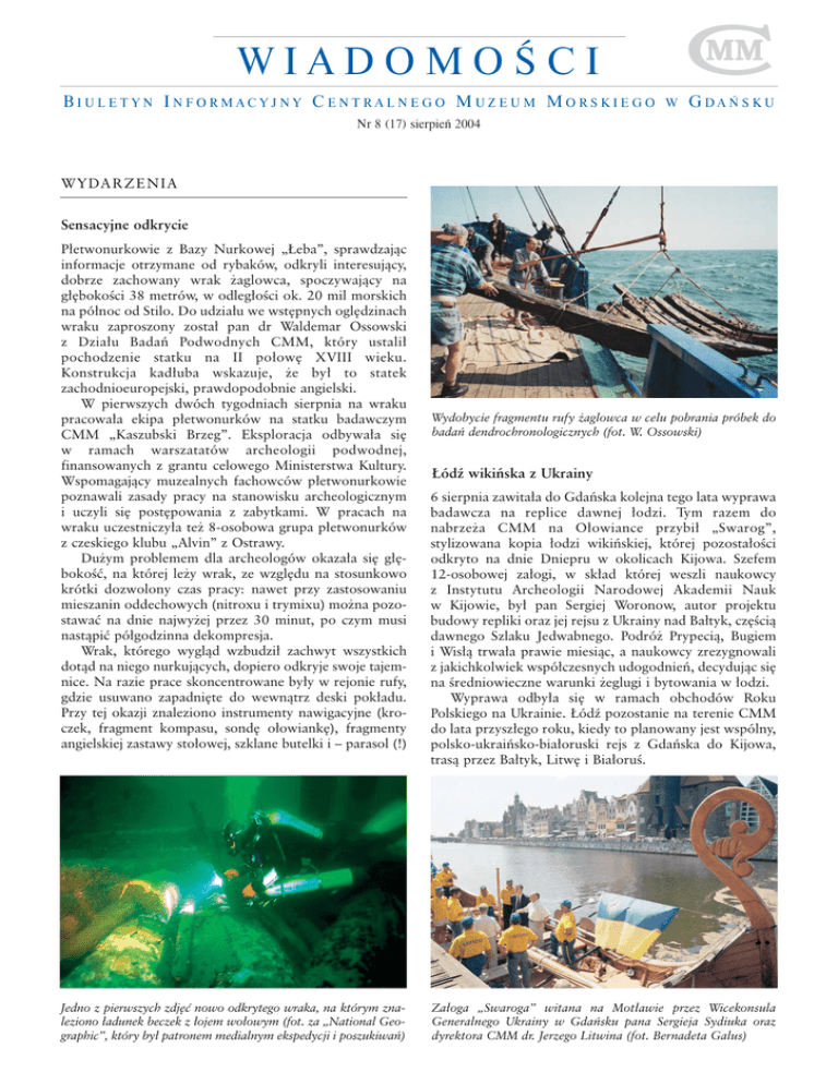 WIADOMOÂCI BIULETYN INFORMACYJNY CENTR ALNEGO MUZEUM MORSKIEGO W GDA¡SKU Nr 8 (17) sierpieƒ 2004 W Y DA R Z E N I A Sensacyjne odkrycie P∏etwonurkowie z Bazy Nurkowej „¸eba”, sprawdzajàc informacje otrzymane od rybaków, odkryli interesujàcy, dobrze zachowany wrak ˝aglowca, spoczywajàcy na g∏´bokoÊci 38 metrów, w odleg∏oÊci ok. 20 mil morskich na pó∏noc od Stilo. Do udzia∏u we wst´pnych ogl´dzinach wraku zaproszony zosta∏ pan dr Waldemar Ossowski z Dzia∏u Badaƒ Podwodnych CMM, który ustali∏ pochodzenie statku na II po∏ow´ XVIII wieku. Konstrukcja kad∏uba wskazuje, ˝e by∏ to statek zachodnioeuropejski, prawdopodobnie angielski. W pierwszych dwóch tygodniach sierpnia na wraku pracowa∏a ekipa p∏etwonurków na statku badawczym CMM „Kaszubski Brzeg”. Eksploracja odbywa∏a si´ w ramach warszatatów archeologii podwodnej, finansowanych z grantu celowego Ministerstwa Kultury. Wspomagajàcy muzealnych fachowców p∏etwonurkowie poznawali zasady pracy na stanowisku archeologicznym i uczyli si´ post´powania z zabytkami. W pracach na wraku uczestniczy∏a te˝ 8-osobowa grupa p∏etwonurków z czeskiego klubu „Alvin” z Ostrawy. Du˝ym problemem dla archeologów okaza∏a si´ g∏´bokoÊç, na której le˝y wrak, ze wzgl´du na stosunkowo krótki dozwolony czas pracy: nawet przy zastosowaniu mieszanin oddechowych (nitroxu i trymixu) mo˝na pozostawaç na dnie najwy˝ej przez 30 minut, po czym musi nastàpiç pó∏godzinna dekompresja. Wrak, którego wyglàd wzbudzi∏ zachwyt wszystkich dotàd na niego nurkujàcych, dopiero odkryje swoje tajemnice. Na razie prace skoncentrowane by∏y w rejonie rufy, gdzie usuwano zapadni´te do wewnàtrz deski pok∏adu. Przy tej okazji znaleziono instrumenty nawigacyjne (kroczek, fragment kompasu, sond´ o∏owiank´), fragmenty angielskiej zastawy sto∏owej, szklane butelki i – parasol (!) Jedno z pierwszych zdj´ç nowo odkrytego wraka, na którym znaleziono ∏adunek beczek z ∏ojem wo∏owym (fot. za „National Geographic”, który by∏ patronem medialnym ekspedycji i poszukiwaƒ) Wydobycie fragmentu rufy ˝aglowca w celu pobrania próbek do badaƒ dendrochronologicznych (fot. W. Ossowski) ¸ódê wikiƒska z Ukrainy 6 sierpnia zawita∏a do Gdaƒska kolejna tego lata wyprawa badawcza na replice dawnej ∏odzi. Tym razem do nabrze˝a CMM na O∏owiance przybi∏ „Swarog”, stylizowana kopia ∏odzi wikiƒskiej, której pozosta∏oÊci odkryto na dnie Dniepru w okolicach Kijowa. Szefem 12-osobowej za∏ogi, w sk∏ad której weszli naukowcy z Instytutu Archeologii Narodowej Akademii Nauk w Kijowie, by∏ pan Sergiej Woronow, autor projektu budowy repliki oraz jej rejsu z Ukrainy nad Ba∏tyk, cz´Êcià dawnego Szlaku Jedwabnego. Podró˝ Prypecià, Bugiem i Wis∏à trwa∏a prawie miesiàc, a naukowcy zrezygnowali z jakichkolwiek wspó∏czesnych udogodnieƒ, decydujàc si´ na Êredniowieczne warunki ˝eglugi i bytowania w ∏odzi. Wyprawa odby∏a si´ w ramach obchodów Roku Polskiego na Ukrainie. ¸ódê pozostanie na terenie CMM do lata przysz∏ego roku, kiedy to planowany jest wspólny, polsko-ukraiƒsko-bia∏oruski rejs z Gdaƒska do Kijowa, trasà przez Ba∏tyk, Litw´ i Bia∏oruÊ. Za∏oga „Swaroga” witana na Mot∏awie przez Wicekonsula Generalnego Ukrainy w Gdaƒsku pana Sergieja Sydiuka oraz dyrektora CMM dr. Jerzego Litwina (fot. Bernadeta Galus) W S P Ó ¸ P RAC A Z Z AG RA N I C Ñ Wystawa o transatlantyku „Pi∏sudski” W lipcu odwiedzi∏ CMM pan Mike Oborski, konsul honorowy RP w Wielkiej Brytanii, za∏o˝yciel i przewodniczàcy Towarzystwa MS „Pi∏sudski”. Jego wizyta mia∏a na celu nawiàzanie wspó∏pracy z naszym muzeum oraz przeprowadzenie kwerendy w zwiàzku z planowanym przez Towarzystwo otwarciem wystawy poÊwi´conej s∏ynnemu polskiemu transatlantykowi, który zatonà∏ u wybrze˝y Wielkiej Brytanii 26 listopada 1939 roku. Pamiàtki z jachtu „Peter von Danzig” Wizyta pana Klausa Böhma, syna niemieckiego ˝eglarza, który p∏ywa∏ na zbudowanym w 1936 roku jachcie „Peter von Danzig”, zaowocowa∏a niezwyk∏ym darem: goÊç przekaza∏ do zbiorów CMM model kad∏uba jachtu oraz dokumenty zwiàzane z jego w∏aÊcicielem – akademickim klubem ˝eglarskim (Akademische Segler-Verein) w Gdaƒsku. Niewàtpliwà ciekawostkà jest pami´tnik z przedwojennych regat na trasie Bermudy-Cuxhaven. Vivat Vasa! CMM mia∏o niecodziennà sposobnoÊç zaprezentowania si´ w trakcie plenerowej imprezy zorganizowanej w Gniewie przez gdaƒskie Muzeum Archeologiczne i Fundacj´ Zamek Gniew. 14 sierpnia odby∏a si´ inscenizacja bitwy pod Gniewem, znanej tak˝e jako bitwa dwóch Wazów, która by∏a jednym z epizodów wojen polsko-szwedzkich z poczàtku XVII wieku. W zamkowej sali Âw. Jerzego ustawione zosta∏y postery przedstawiajàce zabytki pochodzàce z wraka „Solena”, okr´tu uczestniczàcego w rok póêniejszej bitwie morskiej pod Oliwà, a ekipa CMM pod kierownictwem pani mgr Moniki Golenko z Dzia∏u Edukacji Morskiej opowiada∏a zwiedzajàcym o oliwskiej wiktorii, prezentowa∏a repliki zabytków z „Solena” i sprz´t nurkowy oraz organizowa∏a zaj´cia edukacyjne dla najm∏odszych (konkursy plastyczne, puzzle, krzy˝ówki). Konferencja w K∏ajpedzie Muzeum Morskie i Delfinarium w K∏ajpedzie obchodzi∏o 25-lecie powstania. Z tej okazji zorganizowana zosta∏a Mi´dzynarodowa Konferencja Muzeów Morskich na Litwie, zatytu∏owana „Muzeum morskie XX wieku: synteza tradycji i nowoczesnoÊci”. W spotkaniu wzi´li udzia∏ przedstawiciele europejskich muzeów morskich i instytucji kultury, m.in. z Francji, Belgii, Polski i ¸otwy. G∏ównym tematem by∏o wyzwanie stojàce przed muzeami w XXI wieku, czyli po∏àczenie tradycji z nowoczesnoÊcià. Próbowano odpowiedziec na pytania, jak przygotowywaç prezentacje muzealne dla aktualnych i przysz∏ych odbiorców, jakie techniki zastosowaç, aby uatrakcyjniç wystawy it