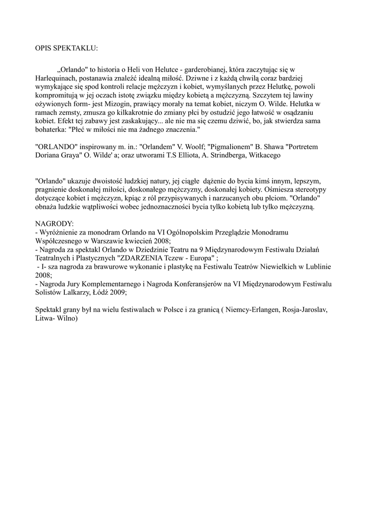 OPIS SPEKTAKLU: „Orlando" to historia o Heli von Helutce - garderobianej, która zaczytując się w Harlequinach, postanawia znaleźć idealną miłość. Dziwne i z każdą chwilą coraz bardziej wymykające się spod kontroli relacje mężczyzn i kobiet, wymyślanych przez Helutkę, powoli kompromitują w jej oczach istotę związku między kobietą a mężczyzną. Szczytem tej lawiny ożywionych form- jest Mizogin, prawiący morały na temat kobiet, niczym O. Wilde. Helutka w ramach zemsty, zmusza go kilkakrotnie do zmiany płci by ostudzić jego łatwość w osądzaniu kobiet. Efekt tej zabawy jest zaskakujący... ale nie ma się czemu dziwić, bo, jak stwierdza sama bohaterka: "Płeć w miłości nie ma żadnego znaczenia." "ORLANDO" inspirowany m. in.: "Orlandem" V. Woolf; "Pigmalionem" B. Shawa "Portretem Doriana Graya" O. Wilde' a; oraz utworami T.S Elliota, A. Strindberga, Witkacego "Orlando" ukazuje dwoistość ludzkiej natury, jej ciągłe dążenie do bycia kimś innym, lepszym, pragnienie doskonałej miłości, doskonałego mężczyzny, doskonałej kobiety. Ośmiesza stereotypy dotyczące kobiet i mężczyzn, kpiąc z ról przypisywanych i narzucanych obu płciom. "Orlando" obnaża ludzkie wątpliwości wobec jednoznaczności bycia tylko kobietą lub tylko mężczyzną. NAGRODY: - Wyróżnienie za monodram Orlando na VI Ogólnopolskim Przeglądzie Monodramu Współczesnego w Warszawie kwiecień 2008; - Nagroda za spektakl Orlando w Dziedzinie Teatru na 9 Międzynarodowym Festiwalu Działań Teatralnych i Plastycznych "ZDARZENIA Tczew - Europa" ; - I- sza nagroda za brawurowe wykonanie i plastykę na Festiwalu Teatrów Niewielkich w Lublinie 2008; - Nagroda Jury Komplementarnego i Nagroda Konferansjerów na VI Międzynarodowym Festiwalu Solistów Lalkarzy, Łódź 2009; Spektakl grany był na wielu festiwalach w Polsce i za granicą ( Niemcy-Erlangen, Rosja-Jaroslav, Litwa- Wilno)