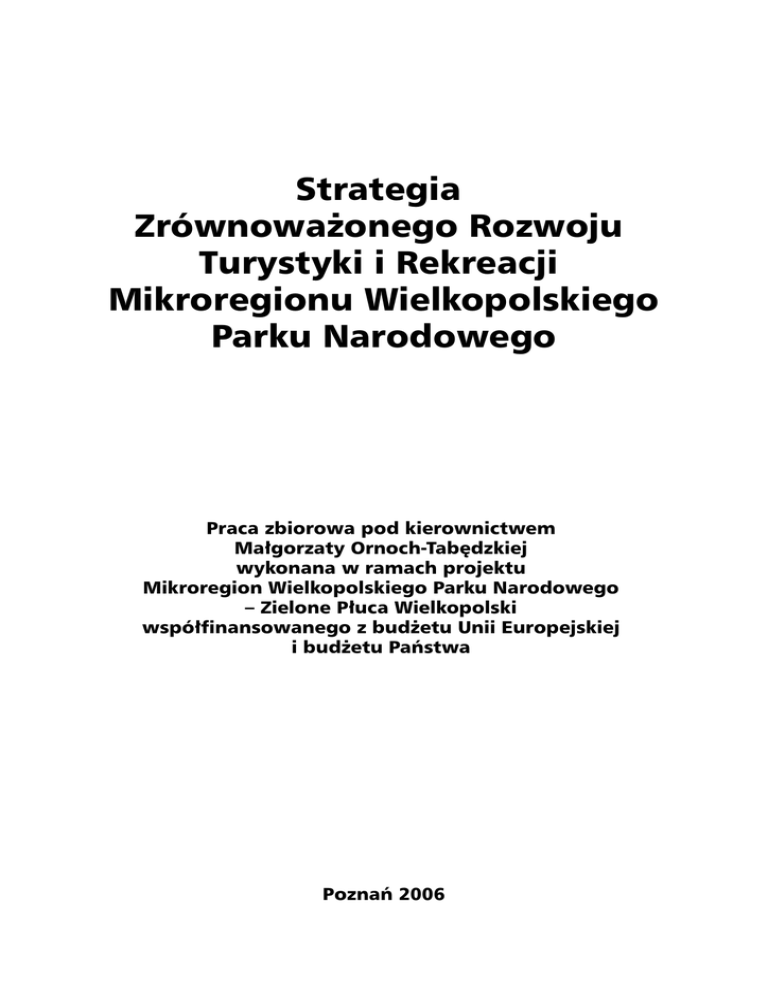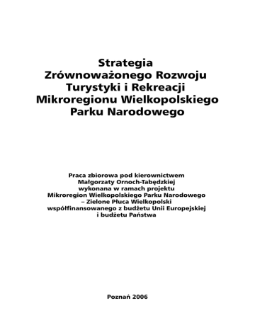 Strategia Zrównoważonego Rozwoju Turystyki i Rekreacji Mikroregionu Wielkopolskiego Parku Narodowego Praca zbiorowa pod kierownictwem Małgorzaty Ornoch-Tabędzkiej wykonana w ramach projektu Mikroregion Wielkopolskiego Parku Narodowego – Zielone Płuca Wielkopolski współfinansowanego z budżetu Unii Europejskiej i budżetu Państwa Poznań 2006 Niniejszy dokument został opublikowany dzięki pomocy finansowej Unii Europejskiej i Budżetu Państwa. Za treść tego dokumentu odpowiada Stowarzyszenie Partnerzy dla Samorządu, poglądy w nim wyrażone nie odzwierciedlają w żadnym razie oficjalnego stanowiska Unii Europejskiej. Autorzy tekstu: Agnieszka Byczyńska, Katarzyna Czernek, Jakub Isański, Iwona Jankowska, Krzysztof Kasprzak, Justyna Majewska, Marcin Olszewski, Małgorzata Ornoch-Tabędzka, Waldemar Prus, Piotr Przybysz, Marta Reksiak-Urbanowicz Projekt okładki: Maciej Orchowicz (www.artwork.pl) Copyright © by Stowarzyszenie Partnerzy dla Samorządu, Poznań 2006 ISBN 83-60247-40-4 Bogucki Wydawnictwo Naukowe ul. Górna Wilda 90, 61-576 Poznań, tel. +48 61 8336580 fax +48 61 8331468 e-mail: [email protected] www.bogucki.com.pl Druk: Uni-druk Wydawnictwo i Drukarnia Spółka Jawna ul. Przemysłowa 13, 62-030 Luboń tel. +48 61 8994949 Spis treści Wprowadzenie . . . . . . . . . . . . . . . . . . . . . . . . . . . . . . . . . . . . . . . 7 Małgorzata Ornoch-Tabędzka CZĘŚĆ I. Raport. Atrakcyjność i zagospodarowanie turystyczne Mikroregionu Wielkopolskiego Parku Narodowego . . . . . . . . . . . . . . . . . . . . . . . . . . . . . 11 Agnieszka Byczyńska 1. Mikroregion WPN – informacje ogólne o gminach . . . . . . . . . . . . . . . . . . . . . 13 1.1. Położenie . . . . . . . . . . . . . . . . . . . . . . . . . . . . . . . . . . . . . . . 13 1.2. Powierzchnia i ludność . . . . . . . . . . . . . . . . . . . . . . . . . . . . . . . . . 13 1.3. Budżet gmin i WPN . . . . . . . . . . . . . . . . . . . . . . . . . . . . . . . . . . 14 1.3.1. Najważniejsze wydatki gmin na turystykę . . . . . . . . . . . . . . . . . . . 17 2. Atrakcyjność turystyczna mikroregionu WPN . . . . . . . . . . . . . . . . . . . . . . . . 18 2.1. Walory przyrodnicze . . . . . . . . 2.1.1. Klimat . . . . . . . . . . . . 2.1.2. Ukształtowanie terenu . . . 2.1.3. Ochrona przyrody . . . . . . 2.1.4. Lasy . . . . . . . . . . . . . 2.1.5. Parki, zieleńce i place zabaw 2.1.6. Wody powierzchniowe . . . 2.1.7. Wody podziemne . . . . . . . . . . . . . . . . . . . . . . . . . . . . . . . . . . . . . . . . . . . . . . . . . . . . . . 2.2. Walory kulturowe i antropogeniczne . . . . . 2.2.1. Zabytki i architektura sakralna . . . . . 2.2.2. Cmentarze . . . . . . . . . . . . . . . 2.2.3. Zamki, pałace, dwory i folwarki . . . . . 2.2.4. Zabytki architektury, kultury materialnej i 2.2.5. Zabytki archeologiczne . . . . . . . . . 2.2.6. Muzea, skanseny, kolekcje i wystawy . . 2.2.7. Oferta kulturalna – imprezy i wydarzenia 2.2.8. Organizacje pozarządowe . . . . . . . . . . . . . . . . . . . . . . . . . . . . . . . . . . . . . . . . . . . . . . . . . . . . . . . . . . . . . . . . . . . . . . . . . . . . . . . . . . . . . . . . . . . . . . . . . . . . . . . . . . . . . . . . . . . . . . . . . . . . . . . . . . . . . . . . . . . . . . . . . . . . . . . . . . . . . . . . . . . . . . . . 18 18 18 18 26 27 27 35 . . . . . . . . . . . . . . . . . . . . . . . . użytkowej . . . . . . . . . . . . . . . . . . . . . . . . . . . . . . . . . . . . . . . . . . . . . . . . . . . . . . . . . . . . . . . . . . . . . . . . . . . . . . . . . . . . . . . . . . . . . . . . . . . . . . . . . . . . . . . . . . . . . . . . . . . . . . . . . . . . . . . . . . . . . . . . . . . . . . 35 36 40 41 44 48 48 51 54 3. Stan zagospodarowania turystycznego mikroregionu WPN . . . . . . . . . . . . . . . . 56 3.1. Infrastruktura turystyczna . . . . . . . . . 3.1.1. Baza noclegowa . . . . . . . . . . . 3.1.2. Baza gastronomiczna . . . . . . . . 3.1.3. Szlaki turystyczne . . . . . . . . . . 3.1.4. Wypożyczalnie sprzętu rekreacyjnego 3.1.5. Informacja turystyczna . . . . . . . . . . . . . . . . . . . . . . . . . . . . . . . . . . . . . . . i sportowego . . . . . . . . . . . . . . . . . . . . . . . . . . . . . . . . . . . . . . . . . . . . . . . . . . . . . . . . . . . . . . . . . . . . . . . . . . . . . . . . . . . . . . . . . . . . 56 56 57 57 64 64 3.2. Infrastruktura paraturystyczna . . . . 3.2.1. Dostępność komunikacyjna . . 3.2.2. Obiekty sportowe i rekreacyjne 3.2.3. Pozostałe obiekty i usługi . . . . . . . . . . . . . . . . . . . . . . . . . . . . . . . . . . . . . . . . . . . . . . . . . . . . . . . . . . . . . . . 65 66 70 71 . . . . . . . . . . . . . . . . . . . . . . . . . . . . . . . . . . . . . . . . 4 Spis treści 4. Promocja . . . . . . . . . . . . . . . . . . . . . . . . . . . . . . . . . . . . . . . . . . 74 4.1. Reklama, marketing bezpośredni i promocja sprzedaży . . . . . . . . . . . . . . . . 74 4.2. Public relations . . . . . . . . . . . . . . . . . . . . . . . . . . . . . . . . . . . . . 75 4.3. Sponsoring i lobbing . . . . . . . . . . . . . . . . . . . . . . . . . . . . . . . . . . 76 4.4. Współpraca . . . . . . . . . . . . . . . . . . . . . . . . . . . . . . . . . . . . . . 77 Załączniki Załącznik nr 1: Pomniki przyrody . . . . . . . . . . . . . . . . . . . . . . . . . . . . . . 79 Załącznik nr 2: Miejsca publicznego wypoczynku na terenie gmin Mikroregionu WPN . . 80 Załącznik nr 3: Oferta kulturalna . . . . . . . . . . . . . . . . . . . . . . . . . . . . . . 81 Załącznik nr 4: Organizacje pozarządowe . . . . . . . . . . . . . . . . . . . . . . . . . 84 Załącznik nr 5: Zestawienie obiektów bazy noclegowej . . . . . . . . . . . . . . . . . . 87 Załącznik nr 6: Zestawienie obiektów bazy gastronomicznej . . . . . . . . . . . . . . . 100 Załącznik nr 7: Ogólnodostępne parkingi . . . . . . . . . . . . . . . . . . . . . . . . . 106 Załącznik nr 8: Stacje benzynowe . . . . . . . . . . . . . .