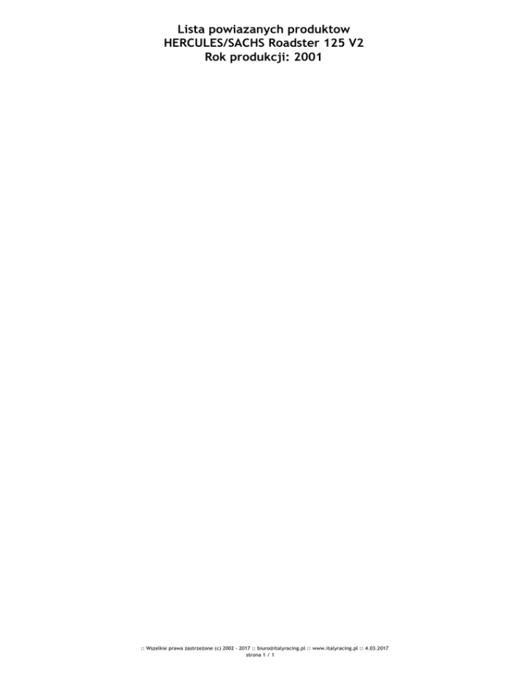 Lista powiazanych produktow HERCULES/SACHS Roadster 125 V2 Rok produkcji: 2001 :: Wszelkie prawa zastrzeżone (c) 2002 - 2017 :: [email protected] :: www.italyracing.pl :: 4.03.2017 strona 1 / 1