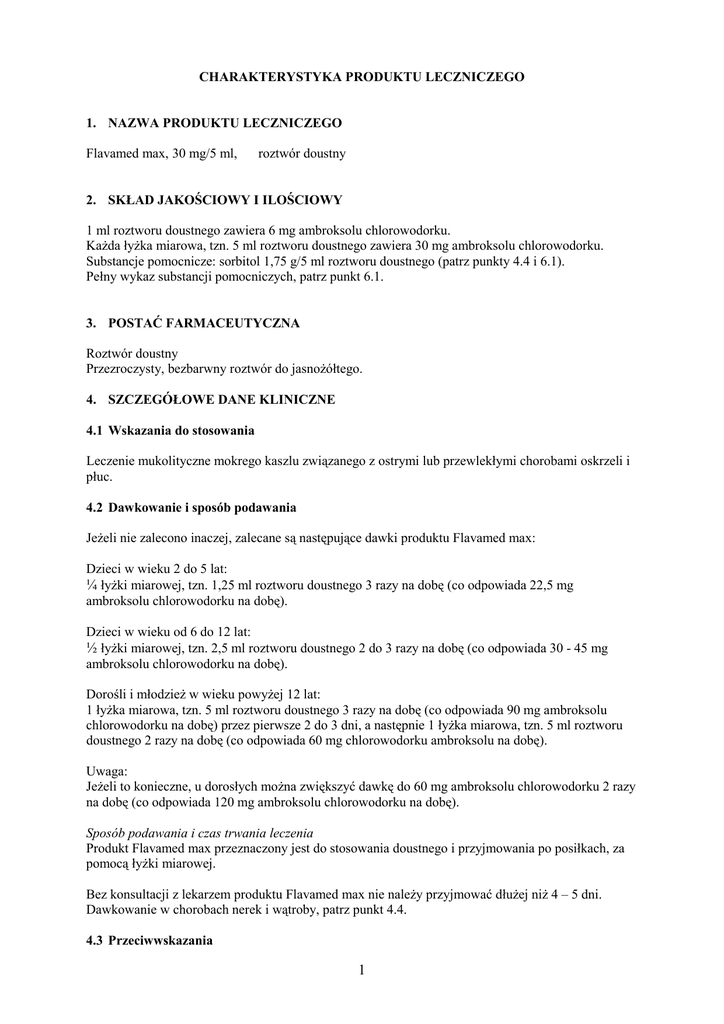 CHARAKTERYSTYKA PRODUKTU LECZNICZEGO 1. NAZWA PRODUKTU LECZNICZEGO Flavamed max, 30 mg/5 ml, roztwór doustny 2. SKŁAD JAKOŚCIOWY I ILOŚCIOWY 1 ml roztworu doustnego zawiera 6 mg ambroksolu chlorowodorku. Każda łyżka miarowa, tzn. 5 ml roztworu doustnego zawiera 30 mg ambroksolu chlorowodorku. Substancje pomocnicze: sorbitol 1,75 g/5 ml roztworu doustnego (patrz punkty 4.4 i 6.1). Pełny wykaz substancji pomocniczych, patrz punkt 6.1. 3. POSTAĆ FARMACEUTYCZNA Roztwór doustny Przezroczysty, bezbarwny roztwór do jasnożółtego. 4. SZCZEGÓŁOWE DANE KLINICZNE 4.1 Wskazania do stosowania Leczenie mukolityczne mokrego kaszlu związanego z ostrymi lub przewlekłymi chorobami oskrzeli i płuc. 4.2 Dawkowanie i sposób podawania Jeżeli nie zalecono inaczej, zalecane są następujące dawki produktu Flavamed max: Dzieci w wieku 2 do 5 lat: ¼ łyżki miarowej, tzn. 1,25 ml roztworu doustnego 3 razy na dobę (co odpowiada 22,5 mg ambroksolu chlorowodorku na dobę). Dzieci w wieku od 6 do 12 lat: ½ łyżki miarowej, tzn. 2,5 ml roztworu doustnego 2 do 3 razy na dobę (co odpowiada 30 - 45 mg ambroksolu chlorowodorku na dobę). Dorośli i młodzież w wieku powyżej 12 lat: 1 łyżka miarowa, tzn. 5 ml roztworu doustnego 3 razy na dobę (co odpowiada 90 mg ambroksolu chlorowodorku na dobę) przez pierwsze 2 do 3 dni, a następnie 1 łyżka miarowa, tzn. 5 ml roztworu doustnego 2 razy na dobę (co odpowiada 60 mg chlorowodorku ambroksolu na dobę). Uwaga: Jeżeli to konieczne, u dorosłych można zwiększyć dawkę do 60 mg ambroksolu chlorowodorku 2 razy na dobę (co odpowiada 120 mg ambroksolu chlorowodorku na dobę). Sposób podawania i czas trwania leczenia Produkt Flavamed max przeznaczony jest do stosowania doustnego i przyjmowania po posiłkach, za pomocą łyżki miarowej. Bez konsultacji z lekarzem produktu Flavamed max nie należy przyjmować dłużej niż 4 – 5 dni. Dawkowanie w chorobach nerek i wątroby, patrz punkt 4.4. 4.3 Przeciwwskazania 1 Nadwrażliwość na substancję czynną lub na którąkolwiek substancję pomocniczą wymienioną w punkcie 6.1. Produktu Flavamed max nie wolno stosować u dzieci w wieku poniżej 2 lat. 4.4 Specjalne ostrzeżenia i środki ostrożności dotyczące stosowania Bardzo rzadko opisywano występowanie ciężkich reakcji skórnych, takich jak zespół StevensaJohnsona i zespół Lyella, podczas stosowania ambroksolu. Z tego powodu w razie wystąpienia nowych zmian na skórze lub błonach śluzowych, należy niezwłocznie zgłosić się do lekarza i przerwać stosowanie ambroksolu. Ze względu na możliwość gromadzenia się wydzieliny oskrzelowej, należy zachować ostrożność podczas stosowania produktu Flavamed max u pacjentów z zaburzeniami czynności motorycznej oskrzeli i dużą ilością wydzieliny (np. w rzadkiej pierwotnej dyskinezie rzęsek (zespole nieruchomych rzęsek). U pacjentów z zaburzeniami czynności nerek lub ciężką chorobą wątroby Flavamed max musi być stosowany z zachowaniem szczególnej ostrożności (tj. zachowywać dłuższe odstępy między dawkami lub stosować mniejsze dawki leku). W ciężkiej niewydolności nerek należy brać pod uwagę możliwość kumulacji metabolitów ambroksolu, które powstały w wątrobie. Produkt leczniczy zawiera sorbitol. Pacjenci z rzadko występującą dziedziczną nietolerancją fruktozy nie powinni przyjmować produktu Flavamed max. Każda łyżka miarowa, tzn. 5 ml roztworu doustnego zawiera 1,75 g sorbitolu (= 0,15 jednostek chlebowych). Wartość kaloryczna to 2,6 kcal/g sorbitolu. Ponieważ, leki mukolityczne mogą uszkadzać barierę śluzówkową żołądka, ambroksol należy stosować ostrożnie u pacjentów z chorobą wrzodową żołądka i (lub) dwunastnicy w wywiadzie. 4.5 Interakcje z innymi produktami leczniczymi i inne rodzaje interakcji Podczas jednoczesnego stosowania produktu Flavamed max z lekami przeciwkaszlowymi może dojść do niebezpiecznego nagromadzenia wydzieliny oskrzelowej wskutek osłabionego odruchu kaszlowego, co oznacza, że wskazanie do takiego leczenia skojarzonego należy rozważyć szczególnie uważnie. 4.6 Wpływ na płodność, ciążę i laktację Płodność Badania na zwierzętach nie wykazały szkodliwego wpływu w odniesieniu do płodności (patrz punkt 5.3) Ciąża Brak wystarczających danych dotyczących stosowania ambroksolu u kobiet w ciąży. Szczególnie dotyczy to okresu do 28. tygodnia ciąży. W badaniach doświadczalnych przeprowadzonych na zwierzętach ambroksol nie wykazywał działań teratogennych (patrz punkt 5.3). Produkt Flavamed max można stosować wyłącznie po dokładnej ocenie stosunku korzyści do ryzyka, szczególnie w pierwszym trymestrze ciąży. Laktacja U zwierząt ambroksol przenika do mleka matki. Ponieważ dotychczas brak odpowiedniego doświadczenia ze stosowaniem ambroksolu u kobiet karmiących piersią, produkt Flavamed max 2 należy stosować w okresie karmienia piersią wyłącznie po dokładnej ocenie stosunku korzyści do ryzyka. 4.7 Wpływ na zdolność prowadzenia pojazdów i obsługiwania maszyn Brak dowodów na wpływ na zdolność prowadzenia pojazdów i obsługiwania maszyn. Nie przeprowadzono badań dotyczących wpływu na zdolność prowadzenia pojazdów i obsługiwania maszyn. 4.8 Działania niepożądane W ocenie działań niepożądanych jako podstawę przyjmuje się następujące częstości występowania: Bardzo często: ≥ 1/10 Często: ≥ 1/100 do < 1/10 Niezbyt często: ≥ 1/1 000 do < 1/100 Rzadko: ≥ 1/10 000 do < 1/1 000 Bardzo rzadko: < 1/10 000 Częstość nie znana (częstość nie może być określona na podstawie dostępnych danych) Zaburzenia żołądka i jelit: Często: Nudności Niezbyt często: Wymioty, suchość błony śluzowej jamy ustnej, biegunka, niestrawność, ból brzucha Zaburzenia układu immunologicznego: Rzadko: Wysypka, pokrzywka Częstość nie znana: Reakcje anafilaktyczne, w tym wstrząs anafilaktyczny, obrzęk naczynioruchowy, świąd i