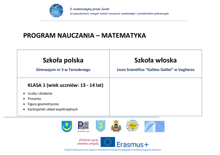 Z matematyką przez świat. W poszukiwaniu nowych metod nauczania matematyki i przedmiotów pokrewnych. PROGRAM NAUCZANIA – MATEMATYKA Szkoła polska Szkoła włoska Gimnazjum nr 3 w Tarnobrzegu Liceo Scientifico “Galileo Galilei” w Vogherze KLASA 1 (wiek uczniów: 13 - 14 lat) Liczby i działania Procenty Figury geometryczne Kartezjański układ współrzędnych Projekt realizowany przy wsparciu finansowym Komisji Europejskiej ze środków programu Erasmus+ Z matematyką przez świat. W poszukiwaniu nowych metod nauczania matematyki i przedmiotów pokrewnych. Wyrażenia algebraiczne (jednomiany, dodawanie i odejmowanie sum algebraicznych) Równania i nierówności pierwszego stopnia z jedną niewiadomą Wielkości wprost i odwrotnie proporcjonalne Symetrie KLASA 2 (wiek uczniów: 14 - 15 lat) Potęgi Pierwiastki Długość okręgu i pole koła Wyrażenia algebraiczne (mnożenie sum algebraicznych, wzory skróconego mnożenia) Układy równań pierwszego stopnia z dwiema niewiadomymi KLASA 1 (wiek uczniów: 14 - 15 lat) Zbiory, zbiory liczbowe Jednomiany Powinowactwo i funkcje Wielomiany Ułamki algebraiczne Równania pierwszego stopnia (liczby całkowite) Statystyka opisowa Projekt realizowany przy wsparciu finansowym Komisji Europejskiej ze środków programu Erasmus+ Z matematyką przez świat. W poszukiwaniu nowych metod nauczania matematyki i przedmiotów pokrewnych. Twierdzenie Pitagorasa Wielokąty wpisane i opisane Graniastosłupy i ostrosłup Statystyka opisowa i wprowadzenie do rachunku prawdopodobieństwa KLASA 3 (wiek uczniów: 15 - 16 lat) Funkcje (zaznaczanie i odczytywanie wartości funkcji dla danego argumentu, rysowanie prostych wykresów) Figury na płaszczyźnie Podobieństwo figur Bryły obrotowe Podstawowe zagadnienia geometrii Trójkąty i właściwości trójkąta Linie prostopadłe i równoległe Równoległoboki Trapezoidy, twierdzenie Talesa KLASA 2 (wiek uczniów: 15 - 16 lat) Nierówności liniowe (ułamkowe i całkowite) Równania pierwszego stopnia; nierówności pierwszego stopnia (na liczbach całkowitych) Układy równań pierwszego stopnia Płaszczyzna kartezjańska – kartezjański układ współrzędnych Potęgi i pokrewne działania Równania drugiego stopnia Projekt realizowany przy wsparciu finansowym Komisji Europejskiej ze środków programu Erasmus+ Z matematyką przez świat. W poszukiwaniu nowych metod nauczania matematyki i przedmiotów pokrewnych. Układ drugiego stopnia trójmianu Zadania problemowe z wykorzystaniem równań drugiego stopnia Nierówności pierwszego i drugiego stopnia (na liczbach całkowitych lub ułamkowych) – układy nierówności Równanie drugiego stopnia Równania wyższego stopnia Równania nieposiadające rozwiązań Zbiór punktów: obwód i okrąg Wielokąty wpisane i opisane Płaszczyzna równorzędna (planimetria) Wielkości proporcjonalne – twierdzenie Talesa Izometria Jednokładność i podobieństwo Prawdopodobieństwo Projekt realizowany przy wsparciu finansowym Komisji Europejskiej ze środków programu Erasmus+