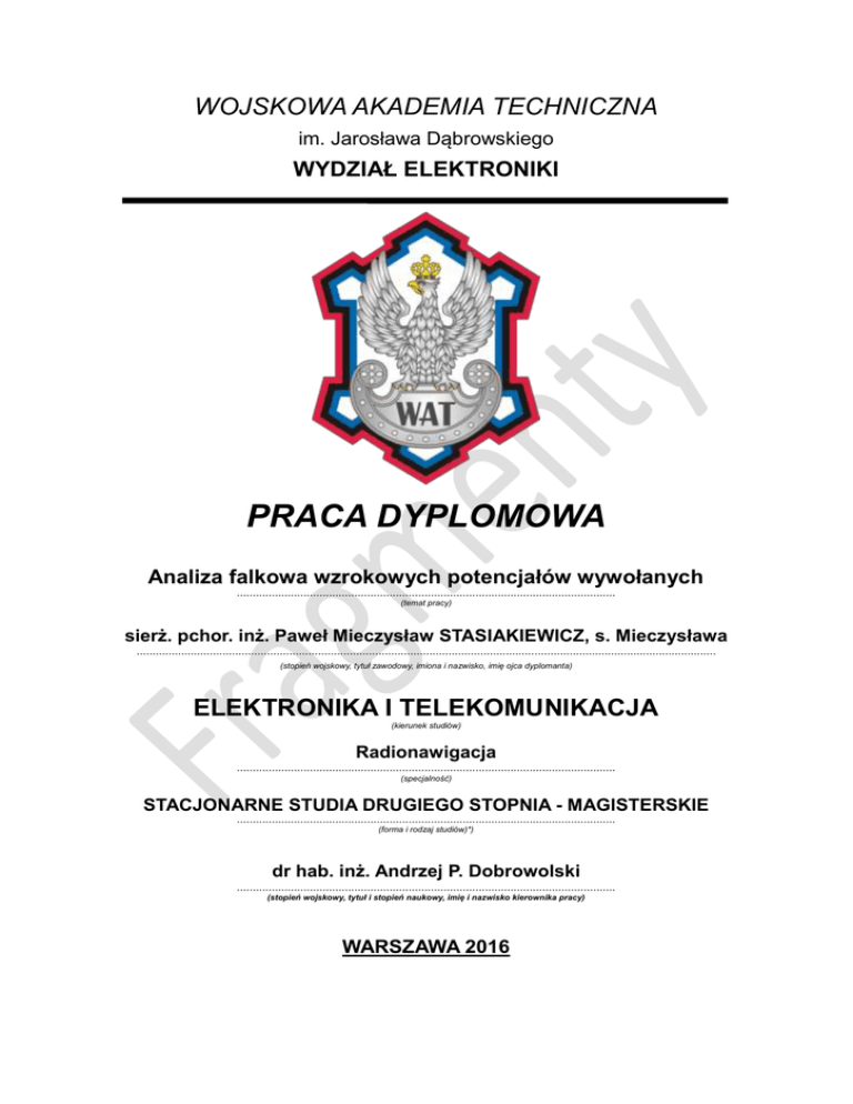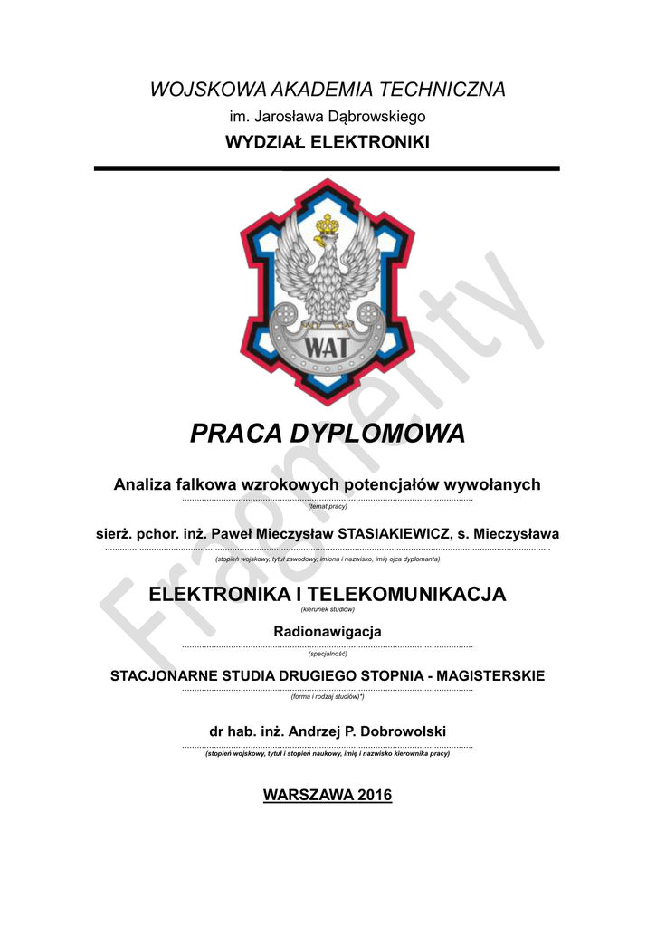 WOJSKOWA AKADEMIA TECHNICZNA im. Jarosława Dąbrowskiego WYDZIAŁ ELEKTRONIKI PRACA DYPLOMOWA Analiza falkowa wzrokowych potencjałów wywołanych ....................................................................................................................... (temat pracy) sierż. pchor. inż. Paweł Mieczysław STASIAKIEWICZ, s. Mieczysława ...................................................................................................................................................................................... (stopień wojskowy, tytuł zawodowy, imiona i nazwisko, imię ojca dyplomanta) ELEKTRONIKA I TELEKOMUNIKACJA (kierunek studiów) Radionawigacja ....................................................................................................................... (specjalność) STACJONARNE STUDIA DRUGIEGO STOPNIA - MAGISTERSKIE ....................................................................................................................... (forma i rodzaj studiów)*) dr hab. inż. Andrzej P. Dobrowolski ....................................................................................................................... (stopień wojskowy, tytuł i stopień naukowy, imię i nazwisko kierownika pracy) WARSZAWA 2016 Wprowadzenie W dzisiejszych czasach urządzenia i algorytmy coraz częściej wspierają człowieka w procesie podejmowania decyzji. Dotyczy to zarówno sytuacji, w których zdolności człowieka nie umożliwiają poprawnej oceny zjawiska, jak i również potrzeby standaryzacji metod i procedur. Jedną z wielu dziedzin, w których nauka odgrywa nieodłączną rolę jest medycyna. Już od najdawniejszych czasów człowiek próbował przyporządkować stanom chorobowym lekarstwa często na podstawie obserwacji przyrody w tym szczególnie zwierząt, które pewne gatunki roślin spożywały a inne omijały. Przeważnie osoby w podeszłym wieku podejmowały się leczenia współplemieńców, co wynikało z faktu, że posiadały największe doświadczenie, które potem przekazywane było z pokolenia na pokolenie. Tak i dzisiaj naukowcy poszukują nowych rozwiązań dla diagnostyki lub też udoskonalają już istniejące. Wypracowane metody stanowią podstawę do wykonania systemów umożliwiających pomiar oraz parametryzację wielkości fizycznych, które wspierają lekarzy w codziennej pracy. Niniejsza praca dotyczy rozpoznawania stanu pacjenta na podstawie wzrokowych potencjałów wywołanych. Aktualnie obowiązująca metoda diagnostyczna polega na parametryzacji sygnału w dziedzinie czasu. Ocena przebiegów jest subiektywna i często oparta na doświadczeniu, wiedzy oraz intuicji lekarza. Kolejnym problemem jest sposób parametryzacji sygnału. Cechy, które charakteryzują przebieg wzrokowego potencjału wywołanego nie opisują go jednoznacznie tj. wskaźniki można interpolować nieskończenie duża liczbą funkcji. Dlatego należy przechowywać wszystkie informacje z badania w bazie danych. W ramach niniejszej pracy do generacji cech zdecydowano się zastosować Dyskretną Transformację Falkową m. in. dlatego, że za jej pomocą będzie możliwa do zrealizowania kompresja sygnałów, co pewny zakresie jest zbieżne z zadaniem klasyfikacji. W efekcie opracowano algorytm, który umożliwi automatyczną klasyfikację stanu pacjenta. Procedura będzie szczególnie potrzebna do wspierania lekarzy, którzy dopiero nabierają doświadczenia w zawodzie. Jednak także może okazać się przydatna medykom z dużym doświadczeniem, ponieważ znacznie skrócą czas badania pacjentów. W ramach niniejszej pracy magisterskiej opisano badania nad klasyfikatorem wzrokowych potencjałów wywołanych. W rozdziale 1. scharakteryzowano wzrokowe potencjały wywołane, określono sposób ich pomiaru oraz wstępnego przetworzenia. W następnym rozdziale przedstawiono przeprowadzone badania wstępne z perspektywy własności korelacyjnych oraz przede wszystkim w kontekście możliwości dyskryminacyjnych. Rozdział 3. dotyczy wykonanej aplikacji umożliwiającej realizację badań, która składa się z bazy danych do archiwizowania wyników, moduł obliczeniowego oraz graficznego interfejsu użytkownika. W rozdziale 4. zawarto rezultaty weryfikacji poprawności pracy algorytmu klasyfikującego. W postaci dodatków opisano badania nad algorytmami: szybkiego splotu (Dodatek A) oraz algorytmu szybkiej transformacji Fouriera (Dodatek B). Całość pracy została zakończona podsumowaniem wyników. 1. Charakterystyka wzrokowych potencjałów wywołanych Potencjały wywołane (ang. Evoked Potentials) są reakcją na aktywację fizjologiczną receptorów lub są wynikiem elektrycznej stymulacji nerwów. Mają one cechy złożonych potencjałów czynnościowych przesyłanych w neuronach bez cech tłumiących. Wzrokowe potencjały wywołane (WPW, ang. VEP Visual Evoked Potentials) są wynikiem zmian aktywności mózgu na skutek działania zewnętrznego źródła stymulującego układ wzrokowy. Pierwotnie diagnostyka WPW polegała na rejestracji potencjałów elektrycznych pomiędzy powierzchnią rogówki (zewnętrzna warstwa gałki ocznej silnie skupiająca promienie świetlne) oka a elektrodą odniesienia umieszczoną w jego pobliżu. Badanie to nosiło nazwę elektroretinografia (ERG). Obecnie rozpoznanie jest prowadzone po przez rejestrację odpowiedzi korowych. Pomiar uwzględnia transmisję sygnału przez nerw wzrokowy i skrzyżowanie wzrokowe, aż do pola kory wzrokowej tj. 17-ego pola mózgu (znajduje się w części potylicznej mózgu). Występują dwie metody stymulacji za pomocą błysku (FVEP, ang. Flash VEP) oraz naprzemiennym wzorcem szachownicy (PSVEP, ang. Pattern Shift VEP lub PRVEP Pattern Reversal VEP). Metoda stymulowania błyskiem służy głównie do oceny trwałości funkcjonowania ścieżek wzrokowych aż do kory potylicznej. Procedura ta jest szczególnie potrzebna do badań nad pacjentami, których zdolność widzenia jest niewystarczająca do prz