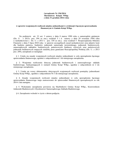 Zarządzenie Nr 196/2014 Burmistrza Książa Wlkp. z dnia 31 grudnia 2014 roku w sprawie wzajemnych rozliczeń między jednostkami w ewidencji i łącznym sprawozdaniu finansowym w Gminie Książ Wlkp. Na podstawie art. 33 ust. 3 ustawy z dnia 8 marca 1990 roku o samorządzie gminnym (Dz. U. z 2013r. poz. 594 ze zm.), rozdział 5 i 6 ustawy z dnia 29 września 1994 roku o rachunkowości ( Dz. U. z 2013 r. poz. 330 ze zm.), oraz rozdział 5 Rozporządzenia Ministra Finansów z dnia 5 lipca 2010 roku w sprawie szczególnych zasad rachunkowości oraz planów kont dla budżetu państwa, budżetów jednostek samorządu terytorialnego, jednostek budżetowych, samorządowych zakładów budżetowych, państwowych funduszy celowych oraz państwowych jednostek budżetowych mających siedzibę poza granicami Rzeczpospolitej Polskiej (Dz. U. z 2013 poz. 289), zarządzam co następuje: § 1. Ustala się zasady wzajemnych rozliczeń między jednostkami w celu sporządzenia łącznego sprawozdania finansowego, zgodnie z załącznikiem nr 1 do niniejszego zarządzenia. § 2. Wzajemne rozliczenia dotyczą jednostek budżetowych i samorządowego zakładu budżetowego, funkcjonujących w ramach Gminy Książ Wlkp., zgodnie z załącznikiem nr 2 do niniejszego zarządzenia. § 3. Ustala się wzory dokumentów dotyczących wzajemnych rozliczeń pomiędzy jednostkami Gminy Książ Wlkp., zgodnie z załącznikiem Nr 3 do niniejszego zarządzenia. § 4. Zasady wzajemnych rozliczeń między jednostkami w celu sporządzenia łącznego sprawozdania finansowego maja zastosowanie do sprawozdań finansowych sporządzonych za rok 2014 i lata następne. § 5. Wykonanie zarządzenia powierza się Skarbnikowi Gminy Książ Wlkp., Kierownikom Jednostek Budżetowych i Dyrektorowi Samorządowego Zakładu Budżetowego. § 6. Zarządzenie wchodzi w życie z dniem podjęcia. Załącznik Nr 1 do Zarządzenia Nr 196/2014 Burmistrza Książa Wlkp. z dnia 31 grudnia 2014 roku 1. Na dzień zamknięcia ksiąg rachunkowych jednostki budżetowe i samorządowy zakład budżetowy sporządzają sprawozdanie finansowe składające się z bilansu, rachunku zysków i strat ( wariant porównawczy) oraz zestawienie zmian w funduszu. 2. Gmina Książ Wlkp. sporządzając łączne sprawozdanie finansowe dokonuje odpowiednich wyłączeń wzajemnych rozliczeń między jednostkami funkcjonującymi w ramach jednostki samorządu terytorialnego. 3. Łączne sprawozdanie finansowe Gminy Książ Wlkp. jest sumą odpowiednich pozycji poszczególnych części sprawozdań finansowych jednostek budżetowych i samorządowego zakładu budżetowego pomniejszoną o kwoty wzajemnych rozliczeń (wyłączeń). 4. Do ewidencji kwot wynikających z wzajemnych rozliczeń między jednostkami w celu ich wyłączenia w trakcie sporządzania łącznego sprawozdania finansowego służy konto 976 – „ Wzajemne rozliczenia między jednostkami”. Na stronie Wn konta 976 należy ujmować: - wzajemne należności ( wyłączenia dotyczące aktywów bilansu), - koszty będące następstwem wzajemnych świadczeń między jednostkami objętymi łącznym rachunkiem zysków i strat, - zwiększenia w zestawieniu zmian w funduszu spowodowanych przekazaniem aktywów trwałych między jednostkami objętymi łącznym sprawozdaniem. Na stronie Ma konta 976 ujmuje się: - wzajemne zobowiązania ( wyłączenia dotyczące pasywów bilansu), - przychody będące następstwem wzajemnych świadczeń między jednostkami objętymi łącznym rachunkiem zysków i strat, - zmniejszenia w zestawieniu zmian w funduszu spowodowanych przekazaniem aktywów trwałych między jednostkami objętymi łącznym sprawozdaniem. 5. Dla sporządzenia łącznego sprawozdania finansowego potrzebny jest wykaz wzajemnych wyłączeń ( jak w załączniku nr 3 do niniejszego zarządzenia), dlatego wzajemne należności ewidencjonuje się na stronie Wn konta 976, a ich zapłatę na stronie Ma konta 976. Saldo tego konta będzie oznaczało stan należności podlegających wyłączeniu w sprawozdaniu łącznym. Analogicznie zasady obowiązują w stosunku do wzajemnych zobowiązań, przy czym zobowiązania ewidencjonuje się na stronie Ma konta 976, a ich zapłatę na stronie Wn konta 976. 6. Zasady prowadzenia ewidencji szczegółowej dla konta 976 „ Wzajemne rozliczenia między jednostkami „ ustalają kierownicy jednostek budżetowych i samorządowego zakładu budżetowego w polityce rachunkowości. 7. Jednostki dokonują uzgodnienia wzajemnych rozliczeń i w terminie do 31 marca roku następnego składają Skarbnikowi Gminy Książ Wlkp. arkusze wzajemnych wyłączeń. 8. Jednostki objęte łącznym sprawozdaniem finansowym wykazują w swoich sprawozdaniach jednostkowych dane wynikające z zapisów na koncie 976 „ Wzajemne rozliczenia między jednostkami „. Dane te należy zamieścić w informacjach uzupełniających odpowiednio do każdego z elementów sprawozdania. Załącznik Nr 2 do Zarządzenia Nr 196/2014 Burmistrza Książa Wlkp. z dnia 31 grudnia 2014 roku Wykaz jednostek zobowiązanych do prowadzenia ewidencji wzajemnych wyłączeń 1. Jednostki budżetowe: - Przedszkole w Książu Wlkp., - Ośrodek Pomocy Społecznej w Książu Wlkp., - Szkoła Podstawowa im. Wiosny Ludów w Książu Wlkp., - Szkoła Podstawowa im. E. Sczanieckiej w Konarzycach, - Szkoła Podstawowa im. Powstańców Wielkopolskich w Chwałkowie Kościelnym, - Gimnazjum w Książu wlkp., - Zespół Szkół im. Abp. A. Baraniaka w Mchach, - Urząd Miejski w Książu Wlkp. 2. Samorządowy Zakład Budżetowy: - Zakład Usług Komunalnych w Książu Wlkp. Załącznik Nr 3 do Zarządzenia Nr 196/2014 Burmistrza Książa Wlkp. z dnia 31 grudnia 2014 roku ……………………………………………… ( pieczątka jednostki sporządzającej arkusz) I. Arkusz wzajemnych rozliczeń z tytułu należności i zobowiązania – wyłącznie do bilansu Wykaz należności – stan na 31. 12…………….r. Lp. Nazwa i adres Tytuł Symbol 