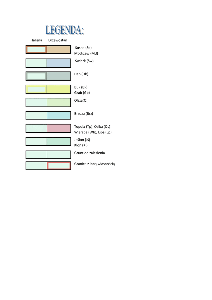 Halizna Drzewostan Sosna (So) Modrzew (Md) Świerk (Św) Dąb (Db) Buk (Bk) Grab (Gb) Olsza(Ol) Brzoza (Brz) Topola (Tp), Osika (Os) Wierzba (Wb), Lipa (Lp) Jeśion (Jś) Klon (Kl) Grunt do zalesienia Granica z inną własnością