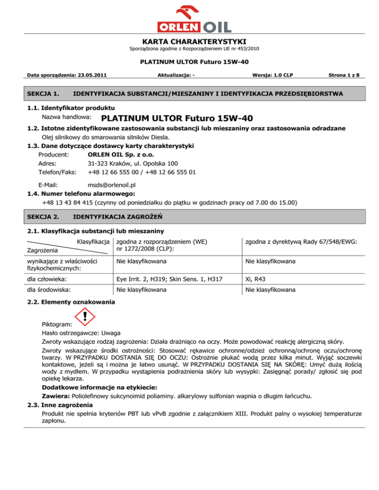 KARTA CHARAKTERYSTYKI Sporządzona zgodnie z Rozporządzeniem UE nr 453/2010 PLATINUM ULTOR Futuro 15W-40 Data sporządzenia: 23.05.2011 SEKCJA 1. Aktualizacja: - Wersja: 1.0 CLP Strona 1 z 8 IDENTYFIKACJA SUBSTANCJI/MIESZANINY I IDENTYFIKACJA PRZEDSIĘBIORSTWA 1.1. Identyfikator produktu Nazwa handlowa: PLATINUM ULTOR Futuro 15W-40 1.2. Istotne zidentyfikowane zastosowania substancji lub mieszaniny oraz zastosowania odradzane Olej silnikowy do smarowania silników Diesla. 1.3. Dane dotyczące dostawcy karty charakterystyki Producent: ORLEN OIL Sp. z o.o. Adres: 31-323 Kraków, ul. Opolska 100 Telefon/Faks: +48 12 66 555 00 / +48 12 66 555 01 E-Mail: [email protected] 1.4. Numer telefonu alarmowego: +48 13 43 84 415 (czynny od poniedziałku do piątku w godzinach pracy od 7.00 do 15.00) SEKCJA 2. IDENTYFIKACJA ZAGROŻEŃ 2.1. Klasyfikacja substancji lub mieszaniny Klasyfikacja zgodna z rozporządzeniem (WE) nr 1272/2008 (CLP): zgodna z dyrektywą Rady 67/548/EWG: wynikające z właściwości fizykochemicznych: Nie klasyfikowana Nie klasyfikowana dla człowieka: Eye Irrit. 2, H319; Skin Sens. 1, H317 Xi, R43 dla środowiska: Nie klasyfikowana Nie klasyfikowana Zagrożenia 2.2. Elementy oznakowania Piktogram: Hasło ostrzegawcze: Uwaga Zwroty wskazujące rodzaj zagrożenia: Działa drażniąco na oczy. Może powodować reakcję alergiczną skóry. Zwroty wskazujące środki ostrożności: Stosować rękawice ochronne/odzież ochronną/ochronę oczu/ochronę twarzy. W PRZYPADKU DOSTANIA SIĘ DO OCZU: Ostrożnie płukać wodą przez kilka minut. Wyjąć soczewki kontaktowe, jeżeli są i można je łatwo usunąć. W PRZYPADKU DOSTANIA SIĘ NA SKÓRĘ: Umyć dużą ilością wody z mydłem. W przypadku wystąpienia podrażnienia skóry lub wysypki: Zasięgnąć porady/ zgłosić się pod opiekę lekarza. Dodatkowe informacje na etykiecie: Zawiera: Poliolefinowy sukcynoimid poliaminy. alkarylowy sulfonian wapnia o długim łańcuchu. 2.3. Inne zagrożenia Produkt nie spełnia kryteriów PBT lub vPvB zgodnie z załącznikiem XIII. Produkt palny o wysokiej temperaturze zapłonu. KARTA CHARAKTERYSTYKI Sporządzona zgodnie z Rozporządzeniem UE nr 453/2010 PLATINUM ULTOR Futuro 15W-40 Data sporządzenia: 23.05.2011 SEKCJA 3. Aktualizacja: - Wersja: 1.0 CLP Strona 2 z 8 SKŁAD/INFORMACJA O SKŁADNIKACH Nazwa substancji Nr CAS / Nr WE % wag. Klasyfikacja wg 67/548/EWG Klasyfikacja wg 1272/2008 (CLP) Poliolefinowy sukcynoimid poliaminy - ≤ 1,6 Xi, R43 R53 Skin Sens. 1, H317; Aquatic Chronic 4, H413 Alkilowy ditiofosforan cynku 272-028-3 ≤ 1,2 Xi, R41 N, R51/53 Eye Dam. 1, H318; Aquatic Chronic 2, H411 Alkarylowy sulfonian wapnia o długim łańcuchu 300-298-5 ≤ 0,4 Xi, R43 R53 Skin Sens. 1, H317; Aquatic Chronic 4, H413 Olej bazowy niespecyfikowany 265-157-1 ~ 87 Nie klasyfikowany nota H i L Nie klasyfikowany, uwaga H i L SEKCJA 4. ŚRODKI PIERWSZEJ POMOCY 4.1. Opis środków pierwszej pomocy Wdychanie: Ze względu na niską zawartość składników lotnych olej w temperaturze otoczenia olej praktycznie nie zagrożenia inhalacyjnego. Ryzyko inhalacji istnieje tylko w przypadku utworzenia się mgły produktu lub też w wyniku jego ogrzania. Poszkodowanego usunąć (wyprowadzić/wynieść) z miejsca narażenia na świeże powietrze; zapewnić spokój i ciepło. Nieprzytomnego ułożyć w pozycji bocznej ustalonej, rozluźnić uciskające części ubrania; kontrolować i utrzymywać drożność dróg oddechowych. W przypadku zaburzeń w oddychaniu podawać tlen, w przypadku braku oddechu stosować sztuczne oddychanie. W przypadku utraty przytomności, zaburzeń oddychania lub utrzymującego się złego samopoczucia natychmiast zapewnić pomoc lekarską.. Kontakt ze skórą: Natychmiast zdjąć zanieczyszczoną/nasiąkniętą odzież i buty. Zanieczyszczoną skórę umyć dokładnie wodą z mydłem lub łagodnym detergentem, a następnie spłukać wodą. W przypadku wystąpienia i utrzymywania się objawów podrażnienia skonsultować się z lekarzem. UWAGA: Zanieczyszczoną odzież usunąć w bezpieczne miejsce z dala od źródeł ciepła i źródeł zapłonu. Kontakt z oczami: Zanieczyszczone oczy natychmiast płukać ciągłym strumieniem wody, usunąć szkła kontaktowe (jeśli są) i kontynuować płukanie przez ok. 15 minut. Podczas płukania trzymać powieki szeroko rozwarte. W przypadku wystąpienia i utrzymywania się dolegliwości skonsultować się z lekarzem. Połknięcie: Nie prowokować wymiotów. W przypadku wystąpienia samoistnych wymiotów trzymać poszkodowanego w pozycji nachylonej do przodu z twarzą skierowaną do ziemi. Zapewnić pomoc medyczną. 4.2. Najważniejsze ostre i opóźnione objawy oraz skutki narażenia Nie określono. 4.3. Wskazania dotyczące wszelkiej natychmiastowej pomocy lekarskiej i szczególnego postępowania z poszkodowanym Nie prowokować wymiotów i nie podawać niczego doustnie osobie nieprzytomnej. Pokazać kartę charakterystyki lub etykietę/opakowanie personelowi medycznemu udzielającemu pomocy. Osoby udzielające pomocy w obszarze o nieznanym stężeniu par/mgły powinny być wyposażone w odpowiednie ochrony dróg oddechowych. Wskazówki dla lekarza: leczenie objawowe. KARTA CHARAKTERYSTYKI Sporządzona zgodnie z Rozporządzeniem UE nr 453/2010 PLATINUM ULTOR Futuro 15W-40 Data sporządzenia: 23.05.2011 SEKCJA 5. Aktualizacja: - Wersja: 1.0 CLP Strona 3 z 8 POSTĘPOWANIE W PRZYPADKU POŻARU 5.1. Środki gaśnicze Odpowiednie środki gaśnicze: dwutlenek węgla, proszek gaśniczy, piana, rozpylona woda Niewłaściwe środki gaśnicze: zwarty strumień wody. 5.2. Szczególne zagrożenia związane z substancją lub mieszaniną Produkt palny o wysokiej temperaturze zapłonu. W środowisku pożaru powstają niebezpieczne gazy zawierające tlenki węgla, tlenki azotu, tlenki siarki i inne niezidentyfikowane produkty termicznego rozkładu wyższych węglowodorów. Unikać wdychania produktów uwalniających się w środowisku pożaru. 5.3. Informacje d