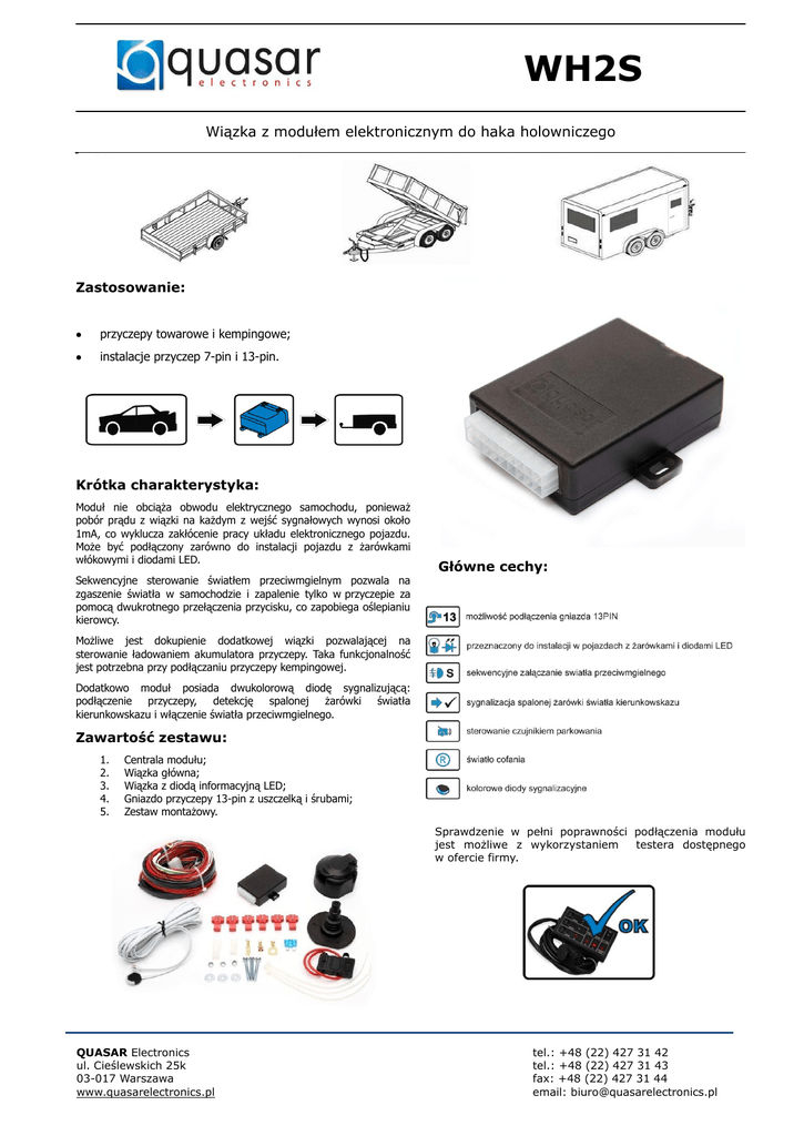 WH2S Wiązka z modułem elektronicznym do haka holowniczego Zastosowanie: przyczepy towarowe i kempingowe; instalacje przyczep 7-pin i 13-pin. Krótka charakterystyka: Moduł nie obciąża obwodu elektrycznego samochodu, ponieważ pobór prądu z wiązki na każdym z wejść sygnałowych wynosi około 1mA, co wyklucza zakłócenie pracy układu elektronicznego pojazdu. Może być podłączony zarówno do instalacji pojazdu z żarówkami włókowymi i diodami LED. Sekwencyjne sterowanie światłem przeciwmgielnym pozwala na zgaszenie światła w samochodzie i zapalenie tylko w przyczepie za pomocą dwukrotnego przełączenia przycisku, co zapobiega oślepianiu kierowcy. Główne cechy: Możliwe jest dokupienie dodatkowej wiązki pozwalającej na sterowanie ładowaniem akumulatora przyczepy. Taka funkcjonalność jest potrzebna przy podłączaniu przyczepy kempingowej. Dodatkowo moduł posiada dwukolorową diodę sygnalizującą: podłączenie przyczepy, detekcję spalonej żarówki światła kierunkowskazu i włączenie światła przeciwmgielnego. Zawartość zestawu: 1. 2. 3. 4. 5. Centrala modułu; Wiązka główna; Wiązka z diodą informacyjną LED; Gniazdo przyczepy 13-pin z uszczelką i śrubami; Zestaw montażowy. Sprawdzenie w pełni poprawności podłączenia modułu jest możliwe z wykorzystaniem testera dostępnego w ofercie firmy. QUASAR Electronics ul. Cieślewskich 25k 03-017 Warszawa www.quasarelectronics.pl tel.: +48 (22) 427 31 42 tel.: +48 (22) 427 31 43 fax: +48 (22) 427 31 44 email: [email protected]