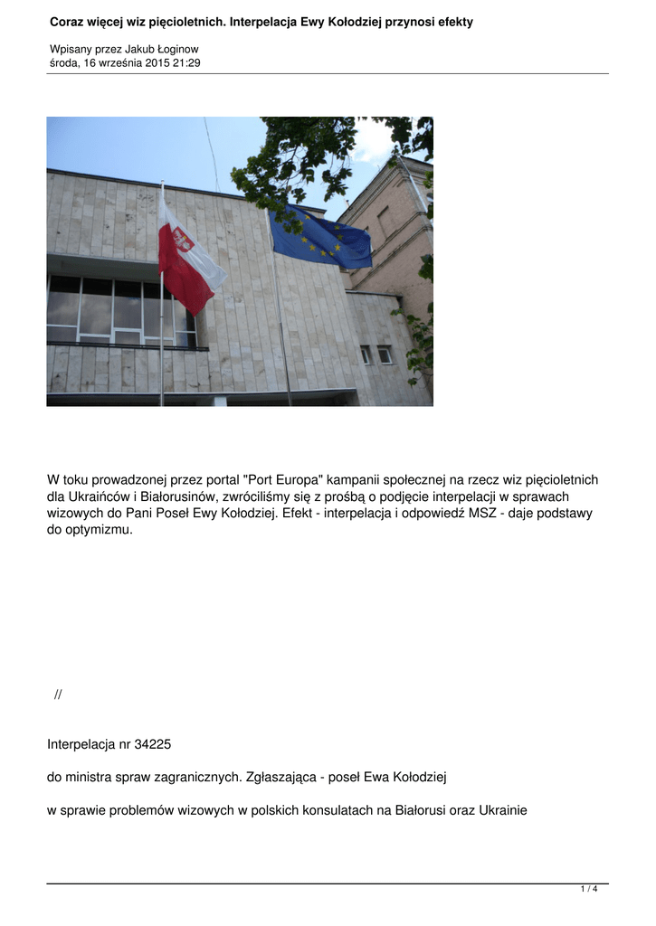 Coraz więcej wiz pięcioletnich. Interpelacja Ewy Kołodziej przynosi efekty Wpisany przez Jakub Łoginow środa, 16 września 2015 21:29 W toku prowadzonej przez portal "Port Europa" kampanii społecznej na rzecz wiz pięcioletnich dla Ukraińców i Białorusinów, zwróciliśmy się z prośbą o podjęcie interpelacji w sprawach wizowych do Pani Poseł Ewy Kołodziej. Efekt - interpelacja i odpowiedź MSZ - daje podstawy do optymizmu. // Interpelacja nr 34225 do ministra spraw zagranicznych. Zgłaszająca - poseł Ewa Kołodziej w sprawie problemów wizowych w polskich konsulatach na Białorusi oraz Ukrainie 1/4 Coraz więcej wiz pięcioletnich. Interpelacja Ewy Kołodziej przynosi efekty Wpisany przez Jakub Łoginow środa, 16 września 2015 21:29 Szanowny Panie Ministrze! Kontakty i współpraca z naszymi wschodnimi sąsiadami była i jest konieczna, a to z uwagi na nasze geopolityczne położenie. Wielu naszych rodaków utrzymuje silne kontakty handlowe ze swoimi partnerami z Ukrainy czy Białorusi. Podobnie jest w odwrotnym kierunku, z tym jednak utrudnieniem, że co pewien czas obywatel Ukrainy czy Białorusi zmuszony jest występować o kolejną wizę uprawniającą go do przekraczania granicy Polski. Liczne działania ministerstwa przyczyniły się do zwiększenia liczby wydawanych wiz, niemniej jednak problem nie znalazł szczęśliwego rozwiązania, albowiem jak wynika z informacji otrzymywanych od zainteresowanych uzyskanie wizy w dalszym ciągu jest znacząco utrudnione. Powodem zaistniałej sytuacji jest bardzo duża liczba chętnych, która powoduje ogromne kolejki w naszych konsulatach w Białorusi oraz Ukrainie. Występowanie problemów związanych z uzyskaniem wizy w sposób w pełni legalny powoduje występowanie procederów nielegalnych, takich jak nielegalne pośrednictwo wizowe czy blokowanie elektronicznego systemu e-konsulat przez hakerów. Rozwiązaniem na powyższy problem może być zmiana polityki wizowej prowadzonej przez konsulaty w Ukrainie oraz Białorusi, która obecnie polega na wydawaniu wiz krótkoterminowych, natomiast w przyszłości mogłaby przejawiać się częstszym wydawaniem wiz długoterminowych. Wielu Ukraińców oraz Białorusinów z uwagi na upływający termin ważności wizy, zmuszona jest ustawiać się ponownie w kolejce o nową wizę, przez co dodatkowo zwiększa się popyt na wizy uprawniające do wjazdu na teren RP oraz strefy Schengen. W tym miejscu należy podkreślić, że w przeszłości to między innymi Polska zabiegała o możliwość wydawania wiz długoterminowych, a w obecnej chwili niezmiernie rzadko korzysta z takiej możliwości. Istotnym jest, że Kodeks Wizowy Schengen uprawnia do tego, żeby obcokrajowcowi wydać wizę długoterminową, gdy na swoim koncie posiada on już od trzech do pięciu wiz Schengen w całej swojej historii. W związku z powyższym, zwracam się do Pana Ministra z uprzejmą prośbą o przedstawienie aktualnych danych dotyczących okresu ważności wiz wydawanych przez polskie konsulaty w Ukrainie oraz Białorusi. Proszę równocześnie o zaprezentowanie stanowiska Pańskiego resortu względem przedstawionej powyżej propozycji zmian, które zmierzałyby do częstszego wykorzystywania wiz długoterminowych. Czy resort prowadzi bądź zamierza prowadzić akcję informacyjną dla osób aplikujących o wizę oraz jakie należy spełnić kryteria, aby uzyskać wizę długoterminową, tj. w segmencie 2-5 lat? Odpowiedź na interpelację nr 34225 w sprawie problemów wizowych w polskich konsulatach na Białorusi oraz Ukrainie Odpowiadający: podsekretarz stanu w Ministerstwie Spraw Zagranicznych Henryka Mościcka-Dendys Warszawa, 14-09-2015 Szanowna Pani Marszałek, 2/4 Coraz więcej wiz pięcioletnich. Interpelacja Ewy Kołodziej przynosi efekty Wpisany przez Jakub Łoginow środa, 16 września 2015 21:29 Odpowiadając na interpelację Pani Poseł Ewy Kołodziej nr 34225 z dnia 26 sierpnia 2015 r. w sprawie problemów wizowych w polskich konsulatach na Białorusi oraz Ukrainie, uprzejmie informuję, że: Ministerstwo Spraw Zagranicznych prowadzi aktywną politykę liberalizacji wizowej chcąc umożliwić większą dostępność polskich wiz dla obywateli Ukrainy i Białorusi. Kierując się tymi zasadami polskie urzędy konsularne wydają m.in. więcej wiz wieloletnich, szeroko korzystając w przypadku Ukrainy – z możliwości określonych w przepisach art. 5 Umowy między Unią Europejską i Ukrainą o ułatwieniach w wydawaniu wiz, a także art. 24 Wspólnotowego Kodeksu Wizowego (WKW) - w przypadku Białorusi. Dla polskiej służby konsularnej jest to jeden z podstawowych priorytetów polityki wizowej wobec obywateli tych krajów. Mamy świadomość, że stałe zwiększanie liczby wydawanych wiz wieloletnich przyczynia się nie tylko do promowania Polski pod względem turystycznym, ekonomicznym i kulturalnym, ale również do zmniejszenia obciążenia administracyjnego urzędów konsularnych w tych krajach i w konsekwencji - lepszego zaspokojenia stale rosnącego popytu na wizy. Na przestrzeni ostatnich lat, polskie konsulaty – działając zgodnie z wytycznymi resortu spraw zagranicznych - prowadzą stałe szkolenia dla pracowników, działających w ramach outsourcingu wizowego w Punktach Przyjęć Wniosków Wizowych (PPWW), ukierunkowane na „wychwytywanie” osób spełniających, zgodnie z przywołanymi wyżej przepisami, wymogi dla otrzymania wizy wieloletniej, zamieszczają stosowne informacje na stronach internetowych i tablicach informacyjnych urzędów konsularnych oraz usługodawcy zewnętrznego. Ponadto przy okazji konferencji prasowych, narad z przedstawicielami branży turystycznej oraz spotkań roboczych konsulowie regularnie informują o możliwości i warunkach ubiegania się o wizy wieloletnie. Poczynając od 2013 r. polskie urzędy konsularne na Ukrainie i Białorusi - zgodnie z zaleceniami MSZ i w oparciu o zapisy art. 24 WKW - wdrożyły praktykę wydawania wiz z 2-letnim 
