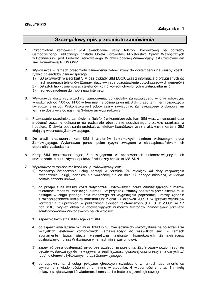 ZP/pp/N/1/15 Załącznik nr 1 Szczegółowy opis przedmiotu zamówienia 1. Przedmiotem zamówienia jest świadczenie usług telefonii komórkowej na potrzeby Samodzielnego Publicznego Zakładu Opieki Zdrowotnej Ministerstwa Spraw Wewnętrznych w Poznaniu im. prof. Ludwika Bierkowskiego. W chwili obecnej Zamawiający jest uŜytkownikiem sieci komórkowej PLUS GSM. 2. Wykonawca w ramach przedmiotu zamówienia zobowiązany do dostarczenia na własny koszt i ryzyko do siedziby Zamawiającego: 1) 60 aktywnych w sieci kart SIM bez blokady SIM LOCK wraz z informacją o przypisanych do nich numerach telefonów (Zamawiający wymaga pozostawienie dotychczasowych numerów) 2) 59 sztuk fabrycznie nowych telefonów komórkowych określonych w załączniku nr 3, 3) jednego modemu do mobilnego internetu. 3. Wykonawca dostarczy przedmiot zamówienia, do siedziby Zamawiającego w dniu roboczym, w godzinach od 7:00 do 14:00 w terminie nie późniejszym niŜ 6 dni przed terminem rozpoczęcia świadczenia usługi. Wykonawca jest zobowiązany zawiadomić Zamawiającego o planowanym terminie dostawy z co najmniej 3-dniowym wyprzedzeniem. 4. Przekazanie przedmiotu zamówienia (telefonów komórkowych, kart SIM wraz z numerami oraz modemu) zostanie dokonane na podstawie obustronnie podpisanego protokołu przekazania i odbioru. Z chwilą podpisania protokołów, telefony komórkowe wraz z aktywnymi kartami SIM stają się własnością Zamawiającego. 5. Do chwili przekazania kart SIM i telefonów komórkowych osobom wskazanym przez Zamawiającego, Wykonawca ponosi pełne ryzyko związane z niebezpieczeństwem ich utraty albo uszkodzenia 6. Karty SIM dostarczone będą Zamawiającemu w opakowaniach uniemoŜliwiających ich uszkodzenie, a na kaŜdym z opakowań widoczny będzie nr MSISDN. 7. Wykonawca w ramach realizacji usługi zobowiązany jest: 1) rozpocząć świadczenie usług nastąpi w terminie 24 miesięcy od daty rozpoczęcia świadczenia usługi, jednakŜe nie wcześniej niŜ od dnia 17 danego miesiąca, w którym została zawarta umowa, 2) do przejęcia na własny koszt dotychczas uŜytkowanych przez Zamawiającego numerów telefonów i modemu mobilnego internetu. W przypadku zmiany operatora przeniesienie musi nastąpić w ciągu jednego dnia roboczego od wygaśnięcia poprzedniej umowy zgodnie z rozporządzeniem Ministra Infrastruktury z dnia 17 czerwca 2009 r. w sprawie warunków korzystania z uprawnień w publicznych sieciach telefonicznych (Dz. U. z 2009r. nr 97 poz. 810). Wykaz aktualnie obowiązujących numerów telefonów Zamawiający przekaŜe zainteresowanym Wykonawcom na ich wniosek. 3) zapewnić bezpłatną aktywację kart SIM. 4) do zapewnienia łącznie minimum 8340 minut miesięcznie do wykorzystania na połączenia ze wszystkich telefonów komórkowych Zamawiającego do wszystkich sieci w ramach abonamentu (poza siecią wewnętrzną telefonów komórkowych Zamawiającego obsługiwanych przez Wykonawcę w ramach niniejszej umowy). 5) zapewnić pełną dostępność usług bez względu na porę dnia. Zaoferowany poziom sygnału będzie wystarczający do nawiązywania sesji łączności głosowej oraz przesyłania danych „z” i „do” telefonów uŜytkowanych przez Zamawiającego, 6) do zapewnienia, iŜ usługi połączeń głosowych świadczone w ramach abonamentu są wymienne z wiadomościami sms i mms w stosunku: 4 wiadomości sms za 1 minutę połączenia głosowego i 2 wiadomości mms za 1 minutę połączenia głosowego 7) do zapewnienia nielimitowanych bezpłatnych połączeń głosowych oraz wiadomości sms i mms pomiędzy kartami SIM Zamawiającego obsługiwanymi przez Wykonawcę w ramach zawartej umowy, 8) zapewnić taryfikację jednosekundową połączeń głosowych bez opłaty za inicjację połączenia (nie dotyczy połączeń międzynarodowych i roamingowych opłacanych wg aktualnego cennika Wykonawcy - który to naleŜy dołączyć do oferty), 9) zapewnić automatyczne, głosowe lub przez sms powiadamianie pracowników Zamawiającego o wysokości przydzielonego na karcie SIM miesięcznego pakietu minut, w chwili rozpoczęcia świadczenia usług, 10) zapewnić automatyczne, głosowe lub przez sms powiadamianie pracowników Zamawiającego o ilości wykorzystanych minut, zaoszczędzonych w poprzednich okresach rozliczeniowych zgodnie z przydzielonym pakietem minut a w przypadku jego przekroczenia oraz korzystania z usług dodatkowych o kwocie (dodatkowych kosztach) jaka zostanie doliczona do faktury, 11) zapewnić identyfikację numeru rozmówcy, 12) zapewnić blokowanie połączeń z numerami o podwyŜszonej płatności (standardowo włączone) 13) zapewnić blokowanie połączeń międzynarodowych (standardowo włączone), 14) zapewnić blokowanie wysyłania sms na serwisy płatne (standardowo włączone), 15) zapewnić blokowanie przychodzących sms reklamowych, 16) zapewnić blokowanie korzystania z WAP, Internet dla uŜytkowników (standardowo włączone). Aktywacja usług następowała będzie po uprzednim zamówieniu ich dla danego uŜytkownika, złoŜonym przez pracownika wskazanego przez Zamawiającego jako Administrator usług, 17) zapewnić blokowanie usługi roamingu dla danego uŜytkownika karty SIM, po uprzednim zamówieniu złoŜonym przez pracownika wskazanego przez Zamawiającego jako Administrator usług (standardowo włączone), 18) zapewnić moŜliwość czasowej blokady karty SIM w przypadku kradzieŜy lub zgubienia telefonu/karty przez danego uŜytkownika, 19) zapewnić bezpłatną aktywację duplikatu karty SIM w przypadku utraty dotychczas uŜytkowanej karty, która nastąpiła w wyniku kradzieŜy, zgubienia lub jej wady 20) zapewnić dodatkowo dostarczenie do siedziby Zamawiającego puli 5 szt. nieaktywnych kart SIM. Karty te będą bezpłatnie aktywowane (np. w przypadku kradzieŜy, zgubienia lub stwierdzenia wady karty SIM) po zgłoszeniu dokonanym przez pracownika wyznaczonego przez Zamawiającego jako Administrator usług. W przypadku wykorzyst