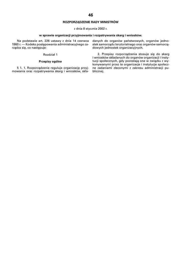 46 ROZPORZÑDZENIE RADY MINISTRÓW z dnia 8 stycznia 2002 r. w sprawie organizacji przyjmowania i rozpatrywania skarg i wniosków. Na podstawie art. 226 ustawy z dnia 14 czerwca 1960 r. — Kodeks post´powania administracyjnego zarzàdza si´, co nast´puje: danych do organów paƒstwowych, organów jednostek samorzàdu terytorialnego oraz organów samorzàdowych jednostek organizacyjnych. Rozdzia∏ 1 2. Przepisy rozporzàdzenia stosuje si´ do skarg i wniosków sk∏adanych do organów organizacji i instytucji spo∏ecznych, gdy pozostajà one w zwiàzku z wykonywanymi przez te organizacje i instytucje spo∏eczne zadaniami zleconymi z zakresu administracji publicznej. Przepisy ogólne § 1. 1. Rozporzàdzenie reguluje organizacj´ przyjmowania oraz rozpatrywania skarg i wniosków, sk∏a- Dziennik Ustaw Nr 5 — 222 — 3. Przepisy rozporzàdzenia stosuje si´ równie˝ do: 1) skarg i wniosków przekazanych w∏aÊciwym organom przez redakcje prasowe, radiowe i telewizyjne oraz organizacje i instytucje spo∏eczne, 2) materia∏ów prasowych i innych opublikowanych wiadomoÊci, je˝eli majà znamiona skargi lub wniosku i zosta∏y przes∏ane w∏aÊciwym organom przez redakcje prasowe, radiowe i telewizyjne. § 2. Skarg´ lub wniosek adresowane do w∏aÊciwego organu i przes∏ane w odpisie do innego organu rozpatruje i za∏atwia, w ramach swojej w∏aÊciwoÊci, organ, do którego by∏y adresowane. § 3. 1. Przyjmowanie i koordynowanie rozpatrywania skarg i wniosków powierza si´ wyodr´bnionej komórce organizacyjnej lub imiennie wyznaczonym pracownikom. 2. W siedzibie danej jednostki organizacyjnej, w widocznym miejscu, umieszcza si´ informacj´ wskazujàcà komórk´ organizacyjnà lub wyznaczonych pracowników przyjmujàcych oraz rozpatrujàcych skargi i wnioski. § 4. Organy paƒstwowe okreÊlone w art. 229 Kodeksu post´powania administracyjnego, przekazujàc w trybie art. 232 tego Kodeksu skarg´ do za∏atwienia w∏aÊciwemu organowi ni˝szego stopnia, mogà ˝àdaç od tego organu informacji o sposobie jej za∏atwienia. Rozdzia∏ 2 Przyjmowanie skarg i wniosków § 5. Skargi i wnioski mogà byç wnoszone pisemnie, telegraficznie lub za pomocà dalekopisu, telefaksu, poczty elektronicznej, a tak˝e ustnie do protoko∏u. § 6. 1. W razie zg∏oszenia skargi lub wniosku ustnie, przyjmujàcy zg∏oszenie sporzàdza protokó∏, który podpisujà wnoszàcy skarg´ lub wniosek i przyjmujàcy zg∏oszenie. 2. W protokole zamieszcza si´ dat´ przyj´cia skargi lub wniosku, imi´, nazwisko (nazw´) i adres zg∏aszajàcego oraz zwi´z∏y opis treÊci sprawy. § 7. Przyjmujàcy skargi i wnioski potwierdza z∏o˝enie skargi lub wniosku, je˝eli za˝àda tego wnoszàcy. Poz. 46 2. Je˝eli z treÊci skargi lub wniosku nie mo˝na nale˝ycie ustaliç ich przedmiotu, wzywa si´ wnoszàcego skarg´ lub wniosek do z∏o˝enia, w terminie siedmiu dni od dnia otrzymania wezwania, wyjaÊnienia lub uzupe∏nienia, z pouczeniem, ˝e nieusuni´cie tych braków spowoduje pozostawienie skargi lub wniosku bez rozpoznania. § 9. Je˝eli rozpatrzenie skargi lub wniosku wymaga uprzedniego zbadania i wyjaÊnienia sprawy, organ w∏aÊciwy do rozpatrzenia skargi lub wniosku zbiera niezb´dne materia∏y. W tym celu mo˝e zwróciç si´ do innych organów o przekazanie niezb´dnych materia∏ów i wyjaÊnieƒ. § 10. Je˝eli skarga lub wniosek dotyczy kilku spraw podlegajàcych rozpatrzeniu przez ró˝ne organy, organ, do którego wniesiono skarg´ lub wniosek, rozpatruje sprawy nale˝àce do jego w∏aÊciwoÊci, a pozosta∏e przekazuje niezw∏ocznie, nie póêniej jednak ni˝ w terminie siedmiu dni, w∏aÊciwym organom, przesy∏ajàc odpis skargi lub wniosku, i zawiadamia o tym równoczeÊnie wnoszàcego skarg´ lub wniosek. § 11. Skarga dotyczàca okreÊlonej osoby nie mo˝e byç przekazana do rozpatrzenia tej osobie ani osobie, wobec której pozostaje ona w stosunku nadrz´dnoÊci s∏u˝bowej. § 12. Organ rozpatrujàcy skarg´ lub wniosek mo˝e, na zasadach okreÊlonych w odr´bnych przepisach, wydaç polecenie lub podjàç inne stosowne Êrodki, w celu usuni´cia stwierdzonych uchybieƒ oraz przyczyn ich powstawania. § 13. W∏aÊciwy organ zawiadamia redakcj´ prasowà, radiowà lub telewizyjnà o wynikach rozpatrzenia sprawy stanowiàcej treÊç przes∏anego temu organowi przez redakcj´ materia∏u prasowego lub innej opublikowanej wiadomoÊci, majàcej znamiona skargi lub wniosku, a tak˝e dokonanych rozstrzygni´ciach, wydanych poleceniach lub podj´tych Êrodkach i dzia∏aniach. Rozdzia∏ 4 Przepis koƒcowy § 14. Rozporzàdzenie wchodzi w ˝ycie po up∏ywie 14 dni od dnia og∏oszenia. Rozdzia∏ 3 Rozpatrywanie skarg i wniosków § 8. 1. Skargi i wnioski niezawierajàce imienia i nazwiska (nazwy) oraz adresu wnoszàcego pozostawia si´ bez rozpoznania. Prezes Rady Ministrów: L. Miller