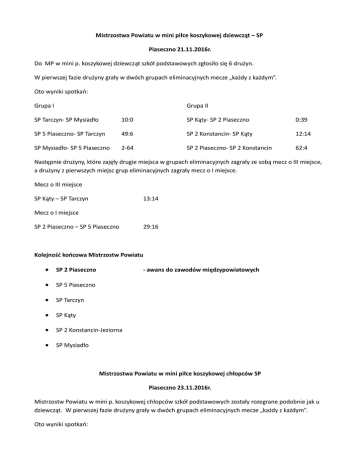Mistrzostwa Powiatu w mini piłce koszykowej dziewcząt – SP Piaseczno 21.11.2016r. Do MP w mini p. koszykowej dziewcząt szkół podstawowych zgłosiło się 6 drużyn. W pierwszej fazie drużyny grały w dwóch grupach eliminacyjnych mecze „każdy z każdym”. Oto wyniki spotkań: Grupa I Grupa II SP Tarczyn- SP Mysiadło 10:0 SP Kąty- SP 2 Piaseczno 0:39 SP 5 Piaseczno- SP Tarczyn 49:6 SP 2 Konstancin- SP Kąty 12:14 SP Mysiadło- SP 5 Piaseczno 2-64 SP 2 Piaseczno- SP 2 Konstancin 62:4 Następnie drużyny, które zajęły drugie miejsca w grupach eliminacyjnych zagrały ze sobą mecz o III miejsce, a drużyny z pierwszych miejsc grup eliminacyjnych zagrały mecz o I miejsce. Mecz o III miejsce SP Kąty – SP Tarczyn 13:14 Mecz o I miejsce SP 2 Piaseczno – SP 5 Piaseczno 29:16 Kolejność końcowa Mistrzostw Powiatu · SP 2 Piaseczno · SP 5 Piaseczno · SP Tarczyn · SP Kąty · SP 2 Konstancin-Jeziorna · SP Mysiadło - awans do zawodów międzypowiatowych Mistrzostwa Powiatu w mini piłce koszykowej chłopców SP Piaseczno 23.11.2016r. Mistrzostw Powiatu w mini p. koszykowej chłopców szkół podstawowych zostały rozegrane podobnie jak u dziewcząt. W pierwszej fazie drużyny grały w dwóch grupach eliminacyjnych mecze „każdy z każdym”. Oto wyniki spotkań: Grupa I Grupa II SP Uwieliny- SP Mysiadło 24:3 SP Głosków- SP Brześce 10:3 PSP 72 Piaseczno- SP Uwieliny 28:12 SP 1 Konstancin- SP Głosków 6:10 SP Mysiadło- PSP 72 Piaseczno 12:28 SP 2 Brześce- SP 1 Konstancin 7:22 Następnie drużyny, które zajęły drugie miejsca w grupach eliminacyjnych zagrały ze sobą mecz o III miejsce, a drużyny z pierwszych miejsc grup eliminacyjnych zagrały mecz o I miejsce. Mecz o III miejsce SP 1 Konstancin – SP Uwieliny 25:15 Mecz o I miejsce PSP 72 Piaseczno – SP Głosków 29:16 Kolejność końcowa Mistrzostw Powiatu · PSP 72 Piaseczno · SP Głosków · SP 1 Konstancin- Jeziorna · SP Uwieliny · SP Mysiadło · SP Brześce - awans do zawodów międzypowiatowych Mistrzostwa Powiatu w piłce koszykowej dziewcząt - gimnazja Piaseczno 24.11.2016r. Do Mistrzostw Powiatu w p. koszykowej dziewcząt szkół gimnazjalnych zgłosiło się 5 drużyn. Zabrakło drużyny z Gminy Konstancin- Jeziorna. W pierwszej fazie drużyny grały w dwóch grupach eliminacyjnych mecze „każdy z każdym”. Oto wyniki spotkań: Grupa I Grupa II Gim. Łazy- G 1 P-no 7:42 G 1 P-no- Gim. Cendrowice 54:4 Gim. Cendrowice- Gim. Łazy 2:8 G 4 Piaseczno- Gim. Prażmów 38:5 Następnie drużyny, które zajęły drugie miejsca w grupach eliminacyjnych zagrały ze sobą mecz o III miejsce, a drużyny z pierwszych miejsc grup eliminacyjnych zagrały mecz o I miejsce. Mecz o III miejsce Gim. Prażmów – Gim. Łazy 8:7 Mecz o I miejsce G 4 Piaseczno – G 1 Piaseczno 14:15 Kolejność końcowa Mistrzostw Powiatu · G 1 Piaseczno · G 4 Piaseczno · Gim. Prażmów · Gim. Łazy · Gim. Cendrowice - awans do zawodów międzypowiatowych Mistrzostwa Powiatu w piłce koszykowej chłopców - gimnazja Piaseczno 25.11.2016r. Mistrzostwa Powiatu zostały rozegrane trzy etapowo. Najpierw drużyny zagrały mecze eliminacyjne w dwóch grupach. Następnie rozegrano półfinały , w których zagrały drużyny według klucza- pierwsza drużyna z grupy A z drugą drużyną grupy B, a w drugim półfinale wystąpiły zespoły drugi z grupy A z pierwszą drużyną grupy B. Natomiast w finale zagrali zwycięzcy meczów półfinałowych, a drużyny przegrane zagrały mecz o III miejsce. Wyniki eliminacji grupa A Gim. Coniew – G 1 Piaseczno 4:51 Gim. Mysiadło – Gim. Coniew 10:4 G 1 Piaseczno – Gim. Mysiadło 38:1 Wyniki eliminacji grupa B Gim. Józefosław – G 4 Konstancin 22:13 Gim. Prażmów- Gim. Józefosław 11:24 G 4 Konstancin- Gim. Prażmów 11:15 Mecze półfinałowe Gim. Mysiadło – Gim. Józefosław 5:13 Gim. Prażmów- G 1 Piaseczno 6:40 Mecz o III miejsce Gim. Prażmów- Gim. Mysiadło 8:5 Mecz o I miejsce G 1 Piaseczno- Gim. Józefosław 52:10 Klasyfikacja końcowa Mistrzostw Powiatu · G 1 Piaseczno · Gim. Józefosław · Gim. Prażmów · Gim. Mysiadło · Gim. Coniew · G 4 Konstancin-Jeziorna - awans do zawodów międzypowiatowych Mistrzostwa Powiatu w piłce koszykowej dziewcząt - szkoły ponadgimnazjalne Piaseczno 28.11.2016r. Do zawodów zgłosiły się 4 drużyny. Mecze zostały rozegrane systemem „każdy z każdym” z zaliczeniem meczu z eliminacji gminnych( mecz pomiędzy dwiema drużynami, które awansowały do zawodów powiatowych) . Oto wyniki spotkań: ZS nr 2 Piaseczno- ZS Konstancin 20:12 LO Piaseczno- LO Góra Kalwaria 14:4 ZS Konstancin- LO Góra Kalwaria8:6 – wynik zaliczony z eliminacji gminnych LO Piaseczno- ZS nr 2 Piaseczno 21:16 - wynik zaliczony z eliminacji gminnych ZS Konstancin- LO Piaseczno 4:25 LO Góra Kalwaria- ZS nr2 Piaseczno 11:30 Kolejność końcowa Mistrzostw Powiatu · LO Piaseczno · ZS nr 2 Piaseczno · ZS Konstancin-Jeziorna · LO Góra Kalwaria Mistrzostwa Powiatu w piłce koszykowej chłopców- szkoły ponadgimnazjalne Piaseczno 30.11.2016r. Do zawodów zgłosiły się ta sama ilość drużyn – 4 . Mecze zostały rozegrane systemem „każdy z każdym” z zaliczeniem meczu z eliminacji gminnych( mecz pomiędzy dwiema drużynami, które awansowały do zawodów powiatowych) . Oto wyniki spotkań: LO Piaseczno- LO Góra Kalwaria 42:26 ZS nr 2 Piaseczno- LO Góra Kalwaria 8:18 LO Góra Kalwaria- ZS Konstancin16:6 - wynik zaliczony z eliminacji gminnych ZS Konstancin- ZS nr 2 Piaseczno 29:24 LO Piaseczno- ZS nr 2 Piaseczno 35:18 – wynik zaliczony z eliminacji gminnych ZS Konstancin- LO Piaseczno 24:34 Kolejność końcowa Mistrzostw Powiatu · LO Piaseczno · LO Góra Kalwaria · ZS Konstancin-Jeziorna · ZS nr 2 Piaseczno Sekretarz SZS Powiatu Piaseczyńskiego Marek Herbst
