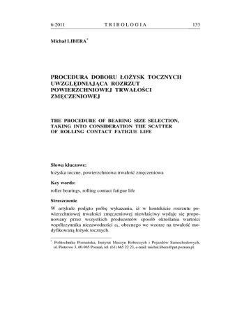 6-2011 TRIBOLOGIA 133 Michał LIBERA* PROCEDURA DOBORU ŁOŻYSK TOCZNYCH UWZGLĘDNIAJĄCA ROZRZUT POWIERZCHNIOWEJ TRWAŁOŚCI ZMĘCZENIOWEJ THE PROCEDURE OF BEARING SIZE SELECTION, TAKING INTO CONSIDERATION THE SCATTER OF ROLLING CONTACT FATIGUE LIFE Słowa kluczowe: łożyska toczne, powierzchniowa trwałość zmęczeniowa Key words: roller bearings, rolling contact fatigue life Streszczenie W artykule podjęto próbę wykazania, iż w kontekście rozrzutu powierzchniowej trwałości zmęczeniowej niewłaściwy wydaje się proponowany przez wszystkich producentów sposób określania wartości współczynnika niezawodności a1, obecnego we wzorze na trwałość modyfikowaną łożysk tocznych. * Politechnika Poznańska, Instytut Maszyn Roboczych i Pojazdów Samochodowych, ul. Piotrowo 3, 60-965 Poznań, tel. (61) 665 22 23, e-mail: [email protected]. 134 TRIBOLOGIA 6-2011 Zatem zaproponowano zmiany w procedurze obliczeniowej, mające na celu pełniejsze ujęcie zjawiska rozrzutu powierzchniowej trwałości zmęczeniowej i w konsekwencji zoptymalizowanie rozmiarów węzłów tocznych oraz większe wykorzystanie ich potencjału – co winno pociągnąć za sobą lepsze wykorzystanie surowców i nakładów pracy potrzebnych do produkcji elementów łożysk. WPROWADZENIE Obecna procedura doboru łożysk do węzłów tocznych maszyn, będąca efektem wieloletnich prac, doświadczenia producentów, konstruktorów i naukowców, wykazała się skutecznością w niezliczonych aplikacjach. Opiera się ona na założeniu, że węzły toczne tracą swą zdatność do dalszej eksploatacji na skutek cyklicznie zmiennych naprężeń, powstających w warstwie wierzchniej współpracujących elementów, a prowadzących do zmęczenia powierzchniowego i w efekcie do zużycia przez pitting lub spalling. Jednocześnie procedura ta w niewystarczającym stopniu uwzględnia fundamentalną cechę zjawiska zmęczenia powierzchniowego – mianowicie rozrzut powierzchniowej trwałości zmęczeniowej. OBECNA PROCEDURA DOBORU ŁOŻYSK TOCZNYCH Historia obliczania trwałości łożysk rozpoczęła się ponad 60 lat temu, kiedy Gustaf Lundberg z Instytutu Technologii Chalmers i Arvid Palmgren z firmy produkującej łożyska SKF AB zastosowali teorię prawdopodobieństwa Weibulla [L. 1, 2] dotyczącą zmęczenia materiału do wyznaczania trwałości łożysk tocznych. Ich fundamentalne prace z lat 1947–1951 [L. 3, 4] dotyczące wewnętrznego rozkładu naprężeń, obciążeń równoważnych i statystycznego rozkładu trwałości łożysk ukształtowały podstawy norm ANSI/ABMA i ISO opisujących trwałość łożysk i dały początek katalogom producentów łożysk tocznych. Pierwsza przyjęta przez ISO w 1962 roku metoda obliczania trwałości łożyska przedstawiona w normie ISO 281 [L. 5] (oraz w normach ABMA 9 i 11) jest reprezentowana przez równanie nominalnej trwałości: 6-2011 TRIBOLOGIA C L10 = P 135 p (1) gdzie: L10 C P p – – – – trwałość nominalna [mln obr.], nominalna nośność dynamiczna, równoważne obciążenie dynamiczne łożyska, wykładnik równania trwałości (p = 3 dla łożysk kulkowych i p = 10/3 dla łożysk wałeczkowych). Ponieważ trwałość pojedynczego łożyska może być przewidywana tylko statystycznie, obliczenia trwałości odnoszą się do całej populacji łożysk i założonego poziomu niezawodności. Trwałość nominalna L10 wyznacza teoretyczną trwałość, którą osiągnie 90% łożysk. Rozwój wiedzy o zjawisku zmęczenia powierzchniowego pociągnął za sobą konieczność nowelizacji normy ISO 281 i wprowadzenia równania trwałości zmodyfikowanej (2), uwzględniającego [L. 6]: – współczynnik niezawodności (w celu skorygowania trwałości dla zastosowań wymagających niezawodności większej niż 90%), – współczynnik korekcyjny uwzględniający warunki smarowania i zanieczyszczenie łożyska (ISO 4406), – granicę wytrzymałości zmęczeniowej materiału (wynikającą z modelu Ioanidesa i Harrisa [L. 7]). Lna = a1a ISO L10 (2) gdzie: Lna – trwałość nominalna dla niezawodności n% (trwałość modyfikowana), L10 – trwałość nominalna dla niezawodności 90%, a1 – współczynnik niezawodności (dla niezawodności 90%, a1 = 1), aISO – współczynnik modyfikacji trwałości wg producenta. Wszyscy producenci podobnymi równaniami wyrażają trwałość modyfikowaną, co przedstawiono w poniższej tabeli. Parametr a1 u wszystkich producentów jest współczynnikiem niezawodności, a tabela z jego wartościami jest taka sama we wszystkich katalogach (Tab. 2). Pozostałe współczynniki ujmują warunki smarowania, zanieczyszczenia, właściwości materiałowe itp. 136 TRIBOLOGIA 6-2011 Tabela 1. Równania trwałości modyfikowanej wg różnych producentów łożysk tocznych Table 1. Adjusted rating life equations for various manufacturers Producent SKF Complex Timken FAG KOYO NSK Równanie trwałości modyfikowanej Lna = a1 · a23 · L10 Lna = a1 · a23roz · L10 Lna = a1 · a2 · a3 · a4 · L10 Lna = a1 · a2311 · L10 Lna = a1 · a2 · a3 · L10 Lna = a1 · a23 · L10 Źródło [8] [9] [10] [11] [12] [13] Numer równania (3) (4) (5) (6) (7) (8) Tabela 2. Wartości współczynnik niezawodności a1 Table 2. Values of life adjustment factor a1 Niezawodność φ % Lna a1 90 L10a 1 95 L5a 0,62 96 L4a 0,53 97 L3a 0,44 98 L2a 0,33 99 L1a 0,21 W praktyce rzeczywista trwałość eksploatacyjna często znacznie różni się od obliczonej trwałości [L. 6, 14]. Punkty na Rys. 1, ilustrujące rzeczywiste trwałości łożysk, pozornie są dość bliskie krzywym obliczeniowym – jednak uwzględniając fakt, iż oś rzędnych ma skalę logarytmiczną, trzeba stwierdzić, że rzeczywiste wartości trwałości różnią się od obliczeniowych nawet kilkudziesięciokrotnie. Różnice te są naturalną konsekwencją rozrzutu trwałości, zatem warto go ująć w procedurze obliczeniowej. Rys. 1. Rzeczywiste trwałości łożysk na tle krzywych ilustruj
