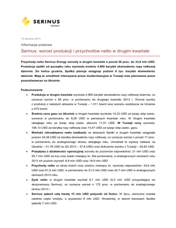 13 sierpnia 2014 Informacja prasowa Serinus: wzrost produkcji i przychodów netto w drugim kwartale Przychody netto Serinus Energy wzrosły w drugim kwartale o ponad 56 proc. do 33,6 mln USD. Produkcja spółki od początku roku wyniosła średnio 4.965 baryłek ekwiwalentu ropy naftowej dziennie. Do końca grudnia, Spółka planuje osiągnąć poziom 6 tys. baryłek ekwiwalentu dziennie. Mają to umożliwić intensywne prace modernizacyjne w Tunezji oraz planowane prace poszukiwawcze na Ukrainie. Podsumowanie Produkcja w drugim kwartale wyniosła 4.965 baryłek ekwiwalentu ropy naftowej dziennie, co oznacza wzrost o 56 proc. w porównaniu do drugiego kwartału 2013 r. Wzrost wynika z produkcji z nabytych aktywów w Tunezji – 1.311 boe/d oraz wzrostu wydobycia na Ukrainie o 475 boe/d. Średnia cena gazu na Ukrainie w drugim kwartale wyniosła 10,23 USD za tysiąc stóp sześc. surowca w porównaniu do 8,55 USD w pierwszym kwartale roku. W drugim kwartale ubiegłego roku za tysiąc stóp sześc. płacono 11,51 USD. W Tunezji ceny wynosiły: 108,13 USD za baryłkę ropy naftowej oraz 14,47 USD za tysiąc stóp sześc. gazu. Wartość retroaktywna netto (netback) na aktywach Spółki w drugim kwartale osiągnęła poziom 44,38 USD za baryłkę ekwiwalentu ropy naftowej, co oznacza wzrost o ponad 17 proc. w porównaniu do analogicznego okresu ubiegłego roku. Umożliwił to wyższy netback na Ukrainie – 41,76 USD (w Q2 2013 – 37,8 USD) oraz doliczenie wyniku z Tunezji – 54,83 USD. Przepływy z działalności operacyjnej wzrosły do poziomów odpowiednio: 21 mln USD oraz 35,7 mln USD za trzy oraz sześć miesięcy br. Dla porównania, w analogicznych okresach roku 2013 ich poziom wynosił: 8,9 mln USD oraz 18,9 mln USD. Przychody netto za okres trzech oraz sześciu miesięcy br. wyniosły odpowiednio: 33,6 mln USD oraz 61,5 mln USD, w porównaniu do 21,5 mln USD oraz 42,7 mln USD w analogicznych okresach 2013 roku. Zysk netto w drugim kwartale wyniósł 8,7 mln USD (5,3 mln USD przypadające na akcjonariuszy Serinus), co oznacza wzrost o 172 proc. w porównaniu do analogicznego okresu 2013 r. Serinus spłacił całą kwotę 15 mln USD pożyczki od Dutco. W lipcu, zwrócona została ostatnia część kredytu, o wysokości 8 mln USD. Wcześniej, w dwóch transzach Spółka spłaciła 7 mln USD. Rozpoczęte w czerwcu badania sejsmiczne 3D na terenie pola Sanrhar są ukończone w ok. 90 proc. W czerwcu produkcję rozpoczął odwiert M-17. Wynosi ona średnio 243,5 tys. m sześc. gazu dziennie od momentu podłączenia (169 tys. m sześc. netto dla Serinus). W lipcu rozpoczęto prace nad odwiertem Winstar-12bis. Ma on osiągnąć głębokość docelową 3.900 m w połowie września. Badania i testy zajmą około czterech tygodni. W Tunezji, z powodzeniem zmodernizowano odwiert CS Sil-1. Produkcja z niego osiągnęła poziom 40-50 baryłek ropy oraz 11-14 tys. m sześc. gazu dziennie. Nie udało się niestety skutecznie odnowić odwiertu CS Sil-10. Obydwa zostaną poddane analizom, mającym na celu odnalezienie dalszych możliwości zwiększenia wydobycia. Mając na uwadze bezpieczeństwo załogi oraz prowadzonych operacji, Spółka czasowo zawiesiła działania związane z zagospodarowaniem pól. Produkcja oraz sprzedaż gazu są kontynuowane. Spółka planuje wkrótce wznowić prace, ale niemożliwe jest w tym momencie określenie dokładnego terminu powrotu. „Pomimo czasowych utrudnień na Ukrainie, możemy uznać pierwsze półrocze 2014 r. za udane, szczególnie porównując je do ubiegłego roku. Ważnym wydarzeniem dla Spółki było podłączenie do produkcji odwiertu M-17, dzięki któremu produkcja na Ukrainie wynosi obecnie ponad 1,1 mln m sześc. gazu i 120 baryłek kondensatu dziennie. Obecnie ze szczególną ciekawością oczekujemy na pierwsze rezultaty prac na polu Sabria w Tunezji. Śledzimy również sytuację na Ukrainie i staramy się reagować na każdą istotną dla nas zmianę. Jednocześnie przygotowujemy się do ewentualnego powrotu do wykonywania nowych odwiertów, ze względu na znacznie lepsze warunki podatkowe określone w nowym prawie, które na razie ma obowiązywać do końca 2014 roku.” – powiedział Jakub Korczak, Wiceprezes ds. Relacji Inwestorskich i Dyrektor Operacji w Europie Środkowo-Wschodniej. Produkcja Całkowita produkcja Spółki wyniosła w drugim kwartale 2014 r. 4,965 baryłek ekwiwalentu ropy naftowej dziennie, co oznacza wzrost o 56 proc. w porównaniu do drugiego kwartału 2013 r., kiedy to wynik ten wyniósł 3,179 boe/d. Na wynik złożyła się produkcja na Ukrainie ponad 603 tys. m sześc. gazu i 102 baryłki kondensatu dziennie – oraz Tunezji – 1.310 baryłki ekwiwalentu ropy naftowej dziennie. Średnia produkcja Spółki w trzecim kwartale wynosi ok. 5,610 baryłek ekwiwalentu ropy naftowej dziennie. Wzrost jest efektem podłączenia odwiertu Makiejewskoje-17. Perspektywy Wydarzenia na Ukrainie zmusiły Serinus do weryfikacji planów zwiększenia wydobycia. Obecnie, planowany poziom produkcji na koniec roku wynosi 6 tys. baryłek ekwiwalentu ropy naftowej dziennie. Spółka zdefiniowała cztery miejsca potencjalnych kolejnych odwiertów na Ukrainie. Są to NM-4 (nad którym prace się rozpoczęły, ale ze względu na sytuację w kraju musiały zostać zawieszone), M-22, M-15 i M-18. Cztery odwierty planowo mają zostać poddane stymulacji: NM-3, O-11, O-15 oraz prawdopodobnie strefa S7 w odwiercie M-17. Prace w Tunezji i Rumunii kontynuowane będą zgodnie z wcześniejszym planem, a finansowane odpowiednio: ze środków z kredytu EBOR oraz bieżącego cash-flow.