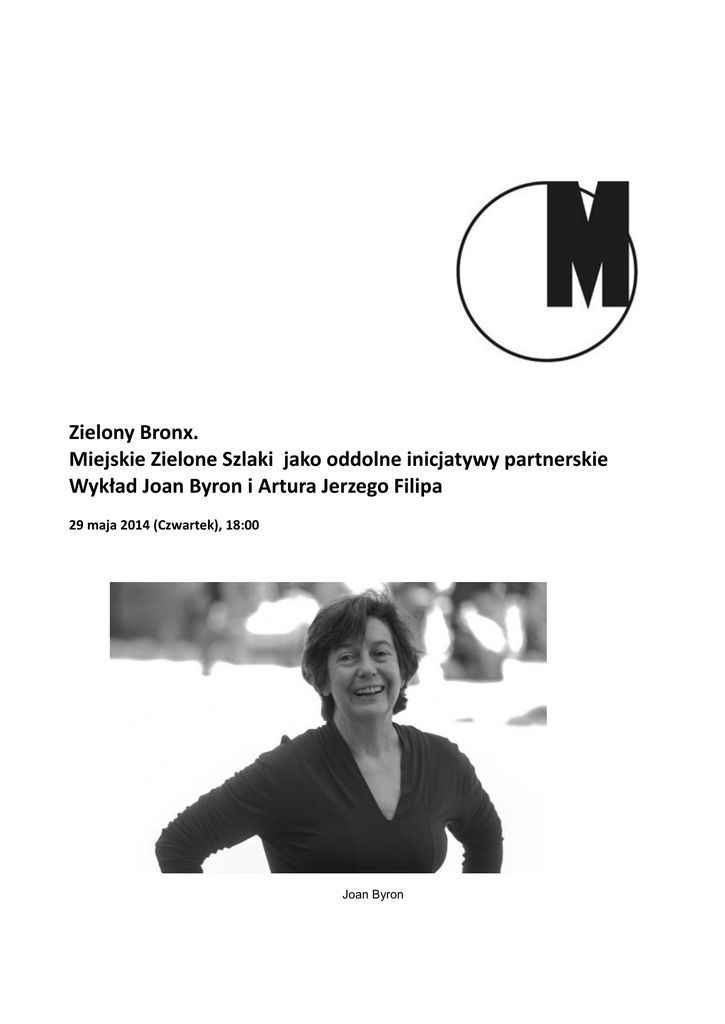 Zielony Bronx. Miejskie Zielone Szlaki jako oddolne inicjatywy partnerskie Wykład Joan Byron i Artura Jerzego Filipa 29 maja 2014 (Czwartek), 18:00 Joan Byron Nowy Jork jest jednym z najgwałtowniej zmieniających się miast świata. Chociaż sam Manhattan osiągnął już swoją słynną urbanistyczną formę w XX wieku, to jednak cały obszar miasta stale podlega przeobrażeniom. Przykładowo dzielnica Bronx, która od lat 70. powszechnie uznawana jest za symbol upadku miasta i za czarne getto, zmienia się obecnie nie do poznania. Bronx staje się dzisiaj coraz bardziej... zielony! Co więcej, kluczową rolę w tej przemianie odgrywają oddolne, obywatelskie inicjatywy. Jednym z najbardziej reprezentatywnych dla odrodzenia Bronxu projektów jest Zielony Szlak Rzeki Bronx. Ta koncepcja rewitalizacji Rzeki Bronx i stworzenia trzynastokilometrowego parkowego ciągu wzdłuż rzeki została zainicjowana przez lokalnych aktywistów i jest obecnie rozwijana przez organizację Bronx River Alliance – niezwykłe partnerstwo lokalnych oddolnych organizacji i biur miejskich. Projekt jest wspierany przez nowojorską instytucję akademicką Pratt Center for Community Development. Nasz gość specjalny, Joan Byron, urbanistka pracująca dla Pratt Center, zaangażowana jest w prace na rzecz kilku projektów w dzielnicy Bronx, między innymi w rozwój Zielonego Szlaku. Podczas spotkania opowie o tych projektach i podzieli się swoimi praktycznymi doświadczeniami. Joan Byron jest architektką i urbanistką kierującą w Pratt Center badaniami i pracą na rzecz wzmacniania społecznej, ekonomicznej i środowiskowej sprawiedliwości w mieście Nowy Jork. Do jej ostatnich działań należą: projekty usuwania skutków zniszczeń huraganu Sandy, wspieranie koalicji na rzecz parku Flushing Meadows Corona, działania na rzecz rozwoju komunikacji publicznej, wsparcie partnerstwa Bronx River Alliance, oraz kampania mająca na celu zastąpienie 2-kilometrowego odcinka trasy szybkiego ruchu Sheridan zabudową mieszkaniową i otwartymi terenami publicznymi. Artur Jerzy Filip jest architektem i urbanistą zaangażowanym w działania społeczne na rzecz projektów obywatelskich, takich jak Kwartał Muzyczny czy Warszawska Droga Kultury na Skarpie. Drugi z tych projektów rozwijał w ramach stypendiów przyznanych przez Miasto st. Warszawa (2012, 2013) oraz Ministerstwo Kultury i Dziedzictwa Narodowego (2011). Obecnie przygotowuje rozprawę doktorską, w ramach której bada amerykańskie przykłady oddolnie inicjowanych partnerstw na rzecz realizacji wielkoprzestrzennych założeń urbanistycznych. Pratt Center for Community Development To organizacja założona przez pracowników uniwersytetu Pratt Institute w 1963 roku, jest najstarszym amerykańskim instytutem uniwersyteckim wspierającym działania oddolne na rzecz planowania. Przez 50 lat Pratt Center działało partnersko z organizacjami społecznymi, przedsiębiorcami i decydentami na rzecz bardziej zrównoważonego i sprawiedliwego miasta Nowy Jork. Cykl Wspólna sprawa i architektura Wykład Joan Byron Artur Jerzy Filip Miejsce Muzeum Sztuki Nowoczesnej w Warszawie ul. Emilii Plater 51, Warszawa Więcej informacji: artmuseum.pl/pl/wydarzenia/bronx-kontra-drwale-tereny-zielone-w-usa-i-w-polscezarzadzane/3