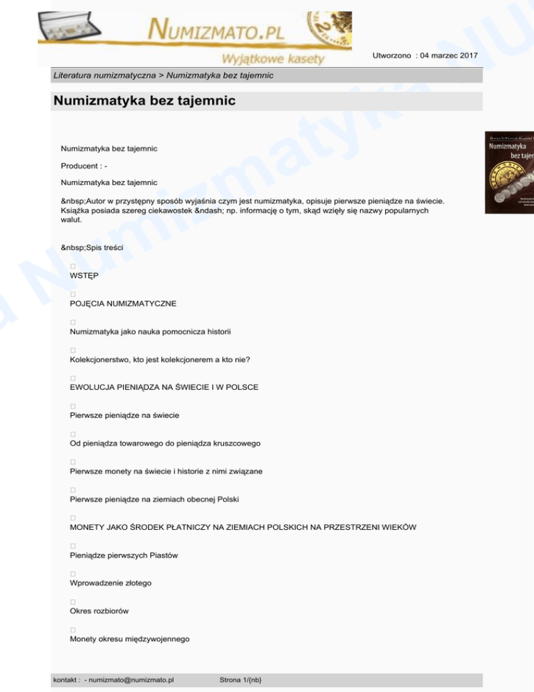U N Utworzono : 04 marzec 2017 a k Literatura numizmatyczna > Numizmatyka bez tajemnic y t a Numizmatyka bez tajemnic Numizmatyka bez tajemnic m z i m u Producent : - Numizmatyka bez tajemnic Autor w przystępny sposób wyjaśnia czym jest numizmatyka, opisuje pierwsze pieniądze na świecie. Książka posiada szereg ciekawostek – np. informację o tym, skąd wzięły się nazwy popularnych walut. Spis treści N a � WSTĘP � POJĘCIA NUMIZMATYCZNE � Numizmatyka jako nauka pomocnicza historii � Kolekcjonerstwo, kto jest kolekcjonerem a kto nie? � EWOLUCJA PIENIĄDZA NA ŚWIECIE I W POLSCE � Pierwsze pieniądze na świecie � Od pieniądza towarowego do pieniądza kruszcowego � Pierwsze monety na świecie i historie z nimi związane � Pierwsze pieniądze na ziemiach obecnej Polski � MONETY JAKO ŚRODEK PŁATNICZY NA ZIEMIACH POLSKICH NA PRZESTRZENI WIEKÓW � Pieniądze pierwszych Piastów � Wprowadzenie złotego � Okres rozbiorów � Monety okresu międzywojennego kontakt : - [email protected] Strona 1/{nb} Model : - U N Utworzono : 04 marzec 2017 a k Literatura numizmatyczna > Numizmatyka bez tajemnic y t a Numizmatyka bez tajemnic � Czasy najnowsze m z i m u � Monety kolekcjonerskie � Dukaty lokalne � POLSKIE MONETY KOLEKCJONERSKIE PO ROKU 1995 N a � Monety dwuzłotowe � Monety srebrne � Srebrne dziesięciozłotówki � Srebrne dwudziestozłotówki � Złote monety kolekcjonerskie � Monety Bulionowe z serii Orzeł Bielik � Monety stuzłotowe � Monety kolekcjonerskie dwustuzłotowe � CIEKAWE MUZEA, AUKCJE I WYDARZENIA NUMIZMATYCZNE � Aukcje stacjonarne � Muzea � OD CZEGO WZIEŁY NAZWĘ POPULARNE WALUTY � Od Talara do Dolara � Talar niemiecki kontakt : - [email protected] Strona 2/{nb} U N Utworzono : 04 marzec 2017 a k Literatura numizmatyczna > Numizmatyka bez tajemnic y t a Numizmatyka bez tajemnic � Funt angielski m z i m u � Frank francuski � SKALE RZADKOŚCI MONET � 10 stopniowa skala rzadkości Edmunda Kopickiego � Skala rzadkości monet rzymskich RIC N a � PSUCIE I FAŁSZOWANIE WALUTY � Psucie waluty � Szelągi Jana Kazimierza w wydaniu T.L. Boratiniego, czyli popularne boratynki � Pieniądz gorszy wypycha lepszy czyli prawo Kopernika- Greshama � Słynny polski fałszerz Józef Majnert � DOMINACJE WALUTY I UNIE MONETARNE � TREASURE HUNTING, CZYLI ŁOWCY SKARBÓW PO POLSKU � Prawo a poszukiwania � Co można znaleźć wykrywaczem metali � Szukanie monet � Jakie monety można znaleźć wykrywaczem metalu? � Gdzie szukają poszukiwacze? � Młyny, karczmy i wiatraki � kontakt : - [email protected] Strona 3/{nb} U N Utworzono : 04 marzec 2017 a k Literatura numizmatyczna > Numizmatyka bez tajemnic y t a Numizmatyka bez tajemnic Woda i dojścia do wody m z i m u � Czy poszukiwacze mają wpływ na rynek monet ( rzadkość monet ) � Na koniec o poszukiwaniach � SKARBY MONET � Skarb ze Środy Śląskiej N a � Skarb z Słuszkowa k/Kalisza � Skarb monet z Kotowic � DLACZEGO NUMIZMATYKA MOŻE BYĆ PASJĄ? � Banknoty � Jak kolekcjonować monety czyli od czego zacząć? � OKREŚLANIE STANU ZACHOWANIA MONET I CORAZ BARDZIEJ POPULARNY GRADING � Skale ocen stanu zachowania � Skala Sheldona � CZYSZCZENIE I KONSERWACJA MONET � Co to jest patyna? � Sposoby czyszczenia monet � PRZECHOWYWANIE NUMIZMATÓW � Klasery � Woreczki strunowe kontakt : - [email protected] Strona 4/{nb} U N Utworzono : 04 marzec 2017 a k Literatura numizmatyczna > Numizmatyka bez tajemnic y t a Numizmatyka bez tajemnic � Holdery m z i m u � Kapsle, czyli plastikowe kapsuły na monety � Palety, kasety � Pudełka gradingowe N a � Inne sposoby � KATALOGI MONET I EWIDENCJA NASZEJ KOLEKCJI � Ewidencja kolekcji � Wycena monet � WYMIANA DUBLETÓW, KUPNO I SPRZEDAŻ MONET, PRZYGOTOWANIE AUKCJI � Na co warto zwracać uwagę przy sprzedawaniu na aukcjach internetowych? � Gdzie kupować, jak wyglądają kwestie związane z wysyłką? � Jak wygrać aukcje, jeżeli kończy się ona w czasie, gdy nie możemy być przy komputerze? � Jak zrobić dobre zdjęcia monet? � INWESTOWANIE W MONETY, CZYLI JAK POŁĄCZYĆ PASJĘ Z MOŻLIWOŚCIĄ OSZCZĘDZANIA! � Zacznijmy od początku – oszczędzanie i inwestowanie � Zysk mimo woli � PRZYKŁADY INWESTYCYJNE � Monety kolekcjonerskie kontakt : - [email protected] Strona 5/{nb} U N Utworzono : 04 marzec 2017 a k Literatura numizmatyczna > Numizmatyka bez tajemnic y t a Numizmatyka bez tajemnic � Monety dwudziestolecia międzywojennego ( II RP ) m z i m u � PODSTAWOWE INFORMACJE PRZYDATNE PRZY INWESTOWANIU � Ceny kruszcu a ceny monet � Nakłady a ceny monet � Czym moneta starsza tym droższa N a � Sezonowość, kiedy kupić i kiedy sprzedać? � Stany zachowania, co kupować a czego nie � „Cudowne okazje”, i „nieprzeciętne rarytasy” � Ceny monet w przyszłości � SŁOWNICZEK POJĘĆ � WAŻNIEJSZE SKRÓTY � BIBLIOGRAFIA Wymiary: 145 x 210 mm Ilość stron: 165 Wydanie: I Cena : 43,00 zł Brutto ( 43,00 zł Netto) Dostępność: Produkt dostępny w naszym sklepie od 19 styczeń 2012 kontakt : - [email protected] Strona 6/{nb}