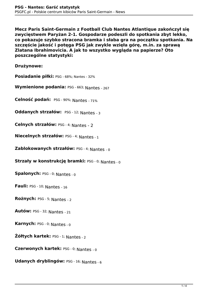 PSG - Nantes: Garść statystyk PSGFC.pl - Polskie centrum kibiców Paris Saint-Germain - News Mecz Paris Saint-Germain z Football Club Nantes Atlantique zakończył się zwycięstwem Paryżan 2-1. Gospodarze podeszli do spotkania zbyt lekko, co pokazuje szybko stracona bramka i słaba gra na początku spotkania. Na szczęście jakość i potęga PSG jak zwykle wzięła górę, m.in. za sprawą Zlatana Ibrahimovicia. A jak to wszystko wygląda na papierze? Oto poszczególne statystyki: Drużynowe: Posiadanie piłki: PSG - 68%; Nantes - 32% Wymienione podania: Celność podań: PSG - 663; PSG - 90%; Oddanych strzałów: Celnych strzałów: Nantes PSG - 12; PSG - 4; Niecelnych strzałów: Nantes Nantes PSG - 4; Fauli: PSG - 10; Rożnych: PSG - 4; Autów: PSG - 32; Karnych: PSG - 0; -0 Nantes - 0 - 16 Nantes Nantes PSG - 0; Nantes Nantes - 0 Nantes PSG - 5; -3 Nantes - 1 Strzały w konstrukcję bramki: PSG - 0; - 71% Nantes - 2 Zablokowanych strzałów: Spalonych: - 267 -2 - 21 Nantes - 0 Żółtych kartek: PSG - 1; Czerwonych kartek: Nantes - 2 PSG - 0; Udanych dryblingów: Nantes PSG - 16; -0 Nantes - 6 1/4 PSG - Nantes: Garść statystyk PSGFC.pl - Polskie centrum kibiców Paris Saint-Germain - News Udanych odbiorów: PSG - 14; Nantes - 36 Indywidualne: Najwięcej strzałów: Adrien Rabiot -3 Najwięcej strzałów celnych: Zlatan Ibrahimović - 2 Najwięcej podań: Adrien Rabiot - 79 Najlepsza skuteczność podań: Adrien Rabiot - 79 podań, 94% celność Najwięcej kontaktów z piłką: Adrien Rabiot - 94 Najwięcej kluczowych podań: Ex aequo Adrien Rabiot, Serge Aurier, Javier Pastore, Zlatan Ibrahimović - 2 Najwięcej udanych dryblingów: Lucas Moura - 4 Najwięcej dośrodkowań: Serge Aurier - 10 Najwięcej celnych dośrodkowań: Ex aequo Serge Aurier, Ezequiel Lavezzi - 2 2/4 PSG - Nantes: Garść statystyk PSGFC.pl - Polskie centrum kibiców Paris Saint-Germain - News Najwięcej długich piłek: Rémy Riou - 20 Najwięcej celnych długich podań: Ex aequo Marquinhos, Thiago Silva - 5 Najwięcej podań prostopadłych: Zlatan Ibrahimović - 2 Najwięcej celnych podań prostopadłych: Ex aequo Lucas Moura, Alejandro Bedoya - 1 Najwięcej odbiorów: Georges-Kévin Nkoudou Mbida - 8 Najwięcej przechwytów: Ex aequo Marquinhos, Olivier Veigneau - 9 3/4 PSG - Nantes: Garść statystyk PSGFC.pl - Polskie centrum kibiców Paris Saint-Germain - News Najwięcej fauli: Ex aequo Maco Verratti, Jordan Veretout - 3 Najbardziej faulowany: Ex aequo Ezequiel Lavezzi, Georges-Kévin Nkoudou Mbida - 3 Najwięcej spalonych: Brak spalonych w meczu Autor: Próżnia 4/4 Powered by TCPDF (www.tcpdf.org)