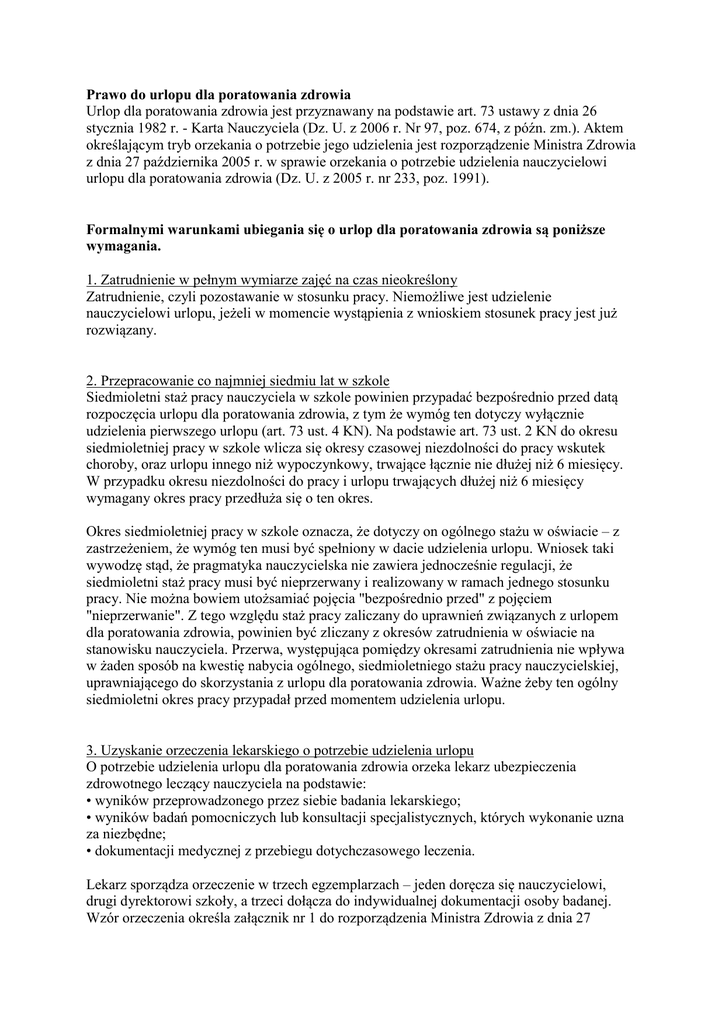 Prawo do urlopu dla poratowania zdrowia Urlop dla poratowania zdrowia jest przyznawany na podstawie art. 73 ustawy z dnia 26 stycznia 1982 r. - Karta Nauczyciela (Dz. U. z 2006 r. Nr 97, poz. 674, z późn. zm.). Aktem określającym tryb orzekania o potrzebie jego udzielenia jest rozporządzenie Ministra Zdrowia z dnia 27 października 2005 r. w sprawie orzekania o potrzebie udzielenia nauczycielowi urlopu dla poratowania zdrowia (Dz. U. z 2005 r. nr 233, poz. 1991). Formalnymi warunkami ubiegania się o urlop dla poratowania zdrowia są poniższe wymagania. 1. Zatrudnienie w pełnym wymiarze zajęć na czas nieokreślony Zatrudnienie, czyli pozostawanie w stosunku pracy. Niemożliwe jest udzielenie nauczycielowi urlopu, jeżeli w momencie wystąpienia z wnioskiem stosunek pracy jest już rozwiązany. 2. Przepracowanie co najmniej siedmiu lat w szkole Siedmioletni staż pracy nauczyciela w szkole powinien przypadać bezpośrednio przed datą rozpoczęcia urlopu dla poratowania zdrowia, z tym że wymóg ten dotyczy wyłącznie udzielenia pierwszego urlopu (art. 73 ust. 4 KN). Na podstawie art. 73 ust. 2 KN do okresu siedmioletniej pracy w szkole wlicza się okresy czasowej niezdolności do pracy wskutek choroby, oraz urlopu innego niż wypoczynkowy, trwające łącznie nie dłużej niż 6 miesięcy. W przypadku okresu niezdolności do pracy i urlopu trwających dłużej niż 6 miesięcy wymagany okres pracy przedłuża się o ten okres. Okres siedmioletniej pracy w szkole oznacza, że dotyczy on ogólnego stażu w oświacie – z zastrzeżeniem, że wymóg ten musi być spełniony w dacie udzielenia urlopu. Wniosek taki wywodzę stąd, że pragmatyka nauczycielska nie zawiera jednocześnie regulacji, że siedmioletni staż pracy musi być nieprzerwany i realizowany w ramach jednego stosunku pracy. Nie można bowiem utożsamiać pojęcia "bezpośrednio przed" z pojęciem "nieprzerwanie". Z tego względu staż pracy zaliczany do uprawnień związanych z urlopem dla poratowania zdrowia, powinien być zliczany z okresów zatrudnienia w oświacie na stanowisku nauczyciela. Przerwa, występująca pomiędzy okresami zatrudnienia nie wpływa w żaden sposób na kwestię nabycia ogólnego, siedmioletniego stażu pracy nauczycielskiej, uprawniającego do skorzystania z urlopu dla poratowania zdrowia. Ważne żeby ten ogólny siedmioletni okres pracy przypadał przed momentem udzielenia urlopu. 3. Uzyskanie orzeczenia lekarskiego o potrzebie udzielenia urlopu O potrzebie udzielenia urlopu dla poratowania zdrowia orzeka lekarz ubezpieczenia zdrowotnego leczący nauczyciela na podstawie: • wyników przeprowadzonego przez siebie badania lekarskiego; • wyników badań pomocniczych lub konsultacji specjalistycznych, których wykonanie uzna za niezbędne; • dokumentacji medycznej z przebiegu dotychczasowego leczenia. Lekarz sporządza orzeczenie w trzech egzemplarzach – jeden doręcza się nauczycielowi, drugi dyrektorowi szkoły, a trzeci dołącza do indywidualnej dokumentacji osoby badanej. Wzór orzeczenia określa załącznik nr 1 do rozporządzenia Ministra Zdrowia z dnia 27 października 2005 r. w sprawie orzekania o potrzebie udzielenia nauczycielowi urlopu dla poratowania zdrowia (Dz. U. z 2005 r. Nr 233, poz. 1991). Zarówno nauczyciel, jak i dyrektor szkoły mogą w terminie 14 dni od dnia otrzymania orzeczenia wnieść odwołanie od jego treści wraz z uzasadnieniem. Odwołanie wnosi się za pośrednictwem lekarza, który wydał orzeczenie, do organu odwoławczego, którym jest wojewódzki ośrodek medycyny pracy właściwy ze względu na miejsce wydania orzeczenia (informacja ta powinna znajdować się na druku orzeczenia). Lekarz, za pośrednictwem którego jest wnoszone odwołanie, ma obowiązek przekazać je w terminie 14 dni od dnia jego wniesienia do właściwego organu odwoławczego wraz z kopią dokumentacji medycznej stanowiącą podstawę wydania orzeczenia. Orzeczenie wydane w trybie odwoławczym jest ostateczne. Nie przysługują już od niego żadne środki odwoławcze. Wzór orzeczenia wydanego w trybie odwoławczym określa załącznik nr 2 do ww rozporządzenia Ministra Zdrowia z dnia 27 października 2005 r. Nauczyciel nie ponosi kosztów związanych z orzekaniem o stanie jego zdrowia w związku z potrzebą udzielenia urlopu. W przypadku niespełnienia nawet jednego warunku, nie ma podstaw do udzielenia takiego urlopu, nawet jeśli lekarz wydał odpowiednie zaświadczenie. Warunki te powinny być spełnione w chwili udzielania nauczycielowi urlopu – w dniu złożenia wniosku i w chwili ewentualnego rozpoczęcia korzystania z tego urlopu. Udzielanie urlopu dla poratowania zdrowia Nauczycielowi urlopu dla poratowania zdrowia udziela dyrektor. Po otrzymaniu właściwego zaświadczenia lekarskiego i zbadaniu pozostałych wymogów formalnych dyrektor zobligowany jest do udzielenia urlopu w możliwie szybkim terminie i na okres określony w orzeczeniu lekarskim. Dyrektor może zadecydować jedynie o przesunięciu terminu rozpoczęcia urlopu, gdyby miało dojść do zaburzenia prawidłowego funkcjonowania szkoły. Jeżeli dyrektor kwestionuje długość urlopu wskazaną przez lekarza, może się odwołać od orzeczenia lekarskiego. Jedyny przypadek, w którym dyrektor może skrócić urlop nauczyciela, ma miejsce wtedy, kiedy nauczycielowi brakuje mniej niż rok do nabycia prawa do emerytury. Wtedy dyrektor udziela urlopu na okres nie dłuższy niż do końca miesiąca poprzedzającego miesiąc, w którym nauczyciel nabywa uprawnienia emerytalne. Dyrektor szkoły odwołuje nauczyciela z urlopu dla poratowania zdrowia, gdy ten: • nawiązuje inny stosunek pracy lub go kontynuuje w innej szkole; • podejmuje inną działalność zarobkową lub ją kontynuuje. Jeśli nauczyciel narusza zakaz nawiązania stosunku pracy lub podejmowania innej działalności zarobkowej w okresie urlopu – dyrektor szkoły odwołuje go z urlopu, określając termin, w którym obowiązany jest 
