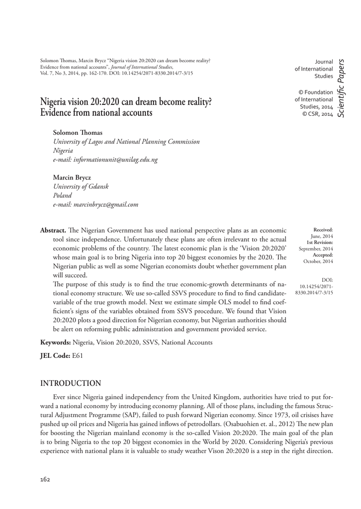 Nigeria vision 20:2020 can dream become reality? Evidence from national accounts Journal of International Studies © Foundation of International Studies, 2014 © CSR, 2014 Solomon Thomas University of Lagos and National Planning Commission Nigeria e-mail: [email protected] Marcin Brycz University of Gdansk Poland e-mail: [email protected] Abstract. The Nigerian Government has used national perspective plans as an economic tool since independence. Unfortunately these plans are often irrelevant to the actual economic problems of the country. The latest economic plan is the ‘Vision 20:2020’ whose main goal is to bring Nigeria into top 20 biggest economies by the 2020. The Nigerian public as well as some Nigerian economists doubt whether government plan will succeed. The purpose of this study is to find the true economic-growth determinants of national economy structure. We use so-called SSVS procedure to find to find candidatevariable of the true growth model. Next we estimate simple OLS model to find coefficient’s signs of the variables obtained from SSVS procedure. We found that Vision 20:2020 plots a good direction for Nigerian economy, but Nigerian authorities should be alert on reforming public administration and government provided service. Received: June, 2014 1st Revision: September, 2014 Accepted: October, 2014 DOI: 10.14254/20718330.2014/7-3/15 Keywords: Nigeria, Vision 20:2020, SSVS, National Accounts JEL Code: E61 INTRODUCTION Ever since Nigeria gained independency from the United Kingdom, authorities have tried to put forward a national economy by introducing economy planning. All of those plans, including the famous Structural Adjustment Programme (SAP), failed to push forward Nigerian economy. Since 1973, oil crisises have pushed up oil prices and Nigeria has gained inflows of petrodollars. (Osabuohien et. al., 2012) The new plan for boosting the Nigerian mainland economy is the so-called Vision 20:2020. The main goal of the plan is to bring Nigeria to the top 20 biggest economies in the World by 2020. Considering Nigeria’s previous experience with national plans it is valuable to study weather Vison 20:2020 is a step in the right direction. 162 ScientiÞc Papers Solomon Thomas, Marcin Brycz “Nigeria vision 20:2020 can dream become reality? Evidence from national accounts”, Journal of International Studies, Vol. 7, No 3, 2014, pp. 162-170. DOI: 10.14254/2071-8330.2014/7-3/15 Nigeria vision 20:2020 can dream become reality? Evidence from national accounts Solomon Thomas, Marcin Brycz One of the ‘Vision’ objectives is to make the Nigerian economy less oil-dependent and strengthen domestic industry. Our study hence concentrates on the two objectives: first is to select variable, influence economic growth and than, second to estimate OLS1 model. The methodology is similar to our previous work (Thomas and Brycz, 2014). This time we are also motivated to perform Stochastic Search Variable Selection using Gibbs sampling, as ‘Viosion’ perception among economists is mixed. Many previous national programs were based on the well-known growth theories, but somewhat failed. Hence we chose Bayesian Inference, as it is atheoretical. The first part describes the main goals of the ‘Vision’ and provides literature survey on the reception of Vision by the economists. The second part describe the data, methodologies used in the study and present the main outcomes. The last one provides with conclusion of the study and policy-makers advise. THE 20:2020 VISION AND ECONOMIC GROWTH The 20:2020 Vision blueprint was published in December 2009 by the National Planning Commission. Section 3, titled “Optimizing the Key Sources of Economic Growth”, describes the most important factors affecting economic growth. To achieve its stated goal the Vision plan (p.49) assumes the factors are: i) stimulating primary production ii) increase production of processed and manufactured goods for export; iii) stimulating domestic and foreign trade value-added goods and services; iv) strengthening linkages among key sectors of the economy. The main objectives are described in the table 1. Table 1 Main drivers of economic growth in Vision 20:2020 (FRQRP\VHFWRU *RDO 3ULPDU\SURGXFWLRQ – 5DLVHLQSULPDU\SURGXFWLRQPHDQVGHYHORSPHQWRIWKHQDWXUDOPLQHUDOLQGXVWU\ ERWKWKHRXWSXWDQGWKHHI¿FLHQF\$JULFXOWXUHVHFWRULVWRSURGXFHPRUHUDZIRRG VXFKDVFLWUXVDQGSDOPRLO – 'HYHORSPHQWRIWKHRLODQGJDVLQGXVWU\ZKLFKLVWRVWLPXODWHORFDOYDOXHDGGHG – 6WHHOPLOOLRQWRQHVDQQXPLQ – ,UULJDWHGDUHDLQ 3URGXFWLRQIRUH[SRUW – 5DLVHLQPDQXIDFWXUHGSURFHVVHGJRRGVIRUH[SRUW – ,QGXVWULDO3DUNV – ,QFXEDWRUV±LPSRUWLQJWHFKQRORJ\DQGNQRZKRZ – 5DLVHLQ5'VHFWRU – 5DLVHLQH[SRUWRIQRQRLOJRRGV 6WLPXODWHGRPHVWLFDQGIRUHLJQ – 5DLVHLQWUDGHRIQRQRLOSURGXFWLRQERWKGRPHVWLFDQGIRUHLJQ WUDGHLQYDOXHDGGHG – 6RXWK6RXWKLQWHJUDWLRQ±ULVHLQWUDGHZLWK%5,& – 5HJLRQDOVSHFLDOL]DWLRQRILQGXVWU\ – 3URPRWHVPDOOPHGLXP¿UPV /LQNDJHVEHWZHHQNH\VHFWRUV – 6WUHQJWKHQFUHGLWDFFHVV – ,QFUHDVHUDLOZD\QHWZRUNDQGSXEOLFWUDQVSRUW Source: Vision 20:2020 1 6HH*D]GD.ZLDWNRZVNL3X]LDN 163 Journal of International Studies Vol. 7, No.3, 2014 Ezirim (et. al. 2010) doubts whether the ambitious plan described in table 1 will succeed, as oil in Nigeria accounts for over 95 percent of export earnings, 40 per cent of GDP and 70 per cent of the Federal Government Revenue and the oil sector provides employment for less than 10 per cent of the Nigerian labor force. Onyenekenwa (2010) states that the ‘Vision’ is a utopia, as the vast of majority of the Nigerian populace lives in highly underdeveloped rural areas. Olaseni and Alade (2012) argue that infrastructural development is crucial to achieve Vision’s’ goal. The infrastructure development can be sped up by changing the current meltdown of funding, governance and high corruption. Sanusi (2010) stated that the last ten years were very bright for Nigeria’s economic performance and reforms such as a raise in human capital, promotion