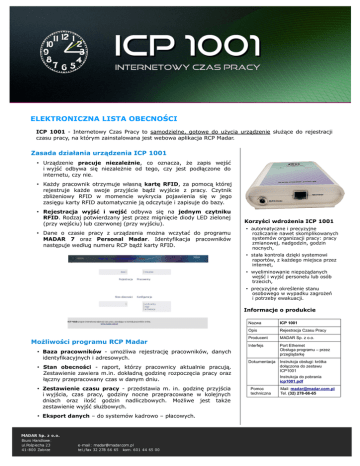 ELEKTRONICZNA LISTA OBECNOŚCI ICP 1001 - Internetowy Czas Pracy to samodzielne, gotowe do użycia urządzenie służące do rejestracji czasu pracy, na którym zainstalowana jest webowa aplikacja RCP Madar. Zasada działania urządzenia ICP 1001 • Urządzenie pracuje niezależnie, co oznacza, że zapis wejść i wyjść odbywa się niezależnie od tego, czy jest podłączone do internetu, czy nie. • Każdy pracownik otrzymuje własną kartę RFID, za pomocą której rejestruje każde swoje przyjście bądź wyjście z pracy. Czytnik zbliżeniowy RFID w momencie wykrycia pojawienia się w jego zasięgu karty RFID automatycznie ją odczytuje i zapisuje do bazy. • Rejestracja wyjść i wejść odbywa się na jednym czytniku RFID. Rodzaj potwierdzany jest przez mignięcie diody LED zielonej (przy wejściu) lub czerwonej (przy wyjściu). • Dane o czasie pracy z urządzenia można wczytać do programu MADAR 7 oraz Personal Madar. Identyfikacja pracowników następuje według numeru RCP bądź karty RFID. Korzyści wdrożenia ICP 1001 • automatyczne i precyzyjne rozliczanie nawet skomplikowanych systemów organizacji pracy: pracy zmianowej, nadgodzin, godzin nocnych, • stała kontrola dzięki systemowi raportów, z każdego miejsca przez internet, • wyeliminowanie niepożądanych wejść i wyjść personelu lub osób trzecich, • precyzyjne określenie stanu osobowego w wypadku zagrożeń i potrzeby ewakuacji. Informacje o produkcie Możliwości programu RCP Madar • Baza pracowników - umożliwa rejestrację pracowników, danych identyfikacyjnych i adresowych. • Stan obecności - raport, którzy pracownicy aktualnie pracują. Zestawienie zawiera m.in. dokładną godzinę rozpoczęcia pracy oraz łączny przepracowany czas w danym dniu. • Zestawienie czasu pracy - przedstawia m. in. godzinę przyjścia i wyjścia, czas pracy, godziny nocne przepracowane w kolejnych dniach oraz ilość godzin nadliczbowych. Możliwe jest także zestawienie wyjść służbowych. • Eksport danych – do systemów kadrowo – płacowych. Nazwa ICP 1001 Opis Rejestracja Czasu Pracy Producent MADAR Sp. z o.o. Interfejs Port Ethernet Obsługa programu – przez przeglądarkę Dokumentacja Instrukcja obsługi: krótka dołączona do zestawu ICP1001 Instrukcja do pobrania icp1001.pdf Pomoc techniczna Mail: [email protected] Tel. (32) 278-66-65