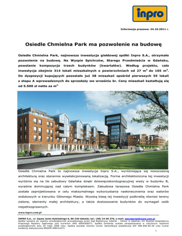 Informacja prasowa: 24.10.2011 r. Osiedle Chmielna Park ma pozwolenie na budowę Osiedle Chmielna Park, najnowsza inwestycja giełdowej spółki Inpro S.A., otrzymało pozwolenie na budowę. Na Wyspie Spichrzów, Starego Przedmieścia w Gdańsku, powstanie kompozycja trzech budynków (kwartałów). Według projektu, cała 2 inwestycja obejmie 314 lokali mieszkalnych o powierzchniach od 27 m do 165 m2. Do dyspozycji kupujących pozostało już 38 mieszkań spośród pierwszych 55 lokali z etapu A wprowadzonych do sprzedaży we wrześniu br. Ceny mieszkań kształtują się od 5.500 zł netto za m2. Osiedle Chmielna Park to najnowsza inwestycja Inpro S.A., wyróżniająca się nowoczesną architekturą oraz starannie wyselekcjonowaną lokalizacją. Forma architektoniczna tej inwestycji wyróżnia się na tle zabudowy Gdańska dzięki dziewięciokondygnacyjnej wieży w budynku B, wyraźnie dominującej nad całym kompleksem. Zabudowa tarasowa Osiedla Chmielna Park została zaprojektowana w celu maksymalnego wykorzystania nasłonecznienia oraz walorów widokowych w kierunku Głównego Miasta. Wysoką klasę tej inwestycji podkreślą również tereny zielone, elementy małej architektury, a także dostosowanie budynków do wymagań osób niepełnosprawnych. www.inpro.com.pl INPRO S.A., ul. Opata Jacka Rybińskiego 8, 80-320 Gdańsk, tel.: (58) 34 00 370, e-mail: [email protected] Spółka wpisana do rejestru przedsiębiorców prowadzonego przez Sąd Rejestrowy Gdańsk – Północ w Gdańsku VII Wydział Gospodarczy Krajowego Rejestru Sądowego pod numerem KRS 0000306071. Spółka Emitenta została zarejestrowana w rzeczonym rejestrze przedsiębiorców dnia 29 maja 2008 roku. Spółka posiada również numer identyfikacji podatkowej NIP 589-000-85-40 oraz numer ewidencji statystycznej REGON 008141071. 1 „Osiedle Chmielna Park jest naszą najnowszą, bardzo ciekawą inwestycją. Charakterystyczna nowoczesna architektura będzie dominowała nad zabudową Starego Przedmieścia, a jednocześnie wpisywała się w styl charakterystyczny dla Gdańska. Inwestycja cieszy się sporym zainteresowaniem. Sprzedaliśmy już ponad 30% z aktualnej oferty mieszkań etapu A, które zostały wprowadzone do sprzedaży we wrześniu br.” – mówi Rafał Zdebski, Dyrektor handlowy Inpro S.A. Łączna, mieszkalna powierzchnia użytkowa razem z powierzchnią usługową Osiedla Chmielna Park będzie wynosiła 21.556 m2. Ceny mieszkań kształtują się od 5.500 zł/m² do 8.500 zł/ m² (za lokale z dużymi tarasami na górnych kondygnacjach). Zakończenie budowy budynku A planowane jest 30.09.2013 r., a realizacja całej inwestycji powinna zakończyć się do końca 2015 roku. *** Firma Inpro powstała w 1987 roku. Jest jedną z najbardziej uznanych i liczących się firm deweloperskich działających na rynku trójmiejskim. W swojej ofercie ma przede wszystkim apartamenty i mieszkania o podwyższonym standardzie oraz domy jednorodzinne. Spółka realizuje także inwestycje komercyjne, takie jak hotele apartamentowe i biurowce oraz świadczy usługi budowlane. Inpro kładzie nacisk przede wszystkim na doskonałe lokalizacje swoich inwestycji oraz wysoką jakość wykonania, dzięki czemu od wielu lat zajmuje wysokie miejsce w pierwszej piątce firm deweloperskich na rynku trójmiejskim. Grupa Inpro posiada wykwalifikowaną, 150-osobową kadrę budowlaną. Firma szczególną uwagę przykłada do stosowania nowoczesnych technologii oraz nowatorskich rozwiązań technicznych i organizacyjnych. Inpro jest również w czołówce pod względem liczby sprzedanych lokali dzięki odpowiedniemu dopasowaniu oferty do wymagań klientów Dodatkowych informacji udziela: Tauber Promotion Mariusz Skowronek tel. 22 833 35 02 w. 101 mobile: 698 612 866 [email protected] Justyna Płocica tel. 22 833 35 02 w. 112 mobile: 668 205 562 [email protected] www.inpro.com.pl INPRO S.A., ul. Opata Jacka Rybińskiego 8, 80-320 Gdańsk, tel.: (58) 34 00 370, e-mail: [email protected] Spółka wpisana do rejestru przedsiębiorców prowadzonego przez Sąd Rejestrowy Gdańsk – Północ w Gdańsku VII Wydział Gospodarczy Krajowego Rejestru Sądowego pod numerem KRS 0000306071. Spółka Emitenta została zarejestrowana w rzeczonym rejestrze przedsiębiorców dnia 29 maja 2008 roku. Spółka posiada również numer identyfikacji podatkowej NIP 589-000-85-40 oraz numer ewidencji statystycznej REGON 008141071. 2