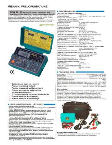 MIERNIKI WIELOFUNKCYJNE KEW 6010B rezystancja izolacji, impedancja pętli zwarciowej, test wyłączników różnicowoprądowych, ciągłość Miernik KEW6010B jest wielofunkcyjnym miernikiem parametrów instalacji elektrycznych wyposażonym w pamięć wewnętrzną oraz interfejs RS-232, który umożliwia przesłanie danych pomiarowych komputera PC. Funkcje pomiarowe miernika umożliwiają wykonanie 6 podstawowych pomiarów. Pomiar parametrów instalacji elektrycznej jest zgodny z normą PN-EN 61557. DANE TECHNICZNE: • SPRAWDZANIE CIĄGŁOŚCI OBWODU Podzakresy pomiarowe: 0...20-200 Ω Dokładność pomiaru: 0-2 Ω: +(3,0% + 4 c); 2-200 Ω +(3,0% + 3 c) Napięcie pom. rozwartego obwodu: 6 V Prąd pomiarowy zwartego obwodu: 200 mA • POMIAR REZYSTANCJI IZOLACJI Podzakresy pomiarowe: 20, 200 MΩ(wybót automatyczny) Dokładność pomiaru: +(3,0% + 3 c) Napięcie pomiarowe: 500 V/1000 V • POMIAR IMPEDANCJI PĘTLI ZWARCIOWEJ Podzkresy pomiarowe: 20, 2000 Ω Dokładność pomiaru: +(3,0% + 8 c) Znamionowy prąd pomiarowy: 25 A (20 Ω), 15 mA (2000 Ω) Czas pomiaru: 10 ms (20 Ω), 350 ms (2000 Ω) • POMIAR PARAMETRÓW WYŁĄCZNIKÓW RÓŻNICOWOPRĄDOWYCH Nastawy prądu znamionowego IN: 10-30-100-300-500 mA • POMIAR CZASU WYŁĄCZANIA WYŁĄCZNIKÓW TYPU AC Prąd pomiarowy: % x IN, 1 x IN, FAST Maks. czas zadawania prądu pom.: 2000 ms (% x IN, 1 x IN); 50 ms (FAST) Dokładność zadawania prądu pom.: -8%: -2% (% x IN) +2%: +8% (1 x IN),FAST Dokładność pom. czasu wyzwalania: +(1,0% + 3 c) • POMIAR PRĄDU WYZWALANIA WYŁĄCZNIKÓW TYPU AC (AUTO-RAMP) 0,2IN: 1,1IN ze skokiem 0,1IN Prąd pomiarowy: (IN: od 10 mA do 500 mA) Dokładność zadawania prądu pom.: +4% • POMIAR CZASU WYZWALANIA WYŁĄCZNIKÓW TYPU A (DC) Prąd pomiarowy: IN (jednokierunkowy, pulsujący) Maks. czas zadawania prądu IN: 2000 ms (10 - 300 mA) 200 ms (500 mA) +10% Dokładność zadawania prądu IN: Dokładność pom. czasu wyzwalania: +(1,0%+3c) • POMIAR NAPIĘCIA DOTYKOWEGO Zakres pomiaru: 0 - 100 V Dokładność pomiaru: +(5% - 15%) + 8 c • POMIAR NAPIĘCIA PRZEMIENNEGO Zakres pomiaru: 100 - 300 V (50 Hz) Dokładność pomiaru: +3% POZOSTAŁE DANE: • • • • Sprawdzanie ciągłości obwodu Pomiar rezystancji izolacji Pomiar impedancji pętli zwarciowej Pomiar parametrów wyłączników różnicowoprądowych • Przybliżony pomiar rezystancji uziemienia • Pomiar napięcia dotykowego • Pomiar napięcia przemiennego Wyświetlacz..............................................................ciekłokrystaliczny, 3½ cyfry(1999) Napięcie pracy.....................................................................230 V +10% -15% (50 Hz) Pomiary zgodne z normą...............................................IEC61557-1, 2, -3, -4, -6, -10 Bezpieczeństwo..............................................................PN-EN 61010-1 kat. III 300 V Ochrona przeciwprzepięciowa............................................................................4000 V Stopień szczelności obudowy.................................................................................IP40 Zakres temperatur i wilgotności względnych pracy.......................0°C - 40°C, < 80% Zakres temperatur i wilgotności względnych przechowywania -20°C - 60°C, < 75% Zasilanie...................................................................12 V, 8 baterii 1,5 V (R6 lub LR6) Wymiary / masa............................................175 x 115 x 86 [mm] / 840 g (z bateriami) Wyposażenie: KEW 7133A - przewód pomiarowy z sondami i chwytakami krokodylowymi, PP7025 – przewód do pomiaru rezystancji zolacji i testu połączeń, KAMP10 - przewód pomiarowy z wtykiem do gniazda sieciowego do pomiarów impedancji pętli zwarciowej, wyłączników różnicowoprądowych oraz napięcia dotykowego wraz z adapterem umożliwiającym pomiar przy zamienionych miejscami dołączeniach przewodów P-N w gnieździe sieciowym, komplet baterii, pasek naramienny z ochraniaczem ramienia, etui na przewody, torba na miernik i wyposażenie, instrukcja obsługi w języku polskim. CECHY KONSTRUKCYJNE I UŻYTKOWE: • Pomiar ciągłości obwodu prądem 200 mA • Automatyczna kompensacja rezystancji przewodów pomiarowych podczas testów ciągłości obwodu • Pomiar rezystancji izolacji napięciem pomiarowym 500 V lub 1000 V • Automatyczne rozładowanie obwodu po pomiarze rezystancji izolacji • Sygnalizacja optyczna (LED) obwodu będącego pod napięciem • Sygnalizacja poprawności połączeń L-E, L-N oraz połączeń L-N zamienionych miejscami • Pomiar impedancji pętli zwarciowej bez włączenia wyłącznika różnicowoprądowego (prądem 15 mA, na podzakresie 2000 Ω) • Zabezpieczenie termiczne podczas pomiaru impedancji pętli zwarciowej • Bardzo szybki pomiar parametrów wyłączników różnicowoprądowych • Przełącznik fazy prądu pomiarowego 0°/180° • Sygnalizacja przekroczenia dopuszczalnego napięcia dotykowego 25 V lub 50 V z blokadą pomiaru • Precyzyjny pomiar napięcia sieciowego • Pamięć wewnętrzna o maksymalnej pojemności 300 wyników pomiarów • Łącze RS-232 z izolacją optyczną (do połączenia z komputerem PC) • Opcjonalne oprogramowanie w wersji polskiej i przewód do połączenia z komputerem PC • Mechaniczna blokada uniemożliwiająca jednoczesne dołączenie przewodów do testów pętli/wyłączników różnicowoprądowych i ciągłości obwodu/ izolacji • Małogabartyowa obudowa dporna na udary, ergonomiczna konstrukcja zapewniająca wysoki komfort wykonywania pomiarów w różnych warunkach • Pełna zgodność z normą PN-EN 61557 Wyposażenie opcjonalne: KEW8212 – przewód do połączenia z komputerem PC przez łącze RS-232 i podstawowe oprogramowanie do tworzenia raportów pomiarowych.