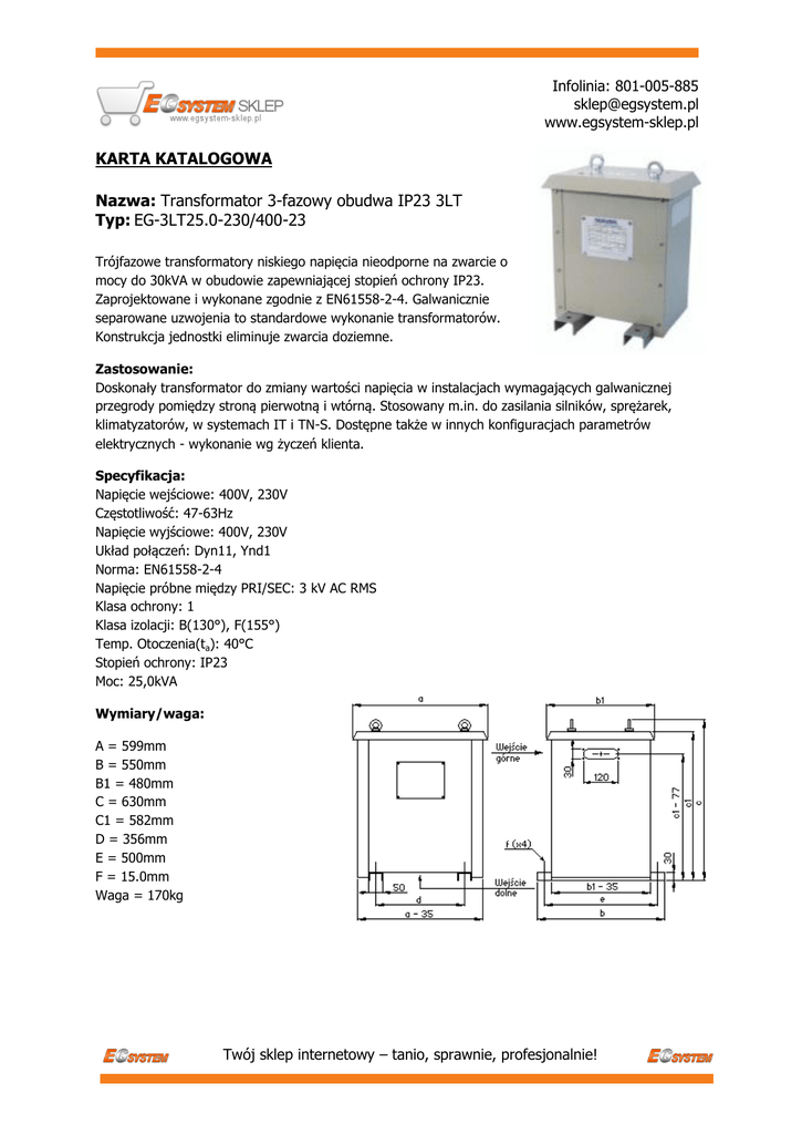 Infolinia: 801-005-885 [email protected] www.egsystem-sklep.pl KARTA KATALOGOWA Nazwa: Transformator 3-fazowy obudwa IP23 3LT Typ: EG-3LT25.0-230/400-23 Trójfazowe transformatory niskiego napięcia nieodporne na zwarcie o mocy do 30kVA w obudowie zapewniającej stopień ochrony IP23. Zaprojektowane i wykonane zgodnie z EN61558-2-4. Galwanicznie separowane uzwojenia to standardowe wykonanie transformatorów. Konstrukcja jednostki eliminuje zwarcia doziemne. Zastosowanie: Doskonały transformator do zmiany wartości napięcia w instalacjach wymagających galwanicznej przegrody pomiędzy stroną pierwotną i wtórną. Stosowany m.in. do zasilania silników, sprężarek, klimatyzatorów, w systemach IT i TN-S. Dostępne także w innych konfiguracjach parametrów elektrycznych - wykonanie wg życzeń klienta. Specyfikacja: Napięcie wejściowe: 400V, 230V Częstotliwość: 47-63Hz Napięcie wyjściowe: 400V, 230V Układ połączeń: Dyn11, Ynd1 Norma: EN61558-2-4 Napięcie próbne między PRI/SEC: 3 kV AC RMS Klasa ochrony: 1 Klasa izolacji: B(130°), F(155°) Temp. Otoczenia(ta): 40°C Stopień ochrony: IP23 Moc: 25,0kVA Wymiary/waga: A = 599mm B = 550mm B1 = 480mm C = 630mm C1 = 582mm D = 356mm E = 500mm F = 15.0mm Waga = 170kg Twój sklep internetowy – tanio, sprawnie, profesjonalnie! Infolinia: 801-005-885 [email protected] www.egsystem-sklep.pl Standardowe układy połączeń: Program standardowy: Moc: 25,0kVA Klada izolacji: F Twój sklep internetowy – tanio, sprawnie, profesjonalnie!