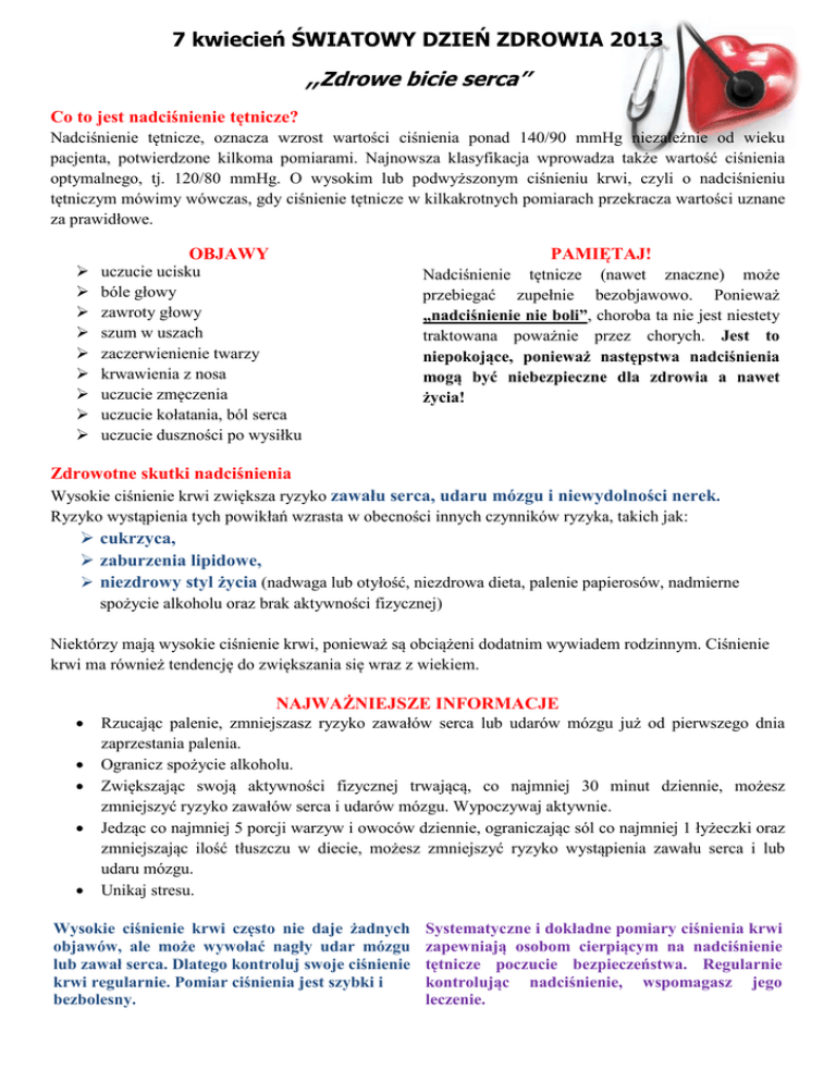 7 kwiecień ŚWIATOWY DZIEŃ ZDROWIA 2013 ,,Zdrowe bicie serca’’ Co to jest nadciśnienie tętnicze? Nadciśnienie tętnicze, oznacza wzrost warto wartości ciśnienia nienia ponad 140/90 mmHg niezależnie niezale od wieku pacjenta, potwierdzone kilkoma pomiarami. Najnowsza klasyfikacja wprowadza także tak wartość ciśnienia optymalnego, tj. 120/80 mmHg. O wysokim lub podwy podwyższonym ciśnieniu nieniu krwi, czyli o nadciśnieniu nadci tętniczym mówimy wówczas, gdy ciśśnienie tętnicze w kilkakrotnych pomiarach przekracza wartości warto uznane za prawidłowe. OBJAWY PAMIĘTAJ! uczucie ucisku bóle głowy zawroty głowy szum w uszach zaczerwienienie twarzy krwawienia z nosa uczucie zmęczenia uczucie kołatania, ból serca uczucie duszności po wysiłku Nadciśnienie nienie tętnicze (nawet znaczne) może przebiegać zupełnie bezobjawowo. Ponieważ „nadciśnienie nie boli”, choroba ta nie jest niestety traktowana poważnie przez chorych. c Jest to niepokojące, ponieważ następstwa nadciśnienia mogą gą być niebezpieczne dla zdrowia a nawet życia! Zdrowotne skutki nadciśnienia Wysokie ysokie ciśnienie krwi zwiększa ryzyko zawału serca, udaru mózgu i niewydolności nerek. Ryzyko wystąpienia tych powikłań wzrasta w obecno obecności innych czynników ryzyka, takich jak: cukrzyca, zaburzenia lipidowe, niezdrowy styl życia (nadwaga nadwaga lub otyłość, niezdrowa dieta, palenie papierosów, nadmierne spożycie alkoholu oraz brak aktywności fizycznej) Niektórzy mają wysokie ciśnienie nienie krwi, poniewa ponieważ są obciążeni dodatnim wywiadem rodzinnym. Ciśnienie krwi ma również tendencję do zwiększania kszania si się wraz z wiekiem. "AJWAŻ"IEJSZE I"FORMACJE • • • • • Rzucając palenie, zmniejszasz ryzyko zawałów serca lub udarów mózgu już od pierwszego dnia zaprzestania palenia. Ogranicz spożycie alkoholu. Zwiększając swoją aktywności fizycznej trwającą, co najmniej 30 minut dziennie, możesz zmniejszyć ryzyko zawałów serca i udarów mózgu. Wypoczywaj aktywnie. Jedząc co najmniej 5 porcji warzyw i owoców dziennie, ograniczając sól co najmniej 1 łyżeczki oraz zmniejszając ilość tłuszczu w diecie, możesz zmniejszyć ryzyko wystąpienia zawału serca i lub udaru mózgu. Unikaj stresu. Wysokie ciśnienie krwi często sto nie daje żadnych objawów, ale może wywołać nagłły udar mózgu lub zawał serca. Dlatego kontroluj swoje ci ciśnienie krwi regularnie. Pomiar ciśnienia jest szybki i bezbolesny. Systematyczne i dokładne adne pomiary ciśnienia krwi zapewniają osobom cierpiącym cierpi na nadciśnienie tętnicze poczucie bezpieczeństwa. bezpiecze Regularnie kontrolując nadciśnienie, nienie, wspomagasz jego leczenie.
