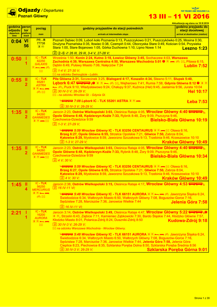 Jarocin 23:54, Pleszew 0:13, Ostrów Wielkopolski 0:34, Kluczbork 1:32, Lubliniec 2:05, Częstochowa Stradom 2:30, Kraków Główny 4:18, Kraków Płaszów 4:29, Skawina 4:59, Kalwaria Zebrzydowska Lanckorona 5:31, Sucha Beskidzka 6:07, Maków Podhalański 6:30, Jordanów 6:47, Chabówka 7:00, Nowy Targ 7:41, Biały Dunajec 7:52, Poronin 7:57