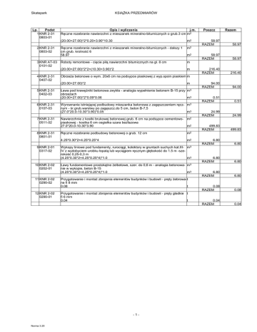 Skatepark Lp. Podst 1 KNR 2-31 0803-01 2 KNR 2-31 0803-02 3 KNR AT-03 0101-02 4 KNR 2-31 0407-02 KSIĄŻKA PRZEDMIARÓW Opis i wyliczenia j.m. Ręczne rozebranie nawierzchni z mieszanek mineralno-bitumicznych o grub.3 cm m2 (20.00+27.00)*2*0.20+3.90*10.30 m2 Ręczne rozebranie nawierzchni z mieszanek mineralno-bitumicznych - dalszy 1 cm grub. krotność 6 58.97 m2 Roboty remontowe - cięcie piłą nawierzchni bitumicznych na gł. 8 cm m (20.00+27.00)*2*2+(10.30+3.90)*2 m 6 KNR 2-31 0107-03 7 KNR 2-31 0511-02 8 KNR 2-31 0801-01 9 KNR 2-01 0317-02 10 KNR 2-02 0202-01 11 KNR 2-02 0290-02 12 KNR 2-02 0290-01 m Ława pod krawężniki betonowa zwykła - analogia wypełnienie betonem B-15 przy m3 obrzeżach (20.00+27.00)*2*0.09*0.06 m3 Wyrownanie istniejącej podbudowy mieszanka betonowa z zagęszczeniem ręcz- m3 nym - śr.grub.warstwy po zagęszcz.do 5 cm, beton B-7,5 (27.0*20.0-10.30*3.90)*0.05 m3 Nawierzchnie z kostki brukowej betonowej grub. 6 cm na podsypce cementowopiaskowej - kostka 6 cm cegiełka szara bezfazowa 27.0*20.0-10.30*3.90 m2 Ręczne rozebranie podbudowy betonowej o grub. 12 cm m2 4.25*0.30*2+4.25*0.25*4 m2 m2 Wykopy liniowe pod fundamenty, rurociągi, kolektory w gruntach suchych kat.III- m3 IV z wydobyciem urobku łopatą lub wyciągiem ręcznym głębokość do 1.5 m -szerokość 0,25-0,3 m (4.25*0.30*2+4.25*0.25*4)*1.0 m3 Ławy fundamentowe prostokątne żelbetowe, szer. do 0,6 m - analogia betonowa- m3 nie w wykopie, beton B-15 (4.25*0.30*2+4.25*0.25*4)*1.0 m3 Przygotowanie i montaż zbrojenia elementów budynków i budowli - pręty żebrowa-t ne fi 8 mm 0.08 t Przygotowanie i montaż zbrojenia elementów budynków i budowli - pręty gładkie t fi 6 mm 0.04 t -1- Norma 3.20 Razem 58.97 RAZEM 58.97 58.97 RAZEM 58.97 216.40 RAZEM 216.40 94.00 RAZEM 94.00 0.51 RAZEM 0.51 24.99 RAZEM 24.99 499.83 RAZEM 499.83 6.80 RAZEM 6.80 6.80 RAZEM 6.80 6.80 RAZEM 6.80 0.08 RAZEM 0.08 0.04 RAZEM 0.04 Obrzeża betonowe o wym. 20x6 cm na podsypce piaskowej z wyp.spoin piaskiem m (20.00+27.00)*2 5 KNR 2-31 0402-03 m2 Poszcz