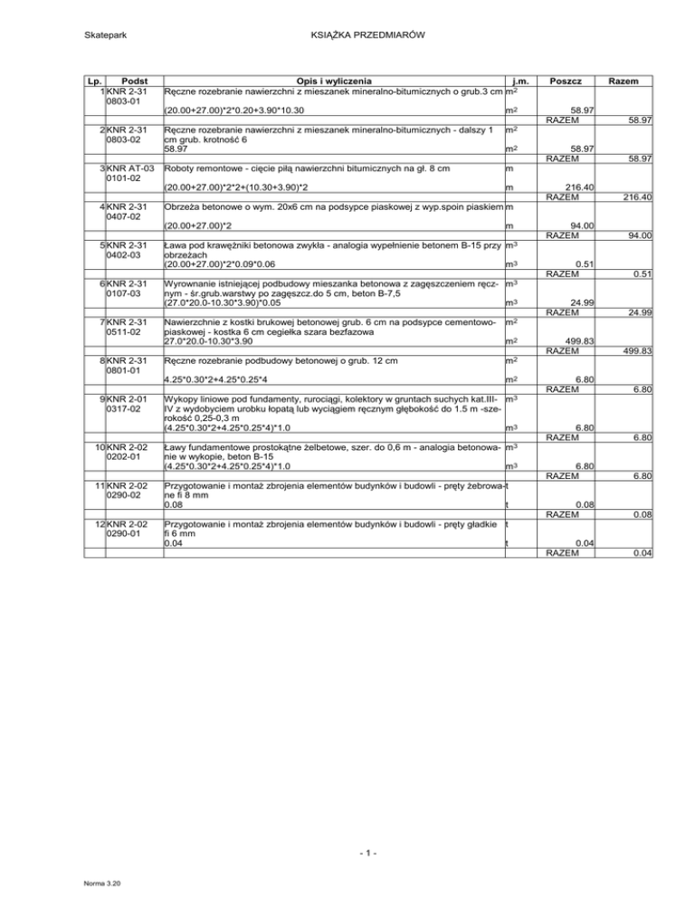 Skatepark KSIĄŻKA PRZEDMIARÓW Lp. Podst Opis i wyliczenia jm