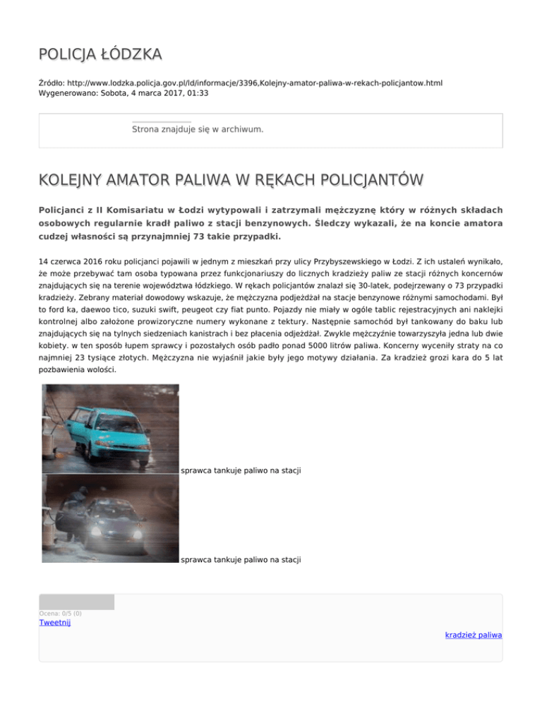 POLICJA ŁÓDZKA Źródło: http://www.lodzka.policja.gov.pl/ld/informacje/3396,Kolejny-amator-paliwa-w-rekach-policjantow.html Wygenerowano: Sobota, 4 marca 2017, 01:33 Strona znajduje się w archiwum. KOLEJNY AMATOR PALIWA W RĘKACH POLICJANTÓW Policjanci z II Komisariatu w Łodzi wytypowali i zatrzymali mężczyznę który w różnych składach osobowych regularnie kradł paliwo z stacji benzynowych. Śledczy wykazali, że na koncie amatora cudzej własności są przynajmniej 73 takie przypadki. 14 czerwca 2016 roku policjanci pojawili w jednym z mieszkań przy ulicy Przybyszewskiego w Łodzi. Z ich ustaleń wynikało, że może przebywać tam osoba typowana przez funkcjonariuszy do licznych kradzieży paliw ze stacji różnych koncernów znajdujących się na terenie województwa łódzkiego. W rękach policjantów znalazł się 30-latek, podejrzewany o 73 przypadki kradzieży. Zebrany materiał dowodowy wskazuje, że mężczyzna podjeżdżał na stacje benzynowe różnymi samochodami. Był to ford ka, daewoo tico, suzuki swift, peugeot czy fiat punto. Pojazdy nie miały w ogóle tablic rejestracyjnych ani naklejki kontrolnej albo założone prowizoryczne numery wykonane z tektury. Następnie samochód był tankowany do baku lub znajdujących się na tylnych siedzeniach kanistrach i bez płacenia odjeżdżał. Zwykle mężczyźnie towarzyszyła jedna lub dwie kobiety. w ten sposób łupem sprawcy i pozostałych osób padło ponad 5000 litrów paliwa. Koncerny wyceniły straty na co najmniej 23 tysiące złotych. Mężczyzna nie wyjaśnił jakie były jego motywy działania. Za kradzież grozi kara do 5 lat pozbawienia wolości. sprawca tankuje paliwo na stacji sprawca tankuje paliwo na stacji Ocena: 0/5 (0) Tweetnij kradzież paliwa