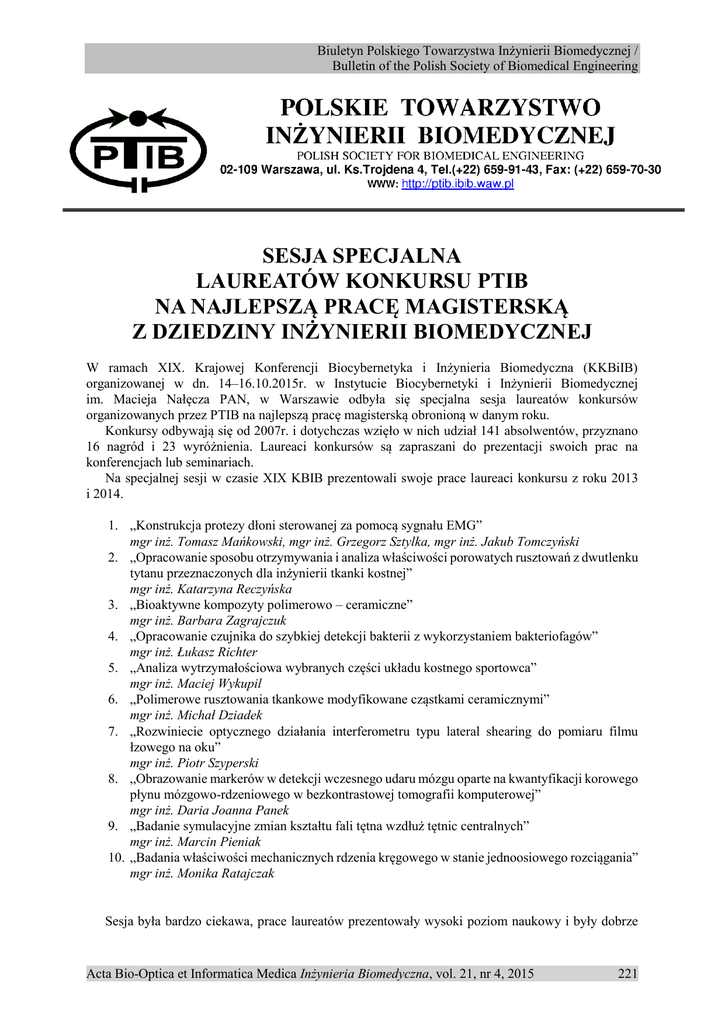 Biuletyn Polskiego Towarzystwa Inżynierii Biomedycznej / Bulletin of the Polish Society of Biomedical Engineering SESJA SPECJALNA LAUREATÓW KONKURSU PTIB NA NAJLEPSZĄ PRACĘ MAGISTERSKĄ Z DZIEDZINY INŻYNIERII BIOMEDYCZNEJ W ramach XIX. Krajowej Konferencji Biocybernetyka i Inżynieria Biomedyczna (KKBiIB) organizowanej w dn. 14–16.10.2015r. w Instytucie Biocybernetyki i Inżynierii Biomedycznej im. Macieja Nałęcza PAN, w Warszawie odbyła się specjalna sesja laureatów konkursów organizowanych przez PTIB na najlepszą pracę magisterską obronioną w danym roku. Konkursy odbywają się od 2007r. i dotychczas wzięło w nich udział 141 absolwentów, przyznano 16 nagród i 23 wyróżnienia. Laureaci konkursów są zapraszani do prezentacji swoich prac na konferencjach lub seminariach. Na specjalnej sesji w czasie XIX KBIB prezentowali swoje prace laureaci konkursu z roku 2013 i 2014. 1. „Konstrukcja protezy dłoni sterowanej za pomocą sygnału EMG” mgr inż. Tomasz Mańkowski, mgr inż. Grzegorz Sztylka, mgr inż. Jakub Tomczyński 2. „Opracowanie sposobu otrzymywania i analiza właściwości porowatych rusztowań z dwutlenku tytanu przeznaczonych dla inżynierii tkanki kostnej” mgr inż. Katarzyna Reczyńska 3. „Bioaktywne kompozyty polimerowo – ceramiczne” mgr inż. Barbara Zagrajczuk 4. „Opracowanie czujnika do szybkiej detekcji bakterii z wykorzystaniem bakteriofagów” mgr inż. Łukasz Richter 5. „Analiza wytrzymałościowa wybranych części układu kostnego sportowca” mgr inż. Maciej Wykupil 6. „Polimerowe rusztowania tkankowe modyfikowane cząstkami ceramicznymi” mgr inż. Michał Dziadek 7. „Rozwiniecie optycznego działania interferometru typu lateral shearing do pomiaru filmu łzowego na oku” mgr inż. Piotr Szyperski 8. „Obrazowanie markerów w detekcji wczesnego udaru mózgu oparte na kwantyfikacji korowego płynu mózgowo-rdzeniowego w bezkontrastowej tomografii komputerowej” mgr inż. Daria Joanna Panek 9. „Badanie symulacyjne zmian kształtu fali tętna wzdłuż tętnic centralnych” mgr inż. Marcin Pieniak 10. „Badania właściwości mechanicznych rdzenia kręgowego w stanie jednoosiowego rozciągania” mgr inż. Monika Ratajczak Sesja była bardzo ciekawa, prace laureatów prezentowały wysoki poziom naukowy i były dobrze Acta Bio-Optica et Informatica Medica Inżynieria Biomedyczna, vol. 21, nr 4, 2015 221 Biuletyn Polskiego Towarzystwa Inżynierii Biomedycznej / Bulletin of the Polish Society of Biomedical Engineering przedstawione. Po prezentacji odbywały się interesujące dyskusje. Konferencje KBIB są organizowane jako cykliczne wydarzenia naukowe i zostały zainicjowane przez Komitet Biocybernetyki i Inżynierii Biomedycznej PAN. XIX Konferencja KBIB odbyła się pod patronatem honorowym prezesa PAN, pana prof. dr hab. Jerzego Duszyńskiego i była współfinansowana przez Ministerstwo Nauki i Szkolnictwa Wyższego. Organizatorami Konferencji byli: Komitet Biocybernetyki i Inżynierii Biomedycznej PAN, Polskie Towarzystwo Inżynierii Biomedycznej. Konferencja odbywała się w Instytutucie Biocybernetyki i Inżynierii Biomedycznej im. M. Nałęcza PAN. W konferencji wzięły udział 253 osoby z 31 krajowych ośrodków naukowych oraz jednego zagranicznego – Molecular Biology and Research Section, Hospital de Tortosa Verge de la Cinta, IISPV, URV, Tortosa, Spain. Obszar tematyczny Konferencji obejmował biopomiary i analizę biosygnałów, modelowanie struktur i procesów fizjologicznych, sieci neuronowe, telemedycynę i teleinformatykę, mikroi nanosensory, sztuczne i hybrydowe narządy, genomikę, obrazowanie procesów biologicznych, domowe systemy monitorowania, ergonomikę, obróbkę informacji, zarządzanie danymi i bezpieczeństwo pacjenta. Tematyka tegorocznej Konferencji została wzbogacona o nowe zagadnienia: bioinformatykę, medycynę regeneracyjną, inżynierię tkankową oraz sesję poświęconą nowoczesnym materiałom do zastosowań biomedycznych. Wygłoszono około 60 referatów i przedstawiono około 120 posterów. Streszczenia prezentowanych prac zostały wydane w wersji książkowej, a ich elektroniczne wersje zostały rozesłane do wszystkich uczestników Konferencji. W roku 2016 odbędzie się IX edycja konkursu PTIB. Informacje o konkursie podane są na stronie Towarzystwa www.http://ptib.ibib.waw.pl Krzysztof Jakub Pałko IBIB PAN Warszawa Acta Bio-Optica et Informatica Medica Inżynieria Biomedyczna, vol. 21, nr 4, 2015 222