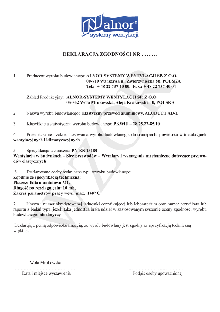 DEKLARACJA ZGODNOŚCI NR ……… Producentwyrobubudowlanego: ALNOR-SYSTEMY WENTYLACJI SP. Z O.O. 00-719 Warszawa ul. Zwierzyniecka 8b, POLSKA Tel.: + 48 22 737 40 00, Fax.: + 48 22 737 40 04 ZakładProdukcyjny:ALNOR-SYSTEMY WENTYLACJI SP. Z O.O. 05-552 Wola Mrokowska, Aleja Krakowska 10, POLSKA 2. Nazwawyrobubudowlanego:Elastyczny przewód aluminiowy, ALUDUCT AD-L 3. Klasyfikacjastatystycznawyrobubudowlanego:PKWiU – 28.75.27-85.10 ZÓ R 1. 4. Przeznaczenieizakresstosowaniawyrobubudowlanego: do transportu powietrza w instalacjach wentylacyjnych i klimatyzacyjnych 5. Specyfikacjatechniczna: PN-EN 13180 Wentylacja w budynkach – Sieć przewodów – Wymiary i wymagania mechaniczne dotyczące przewodów elastycznych W 6. Deklarowanecechytechnicznetypuwyrobubudowlanego: Zgodnie ze specyfikacją techniczną: Płaszcz: folia aluminiowa M1, Długość po rozciągnięciu: 10 mb, Zakres parametrów pracy wew.: max. 140° C 7. Nazwainumerakredytowanejjednostkicertyfikującejlublaboratoriumoraznumercertyfikatulub raportuzbadańtypu,jeżelitakajednostkabrałaudziałwzastosowanymsystemieocenyzgodnościwyrobu budowlanego:nie dotyczy Deklarujęzpełnąodpowiedzialnością,żewyróbbudowlanyjestzgodnyzespecyfikacjątechniczną wpkt.5. WolaMrokowska ……………………………………………………………………. Dataimiejscewystawienia Podpisosobyupoważnionej DEKLARACJA ZGODNOŚCI NR ……… Producentwyrobubudowlanego: ALNOR-SYSTEMY WENTYLACJI SP. Z O.O. 00-719 Warszawa ul. Zwierzyniecka 8b, POLSKA Tel.: + 48 22 737 40 00, Fax.: + 48 22 737 40 04 ZakładProdukcyjny:ALNOR-SYSTEMY WENTYLACJI SP. Z O.O. 05-552 Wola Mrokowska, Aleja Krakowska 10, POLSKA 2. Nazwawyrobubudowlanego:Elastyczny przewód aluminiowy, SONOLIGHT PE AD-L 3. Klasyfikacjastatystycznawyrobubudowlanego:PKWiU – 28.75.27-85.10 ZÓ R 1. 4. Przeznaczenieizakresstosowaniawyrobubudowlanego: do transportu powietrza w instalacjach wentylacyjnych i klimatyzacyjnych 5. Specyfikacjatechniczna: PN-EN 13180 Wentylacja w budynkach – Sieć przewodów – Wymiary i wymagania mechaniczne dotyczące przewodów elastycznych W 6. Deklarowanecechytechnicznetypuwyrobubudowlanego: Zgodnie ze specyfikacją techniczną Przewód: perforowane M1+folia PE, Płaszcz: folia aluminiowo-poliestrowa, Grubość izolacji: 25 mm, Długość po rozciągnięciu: 10 mb, Zakres parametrów pracy wew.: max 120° C 7. Nazwainumerakredytowanejjednostkicertyfikującejlublaboratoriumoraznumercertyfikatulub raportuzbadańtypu,jeżelitakajednostkabrałaudziałwzastosowanymsystemieocenyzgodnościwyrobu budowlanego:nie dotyczy Deklarujęzpełnąodpowiedzialnością,żewyróbbudowlanyjestzgodnyzespecyfikacjątechniczną wpkt.5. WolaMrokowska ……………………………………………………………………. Dataimiejscewystawienia Podpisosobyupoważnionej DEKLARACJA ZGODNOŚCI NR ……… Producentwyrobubudowlanego: ALNOR-SYSTEMY WENTYLACJI SP. Z O.O. 00-719 Warszawa ul. Zwierzyniecka 8b, POLSKA Tel.: + 48 22 737 40 00, Fax.: + 48 22 737 40 04 ZakładProdukcyjny:ALNOR-SYSTEMY WENTYLACJI SP. Z O.O. 05-552 Wola Mrokowska, Aleja Krakowska 10, POLSKA 2. Nazwawyrobubudowlanego:Elastyczny przewód aluminiowy, SONOLIGHT AD-3 3. Klasyfikacjastatystycznawyrobubudowlanego:PKWiU – 28.75.27-85.10 ZÓ R 1. 4. Przeznaczenieizakresstosowaniawyrobubudowlanego: do transportu powietrza w instalacjach wentylacyjnych i klimatyzacyjnych 5. Specyfikacjatechniczna: PN-EN 13180 Wentylacja w budynkach – Sieć przewodów – Wymiary i wymagania mechaniczne dotyczące przewodów elastycznych W 6. Deklarowanecechytechnicznetypuwyrobubudowlanego: Zgodnie ze specyfikacją techniczną Przewód: perforowane M1, Płaszcz: folia aluminiowo-poliestrowa M1, Grubość izolacji: 25 mm, Długość po rozciągnięciu: 10 mb, Zakres parametrów pracy wew.: max 220° C 7. Nazwainumerakredytowanejjednostkicertyfikującejlublaboratoriumoraznumercertyfikatulub raportuzbadańtypu,jeżelitakajednostkabrałaudziałwzastosowanymsystemieocenyzgodnościwyrobu budowlanego:nie dotyczy Deklarujęzpełnąodpowiedzialnością,żewyróbbudowlanyjestzgodnyzespecyfikacjątechniczną wpkt.5. WolaMrokowska ……………………………………………………………………. Dataimiejscewystawienia Podpisosobyupoważnionej