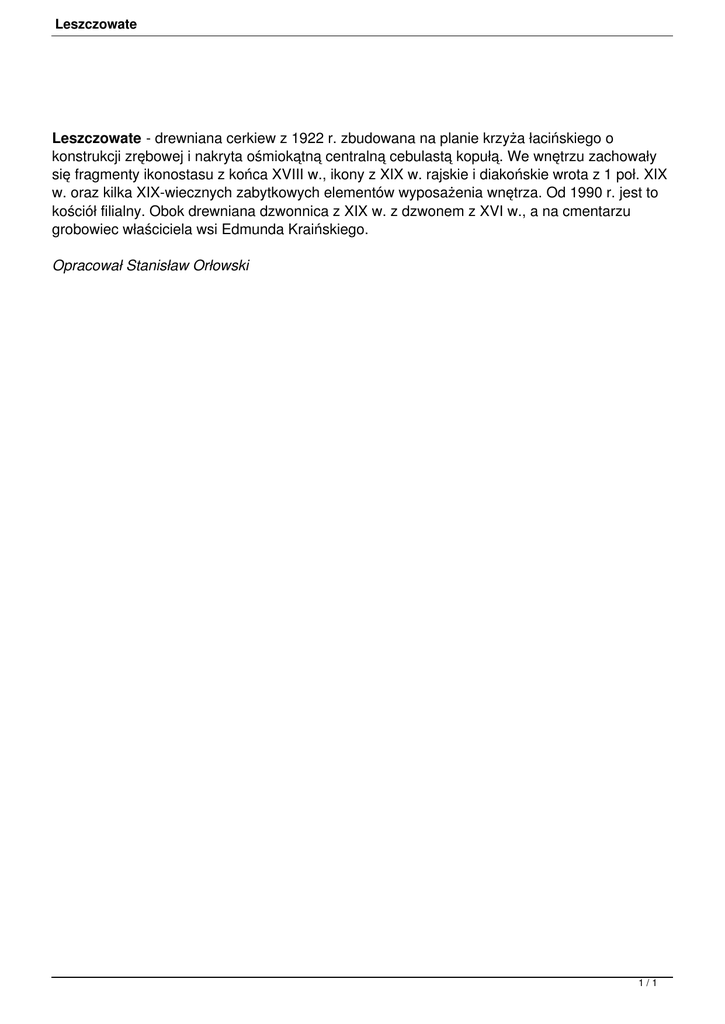 Leszczowate Leszczowate - drewniana cerkiew z 1922 r. zbudowana na planie krzyża łacińskiego o konstrukcji zrębowej i nakryta ośmiokątną centralną cebulastą kopułą. We wnętrzu zachowały się fragmenty ikonostasu z końca XVIII w., ikony z XIX w. rajskie i diakońskie wrota z 1 poł. XIX w. oraz kilka XIX-wiecznych zabytkowych elementów wyposażenia wnętrza. Od 1990 r. jest to kościół filialny. Obok drewniana dzwonnica z XIX w. z dzwonem z XVI w., a na cmentarzu grobowiec właściciela wsi Edmunda Kraińskiego. Opracował Stanisław Orłowski 1/1