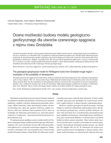 NAFTA-GAZ, ROK LXXII, Nr 11 / 2016 DOI: 10.18668/NG.2016.11.02 Urszula Zagórska, Irena Gąsior, Mateusz Orzechowski Instytut Nafty i Gazu – Państwowy Instytut Badawczy Ocena możliwości budowy modelu geologicznogeofizycznego dla utworów czerwonego spągowca z rejonu rowu Grodziska Artykuł prezentuje sposób wykorzystania laboratoryjnych badań chemicznych i mineralogicznych do modelowania m.in. zailenia czy wskaźnika CEC na podstawie wskazań profilowań jądrowych. Wyniki analiz laboratoryjnych posłużyły do skonstruowania modeli matematycznych pozwalających oszacować własności skał istotne dla oceny parametrów złożowych. Modele zweryfikowano dla rzeczywistych profilowań jądrowych z otworu wiertniczego XY. Uzyskane wysokie współczynniki determinacji (model vs dane laboratoryjne) zachęcają do dalszych prac nad modelami przeznaczonymi dla większego obszaru geologicznego. Słowa kluczowe: czerwony spągowiec, model matematyczny, zailenie, CEC, skład mineralny, profilowania jądrowe. The geological-geophysical model for Rotliegend rocks from Grodzisk trough region – evaluation of the possibility of development The paper presents the application of laboratory analyses (chemical and mineralogical) for the modeling of parameters such as clay content, CEC etc. from nuclear logs. Mathematical models based on laboratory data were developed. These models allow for the estimation of rock properties that are crucial for the assessment of reservoir parameters. Models were verified for nuclear logs of the XY borehole. High determination coefficient of models vs laboratory data were obtained. These results encourage further studies on models suitable for larger geological areas. Key words: Rotliegend, mathematical model, CEC, clay content, mineral composition, nuclear logs. Wstęp Określanie mineralogii przewiercanych formacji skalnych na podstawie profilowań geofizyki wiertniczej jest ważnym zadaniem z punktu widzenia interpretacji potencjału złożowego. Skład mineralny skały determinuje istotne własności petrofizyczne, takie jak: gęstość właściwa, indeks wodorowy (HI) oraz zdolność jonowymienna (CEC), które są niezbędne do obliczenia porowatości (φ), nasycenia porów wodą (Sw) i ostatecznie – nasycenia przestrzeni porowej węglowodorami [16]. W niniejszej pracy poddana ocenie została możliwość budowy matematycznego modelu umożliwiającego obliczenie: zailenia, CEC oraz zawartości kwarcu dla wskazań profilowań jądrowych w utworach czerwonego spągowca. Modelowanie wskaźnika CEC jest przydatne przy zastosowaniu modeli Waxmana-Smitsa i Dual Water do obliczenia współ- czynnika nasycenia wodą dla skał zailonych. Z kolei współczynnik nasycenia jest niezbędny do oszacowania zawartości węglowodorów w danym basenie sedymentacyjnym. Budowa modelu geologiczno-geofizycznego wymaga badań na możliwie najbardziej reprezentatywnym, dla danej formacji geologicznej, zestawie próbek skalnych. Zestaw taki powinien być wszechstronnie przeanalizowany pod względem chemicznym, mineralogicznym i petrofizycznym, przy zachowaniu dbałości o wykonywanie wszystkich badań na takim samym materiale. Musi istnieć także możliwość przeliczenia wyników tych badań na wartości parametrów mierzalnych metodami geofizycznymi, np. takich jak: HI, SigMa, GR czy Pe. W zależności od zestawu pomiarów geofizycznych, dostępnego w danym rejonie, określamy model bazujący na mniejszej lub większej ilości pa- 901 NAFTA-GAZ rametrów – zmiennych mierzalnych geofizycznie. Większa ilość zmiennych pomiarowych pozwala określić większą ilość składników skały i/lub zwiększyć dokładność wy- niku interpretacji. Wśród metod matematycznych umożliwiających tworzenie tego typu modeli podstawową jest zastosowana tu analiza regresji. Rejon badań Obszar badań leży w części monokliny przedsudeckiej wyróżnianej jako blok Gorzowa [5], na terenie północnowschodniego obrzeżenia wału wolsztyńskiego. Do analizy wykorzystano skały czerwonego spągowca z dobrze rozpoznanego rejonu występowania złóż gazu ziemnego – rowu Grodziska (rysunek 1). Utwory czerwonego spągowca są skałami deponowanymi w Polskim Basenie Permskim stanowiącym część wielkiego permskiego basenu sedymentacyjnego rozciągającego się od Anglii przez Niemcy, Holandię aż po Polskę. Rozwój basenu rozpoczął się pod koniec karbonu, a sedymentacja w jego obrębie zakończyła się w kredzie wraz z rozpoczęciem procesu wynoszenia tego obszaru. Swoim zasięgiem basen obejmował Waryscydy oraz ich przedgórze i był ograniczony od północnego wschodu przez platformę wschodnioeuropejską [6]. Sedymentacja permskich osadów czerwonego spągowca zachodziła w warunkach klimatu podzwrotnikowego suchego z okresowymi opadami. Utwory te należą zasadniczo do systemów depozycji fluwialnej, eolicznej i typu playa. W kształtowaniu sedymentacji czerwonego spągowca, poza warun- kami klimatycznymi, brały udział także synsedymentacyjne zmiany tektoniczne [8]. Szczegółową analizę sekwencyjną utworów czerwonego spągowca przedstawili Kiersnowski i Buniak [9], wydzielając szereg cykli sedymentacyjnych opracowanych dla poszczególnych części basenu i rekonstruując ewolucję na tle rozwoju tektoniki. Obecny zasięg występowania utworów czerwonego spągowca na terenie Polski to obszar o podłożu waryscyjskim i częściowo kaledońskim, na którym występują miąższe osady tej formacji o niemal nieprzerywanej ciągłości horyzontalnej oraz kilka mniejszych izolowanych basenów m.in. na obszarze Wielkopolski, Śląska, Małopolski i Pomorza (rysunek 1). Osady klastyczne (górnego) czerwonego spągowca to jedne z najważniejszych skał zbiornikowych dla złóż węglowodorów w Polsce. Skałami źródłowymi dla węglowodorów zgromadzonych w czerwonym spągowcu są najprawdopodobniej zalegające w jego spągu utwory karbońskie, zaś skałami uszczelniającymi z