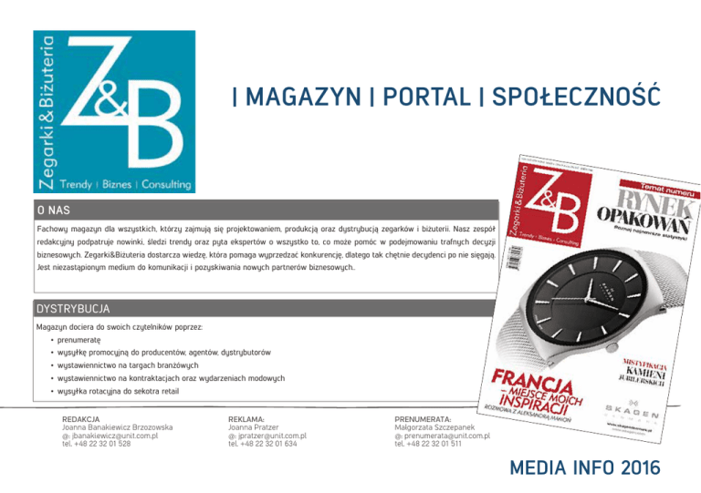 | MAGAZYN | PORTAL | SPOŁECZNOŚĆ O NAS Fachowy magazyn dla wszystkich, którzy zajmują się projektowaniem, produkcją oraz dystrybucją zegarków i biżuterii. Nasz zespół redakcyjny podpatruje nowinki, śledzi trendy oraz pyta ekspertów o wszystko to, co może pomóc w podejmowaniu trafnych decyzji biznesowych. Zegarki&Biżuteria dostarcza wiedzę, która pomaga wyprzedzać konkurencję, dlatego tak chętnie decydenci po nie sięgają. Jest niezastąpionym medium do komunikacji i pozyskiwania nowych partnerów biznesowych.. DYSTRYBUCJA Magazyn dociera do swoich czytelników poprzez: • prenumeratę • wysyłkę promocyjną do producentów, agentów, dystrybutorów • wystawiennictwo na targach branżówych • wystawiennictwo na kontraktacjach oraz wydarzeniach modowych • wysyłka rotacyjna do sekotra retail REDAKCJA Joanna Banakiewicz Brzozowska @: [email protected] tel. +48 22 32 01 528 REKLAMA: Joanna Pratzer @: [email protected] tel. +48 22 32 01 634 PRENUMERATA: Małgorzata Szczepanek @: [email protected] tel. +48 22 32 01 511 MEDIA INFO 2016 FASHIONSECRETS.PL HARMONOGRAM WYDAWNICZY PARAMETRY TECHNICZNE WYDANIE DATA PUBLIKACJI TERMIN SKŁADANIA ZAMÓWIEŃ 1/2016 10.03.2016 29.02.2016 02.03.2016 Młodzi, polscy twórcy biżuterii Targi Amberif 2/2016 30.05.2016 16.05.2016 20.05.2016 Dewocjonalia komunijne, moda - obrączki ślubne Targi Jubinale 3/2016 26.09.2016 12.09.2016 16.09.2016 Bursztyn, biżuteria męska Targi Ambermart, Złoto Srebro Czas 4/2016 12.12.2016 02.12.2016 05.12.2016 Opakowania i ekspozytory, FORMATY I CENY TERMIN DOSTARCZANIA MATERIAŁÓW PORTAL: FASHIONSECRETS.PL; MAILINGI (DO CEN NALEŻY DOLICZYĆ PODATEK VAT) 1/1 210x297 mm 4 300 zł 1/2 105x297 mm (pion) 210x148 mm (poziom) 3 100 zł 2 x 1/2 420x148 mm 6 000 zł 1/3 71x297 mm (pion) 210x103 mm (poziom) 121x132 mm (narożne) 2 500 zł 1/4 210x70 (poziom) 121x102 mm (narożne) 1 900 zł 1/6 WIODĄCE TEMATY I WYDARZENIA Publikacja: 4 razy w roku Nakład: 3 500 egzemplarzy Format: 210X294 MM Portal: fashionsecrets.pl Społeczność: www.facebook.com/fashionsecrets 121x68 mm (poziom) 58x135 mm (pion) 1 200 zł Advertorial od 1 000 zł Rabat agencyjny 15% I Okładka Billboard 980 x100 px 60 zł Button 190 x180 px 48 zł 8 300 zł Button 190 x 60px 48 zł II Okładka 5 800 zł inne formaty III Okładka 5 500 zł Moderowana baza danych IV Okładka 6 600 zł Advertorial insert WYCENA INDYWIDUALNA inne formaty WYCENA INDYWIDUALNA Mailing wycena indywidualna 100 zł/rok od 40 zł 120 zł/ 1000 adresów Powyższe ceny są skalkulowane w modelu CPM (cena za 1000 odsłon)