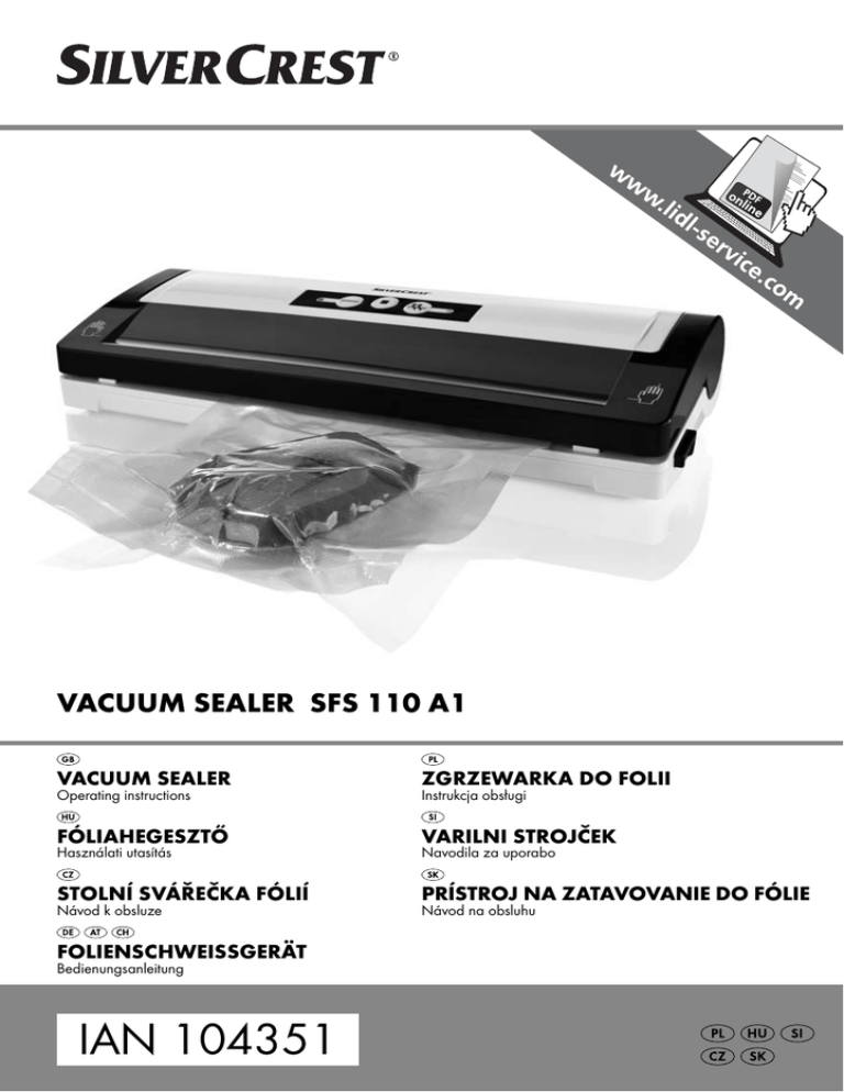 VACUUM SEALER SFS 110 A1 VACUUM SEALER ZGRZEWARKA DO FOLII FÓLIAHEGESZTŐ VARILNI STROJČEK STOLNÍ SVÁŘEČKA FÓLIÍ PRÍSTROJ NA ZATAVOVANIE DO FÓLIE Operating instructions Használati utasítás Návod k obsluze FOLIENSCHWEISSGERÄT Bedienungsanleitung IAN 104351 Instrukcja obsługi Navodila za uporabo Návod na obsluhu Before reading, unfold the page containing the illustrations and familiarise yourself with all functions of the device. Przed przeczytaniem proszę rozłożyć stronę z ilustracjami, a następnie proszę zapoznać się z wszystkimi funkcjami urządzenia. Olvasás előtt kattintson az ábrát tartalmazó oldalra és végezetül ismerje meg a készülék mindegyik funkcióját. Pred branjem odprite stran s slikami in se nato seznanite z vsemi funkcijami naprave. Před čtením si otevřete stranu s obrázky a potom se seznamte se všemi funkcemi přístroje. Pred čítaním si odklopte stranu s obrázkami a potom sa oboznámte so všetkými funkciami prístroja. Klappen Sie vor dem Lesen die Seite mit den Abbildungen aus und machen Sie sich anschließend mit allen Funktionen des Gerätes vertraut. GB PL HU SI CZ SK DE / AT / CH Operating instructions Instrukcja obsługi Használati utasítás Navodila za uporabo Návod k obsluze Návod na obsluhu Bedienungsanleitung Page Strona Oldal Stran Strana Strana Seite 1 15 31 47 63 79 95 A 1 0 9 2 5 3 4 6 7 8 B q w e r t Contents GB Introduction . . . . . . . . . . . . . . . . . . . . . . . . . . . . . . . . . . . . . . . . . . . . . . . . . . . 2 Copyright . . . . . . . . . . . . . . . . . . . . . . . . . . . . . . . . . . . . . . . . . . . . . . . . . . . . . . . . . . . . . . . 2 Limitation of liability . . . . . . . . . . . . . . . . . . . . . . . . . . . . . . . . . . . . . . . . . . . . . . . . . . . . . . . 2 Intended use . . . . . . . . . . . . . . . . . . . . . . . . . . . . . . . . . . . . . . . . . . . . . . . . . . 2 Package contents and transport inspection . . . . . . . . . . . . . . . . . . . . . . . . . 3 Unpacking . . . . . . . . . . . . . . . . . . . . . . . . . . . . . . . . . . . . . . . . . . . . . . . . . . . . . . . . . . . . . . 3 Disposal of packaging materials . . . . . . . . . . . . . . . . . . . . . . . . . . . . . . . . . . . . . . . . . . . . . 3 Description of the appliance . . . . . . . . . . . . . . . . . . . . . . . . . . . . . . . . . . . . . 4 Technical data . . . . . . . . . . . . . . . . . . . . . . . . . . . . . . . . . . . . . . . . . . . . . . . . . 4 Safety guidelines . . . . . . . . . . . . . . . . . . . . . . . . . . . . . . . . . . . . . . . . . . . . . . 5 Setting up and connecting . . . . . . . . . . . . . . . . . . . . . . . . . . . . . . . . . . . . . . . 7 Set-up location requirements . . . . . . . . . . . . . . . . . . . . . . . . . . . . . . . . . . . . . . . . . . . . . . . . 7 Electrical connection . . . . . . . . . . . . . . . . . . . . . . . . . . . . . . . . . . . . . . . . . . . . . . . . . . . . . . 7 Welding a tube film. . . . . . . . . . . . . . . . . . . . . . . . . . . . . . . . . . . . . . . . . . . . . 8 Vacuuming the tube film . . . . . . . . . . . . . . . . . . . . . . . . . . . . . . . . . . . . . . . . 10 Cleaning . . . . . . . . . . . . . . . . . . . . . . . . . . . . . . . . . . . . . . . . . . . . . . . . . . . . . 12 Cleaning the appliance . . . . . . . . . . . . . . . . . . . . . . . . . . . . . . . . . . . . . . . . . . . . . . . . . . . 12 Storage . . . . . . . . . . . . . . . . . . . . . . . . . . . . . . . . . . . . . . . . . . . . . . . . . . . . . 12 Disposal . . . . . . . . . . . . . . . . . . . . . . . . . . . . . . . . . . . . . . . . . . . . . . . . . . . . . 13 Notes on the Declaration of Conformity . . . . . . . . . . . . . . . . . . . . . . . . . . . 13 Importer. . . . . . . . . . . . . . . . . . . . . . . . . . . . . . . . . . . . . . . . . . . . . . . . . . . . . 13 Warranty . . . . . . . . . . . . . . . . . . . . . . . . . . . . . . . . . . . . . . . . . . . . . . . . . . . . 14 Service . . . . . . . . . . . . . . . . . . . . . . . . . . . . . . . . . . . . . . . . . . . . . . . . . . . . . . 14 SFS 110 A1 1 Introduction GB Congratulations on the purchase of your new appliance! You have decided in favour of a modern, high-quality product. These operating instructions are part of this product. They contain important information on safety, usage and disposal. Before using the product, familiarise yourself with all handling and safety guidelines. This appliance may only be used as described and for the purposes indicated. Please also pass these operating instructions on to any future owner(s). Copyright This documentation is protected by copyright. Any reproduction, or any reprint even in the form of excerpts, as well as the rendition of figures even in modified form, is only permitted with the manufacturer’s written consent. Limitation of liability All the technical information, data and instructions regarding installation, connection and operation contained in these operating instructions corresponds to the latest information available to us at the time of printing and takes our previous experience and know-how into account. No claims can be derived from the details, illustrations and descriptions in these instructions. The manufacturer assumes no responsibility for damage caused by failure to observe these instructions, improper use, incompetent repairs, unauthorised modifications or for the use of non-approved replacement parts. Intended use This appliance is intended exclusively for the sealing and vacuum-packing of foodstuffs in household quantities and only in private households. This device is not intended for commercial or industrial applications or for continuous use. It is not intended for any other use or use beyond that specified. Claims of any kind for damage arising as a result of incorrect use will not be accepted. The risk shall be borne solely by the user. 2 SFS 110 A1 Package contents and transport inspection GB The ap