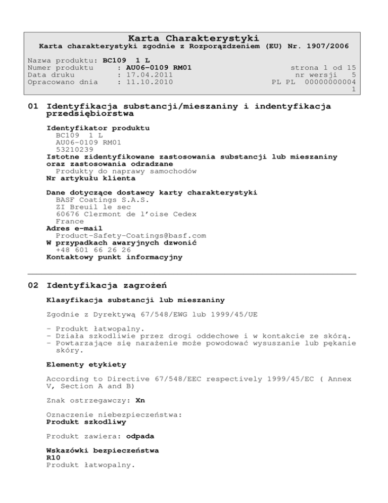 Karta Charakterystyki Karta charakterystyki zgodnie z Rozporązdzeniem (EU) Nr. 1907/2006 Nazwa produktu: BC109 1 L Numer produktu : AU06-0109 RM01 Data druku : 17.04.2011 Opracowano dnia : 11.10.2010 strona 1 od 15 nr wersji 5 PL PL 00000000004 1 01 Identyfikacja substancji/mieszaniny i indentyfikacja przedsiębiorstwa Identyfikator produktu BC109 1 L AU06-0109 RM01 53210239 Istotne zidentyfikowane zastosowania substancji lub mieszaniny oraz zastosowania odradzane Produkty do naprawy samochodów Nr artykułu klienta Dane dotyczące dostawcy karty charakterystyki BASF Coatings S.A.S. ZI Breuil le sec 60676 Clermont de l’oise Cedex France Adres e-mail [email protected] W przypadkach awaryjnych dzwonić +48 601 66 26 26 Kontaktowy punkt informacyjny ______________________________________________________________________ 02 Identyfikacja zagrożeń Klasyfikacja substancji lub mieszaniny Zgodnie z Dyrektywą 67/548/EWG lub 1999/45/UE - Produkt łatwopalny. - Działa szkodliwie przez drogi oddechowe i w kontakcie ze skórą. - Powtarzające się narażenie może powodować wysuszanie lub pękanie skóry. Elementy etykiety According to Directive 67/548/EEC respectively 1999/45/EC ( Annex V, Section A and B) Znak ostrzegawczy: Xn Oznaczenie niebezpieczeństwa: Produkt szkodliwy Produkt zawiera: odpada Wskazówki bezpieczeństwa R10 Produkt łatwopalny. Karta Charakterystyki Karta charakterystyki zgodnie z Rozporązdzeniem (EU) Nr. 1907/2006 Nazwa produktu: BC109 1 L Numer produktu : AU06-0109 RM01 Data druku : 17.04.2011 Opracowano dnia : 11.10.2010 strona 2 od 15 nr wersji 5 PL PL 00000000004 2 R20/21 Działa szkodliwie przez drogi oddechowe i w kontakcie ze skórą. R66 Powtarzające się narażenie może powodować wysuszanie lub pękanie skóry. Oznakowanie przemysłowe S23 Nie wdychać gazu/dymu/pary/rozpylonej cieczy. S36/37 Nosić odpowiednią odzież ochronną i odpowiednie rękawice ochronne. S38 W przypadku niedostatecznej wentylacji stosować odpowiednie indywidualne środki ochrony dróg oddechowych. Inne zagrożenia ______________________________________________________________________ 03 Skład i informacja o składnikach Substancje nie znajduje zastosowania Mieszaniny Charakterystyka chemiczna cellulose ester, Alkyd resin, Żywica poliestrowa, rozpuszczalnik organiczny, wypełniacze, pigment Składniki niebezpieczne zgodnie z Rozporządzeniem (UE) nr. 1272/2008 Nr CAS Nr EINECS Nr REACH Ciężar Zwrot informujący o zagrożeniu dimetylobenzen - mieszanina izomerów [4] 1330-20-7 215-535-7 7,0 - < 10,0 H226 H312 H332 H315 - Ciecze łatwopalne Kategoria 3 - Toksyczność ostra dermalne Kategoria 4 - Toksyczność ostra Inhalacyjne- para Kategoria 4 - Działanie żrące/drażniące na skórę Kategoria 2 etylobenzen 100-41-4 1,0 - < 2,0 202-849-4 Nr INDEX 601-022-00-9 601-023-00-4 Karta Charakterystyki Karta charakterystyki zgodnie z Rozporązdzeniem (EU) Nr. 1907/2006 Nazwa produktu: BC109 1 L Numer produktu : AU06-0109 RM01 Data druku : 17.04.2011 Opracowano dnia : 11.10.2010 strona 3 od 15 nr wersji 5 PL PL 00000000004 3 H225 H332 - Ciecze łatwopalne Kategoria 2 - Toksyczność ostra Inhalacyjne- para Kategoria 4 keton izobutylowo-metylowy 108-10-1 203-550-1 606-004-00-4 12,5 - < 15,0 H225 H332 H319 H335 - Ciecze łatwopalne Kategoria 2 - Toksyczność ostra Inhalacyjne- para Kategoria 4 - Poważne uszkodzenie oczu/ działanie drażniące na oczy Kategoria 2A - Działanie toksyczne na narządy docelowe (narażenie jednorazowe) działanie drażniące na układ oddechowy Kategoria 3 octan butylu 123-86-4 204-658-1 607-025-00-1 30,0 - < 50,0 H226 H336 - Ciecze łatwopalne Kategoria 3 - Działanie toksyczne na narządy docelowe (narażenie jednorazowe) Może spowodować zawroty głowy i oszołomienie. Kategoria 3 rozpuszczalnik Stoddarda 8052-41-3 649-345-00-4 0,1 - < 0,2 H226 H401 H411 H304 H336 - Ciecze łatwopalne Kategoria 3 - Ostra toksyczność w środowisku wodnym Kategoria 2 - Długotrwała toksyczność dla środowiska wodnego Kategoria 2 - niebezpieczeństwo aspiracji Kategoria 1 - Działanie toksyczne na narządy docelowe (narażenie jednorazowe) Może spowodować zawroty głowy i oszołomienie. Kategoria 3 Składniki niebezpieczne zgodnie z dyrektywą 1999/45/WE Nr CAS Ciężar Nr EINECS Symbol Nr REACH Zwroty-R Nr INDEX dimetylobenzen - mieszanina izomerów [4] 1330-20-7 215-535-7 7,0 - < 10,0 Xn 10-20/21-38 601-022-00-9 etylobenzen 100-41-4 1,0 - < 2,0 601-023-00-4 202-849-4 F,Xn keton izobutylowo-metylowy 108-10-1 203-550-1 12,5 - < 15,0 F,Xn 11-20 606-004-00-4 11-20-36/37-66 Karta Charakterystyki Karta charakterystyki zgodnie z Rozporązdzeniem (EU) Nr. 1907/2006 Nazwa produktu: BC109 1 L Numer produktu : AU06-0109 RM01 Data druku : 17.04.2011 Opracowano dnia : 11.10.2010 octan butylu 123-86-4 30,0 - < 50,0 204-658-1 - rozpuszczalnik Stoddarda 8052-41-3 0,1 - < 0,2 N,Xn strona 4 od 15 nr wersji 5 PL PL 00000000004 4 607-025-00-1 10-66-67 649-345-00-4 10-51/53-65-66-67 Jeśli zostały wymienione niebezpieczne składniki, znaczenie symbolu niebezpieczeństwa oraz fraz R i H jest przytoczone w sekcji 16. ______________________________________________________________________ 04 Pierwsza pomoc Opis środków pierwszej pomocy W razie niepewności lub przy trwałych symptomach zasięgnąć porady lekarskiej. Przy utracie przytomności nie podawać niczego doustnie. Wdychanie Poszkodowanego natychmiast usunąć ze strefy zagrożenia. Położyć i zabezpieczyć go przed utratą ciepła, zapewnić spokój. Jeżeli oddech jet nieregularny lub wystąpił bezdech zastosować sztuczne odychanie. Wezwać lekarza! W przypadku utraty przytomności ułożyć w stabilnej pozycji bocznej. Kontakt ze skórą Zdjąć zanieczyszczone części oddzieży. Dotknięte partie skóry przemyć wodą z mydłem, obficie spłukać. Nie stosować rozcieńczalników względnie rozpuszczalników. Kontakt z oczami Usunąć soczewki kontaktowe. Przytrzymać otwarte powieki i obficie płukać dużą ilo