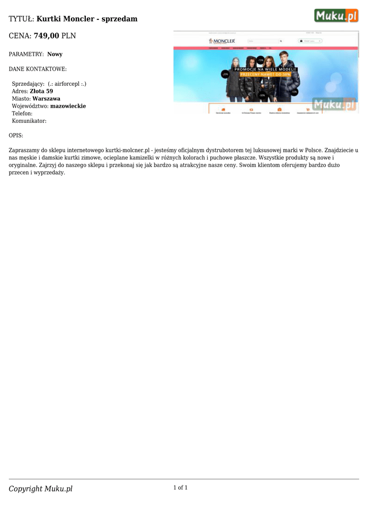 TYTUŁ: Kurtki Moncler - sprzedam CENA: 749,00 PLN PARAMETRY: Nowy DANE KONTAKTOWE: Sprzedający: (.: airforcepl :.) Adres: Złota 59 Miasto: Warszawa Województwo: mazowieckie Telefon: Komunikator: OPIS: Zapraszamy do sklepu internetowego kurtki-molcner.pl - jesteśmy oficjalnym dystrubotorem tej luksusowej marki w Polsce. Znajdziecie u nas męskie i damskie kurtki zimowe, ocieplane kamizelki w różnych kolorach i puchowe płaszcze. Wszystkie produkty są nowe i oryginalne. Zajrzyj do naszego sklepu i przekonaj się jak bardzo są atrakcyjne nasze ceny. Swoim klientom oferujemy bardzo dużo przecen i wyprzedaży. Copyright Muku.pl 1 of 1