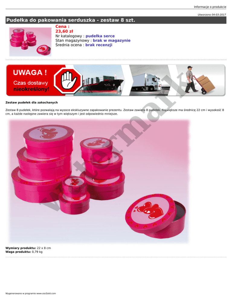 Informacje o produkcie Utworzono 04-03-2017 Pudełka do pakowania serduszka - zestaw 8 szt. Cena : 23,60 zł Zestaw pudełek dla zakochanych er m ar k Nr katalogowy : pudełka serce Stan magazynowy : brak w magazynie Średnia ocena : brak recenzji w at Zestaw 8 pudełek, które pozwalają na wysoce ekskluzywne zapakowanie prezentu. Zestaw zawiera 8 pudełek. Największe ma średnicę 22 cm i wysokość 8 cm, a każde następne zawiera się w tym większym i jest odpowiednio mniejsze. Wymiary produktu: 22 x 8 cm Waga produktu: 0,79 kg Wygenerowano w programie www.oscGold.com