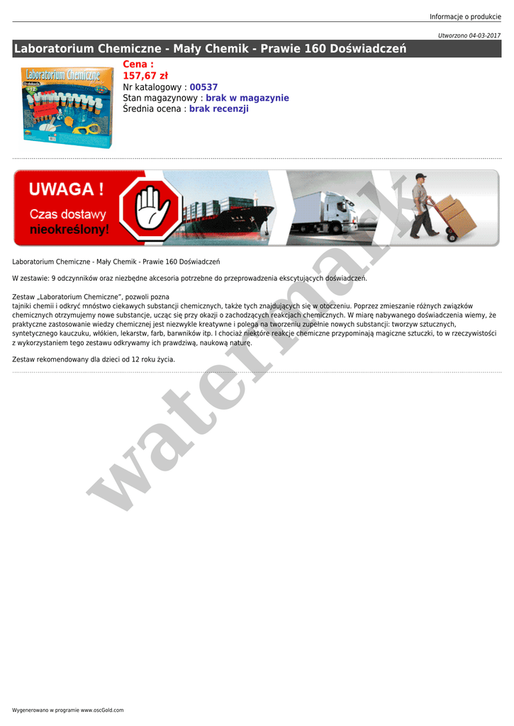 Informacje o produkcie Utworzono 04-03-2017 Laboratorium Chemiczne - Mały Chemik - Prawie 160 Doświadczeń Cena : 157,67 zł er m ar k Nr katalogowy : 00537 Stan magazynowy : brak w magazynie Średnia ocena : brak recenzji Laboratorium Chemiczne - Mały Chemik - Prawie 160 Doświadczeń W zestawie: 9 odczynników oraz niezbędne akcesoria potrzebne do przeprowadzenia ekscytujących doświadczeń. Zestaw „Laboratorium Chemiczne”, pozwoli pozna tajniki chemii i odkryć mnóstwo ciekawych substancji chemicznych, także tych znajdujących się w otoczeniu. Poprzez zmieszanie różnych związków chemicznych otrzymujemy nowe substancje, ucząc się przy okazji o zachodzących reakcjach chemicznych. W miarę nabywanego doświadczenia wiemy, że praktyczne zastosowanie wiedzy chemicznej jest niezwykle kreatywne i polega na tworzeniu zupełnie nowych substancji: tworzyw sztucznych, syntetycznego kauczuku, włókien, lekarstw, farb, barwników itp. I chociaż niektóre reakcje chemiczne przypominają magiczne sztuczki, to w rzeczywistości z wykorzystaniem tego zestawu odkrywamy ich prawdziwą, naukową naturę. w at Zestaw rekomendowany dla dzieci od 12 roku życia. Wygenerowano w programie www.oscGold.com