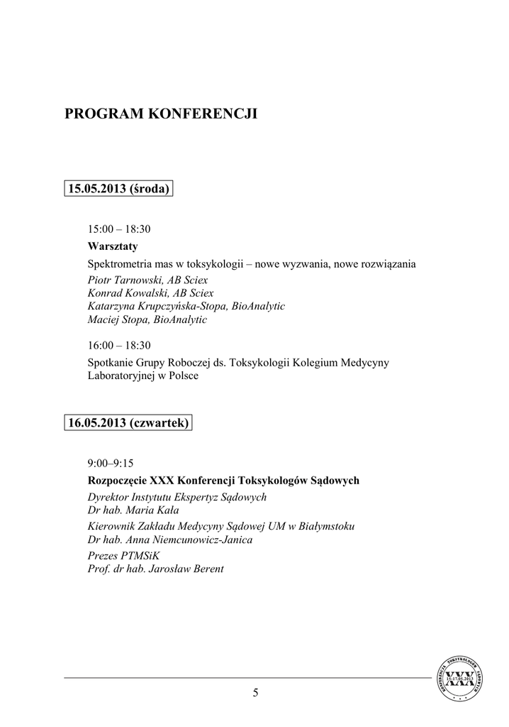 PROGRAM KONFERENCJI 15.05.2013 (środa) 15:00 – 18:30 Warsztaty Spektrometria mas w toksykologii – nowe wyzwania, nowe rozwiązania Piotr Tarnowski, AB Sciex Konrad Kowalski, AB Sciex Katarzyna Krupczyńska-Stopa, BioAnalytic Maciej Stopa, BioAnalytic 16:00 – 18:30 Spotkanie Grupy Roboczej ds. Toksykologii Kolegium Medycyny Laboratoryjnej w Polsce 16.05.2013 (czwartek) 9:00–9:15 Rozpoczęcie XXX Konferencji Toksykologów Sądowych Dyrektor Instytutu Ekspertyz Sądowych Dr hab. Maria Kała Kierownik Zakładu Medycyny Sądowej UM w Białymstoku Dr hab. Anna Niemcunowicz-Janica Prezes PTMSiK Prof. dr hab. Jarosław Berent 5 Sesja I – Środki działające podobnie do alkoholu w praktyce toksykologa sądowego Przewodniczący: Dr hab. Maria Kała Dr hab. Anna Niemcunowicz-Janica Prof. dr hab. Jarosław Berent 9:15–10:00 1. ‘Wizja zero’ w bezpieczeństwie ruchu drogowego Dr hab. Maria Kała 10:00–10:15 2. Interpretacja wyników oznaczania THC oraz THCCOOH we krwi kierowców – dane z praktyki IES z lat 2010–2013 i projektu DRUID Joanna Gieroń, Piotr Adamowicz, Dominika Gil, Bogdan Tokarczyk, Agnieszka Skulska, Wojciech Lechowicz 10:15–10:30 3. Pochodne amfetaminy w opiniowaniu dla celów sądowych Dominika Gil, Wojciech Lechowicz, Piotr Adamowicz, Joanna Gieroń, Agnieszka Skulska, Bogdan Tokarczyk 10:30–10:45 4. Problemy interpretacyjne wyników analizy toksykologicznej krwi kierowców na obecność opioidów dla celów sądowych Bogdan Tokarczyk, Wojciech Lechowicz, Piotr Adamowicz, Dominika Gil, Joanna Gieroń, Agnieszka Skulska 10:45–11:00 5. Prowadzenie pojazdów pod wpływem benzodiazepin w praktyce Instytutu Ekspertyz Sądowych – problemy interpretacyjne Piotr Adamowicz, Wojciech Lechowicz, Dominika Gil, Joanna Gieroń, Agnieszka Skulska, Bogdan Tokarczyk 11:00–11:30 Przerwa 6 11:30–11:45 6. Stan nietrzeźwości a środki działające podobnie do alkoholu w rozumieniu ustawowym – podobieństwa i różnice w podejściu farmakologicznotoksykologicznym Tomasz Janus, Krzysztof Borowiak, Barbara Potocka-Banaś, Anna MachoyMokrzyńska 11:45–12:00 7. Amfetamina jako środek działający podobnie do alkoholu w opiniowaniu sądowo-lekarskim kierowców Karol Kula, Sebastian Rojek, Martyna Maciów-Głąb, Małgorzata Kłys 12:00–12:15 8. Ocena częstości występowania leków i substancji psychoaktywnych u kierowców w materiale Zakładu Medycyny Sądowej w Białymstoku Michał Szeremeta, Zofia Wardaszka, Iwona Ptaszyńska-Sarosiek, Anna Niemcunowicz-Janica 12:15–13:00 Dyskusja 13:00–14:30 Obiad Sesja II – „Chemikalia naukowców” Przewodniczący: Prof. dr hab. Barbara Świątek Dr hab. Zbigniew Jankowski 14:30–14:45 9. Katynony – jak je „ugryźć”? Martyna Maciów-Głąb, Sebastian Rojek, Karol Kula, Małgorzata Kłys 14:45–15:00 10. Identyfikacja nowych pochodnych fenetyloaminy z wykorzystaniem metody LC-ESI-QTOFMS Karolina Sekuła, Dariusz Zuba 7 15:00–15:15 11. Syntetyczne kannabinoidy wykrywane w produktach zabezpieczonych na rynku narkotykowym w latach 2012–2013 Dariusz Zuba, Roman Stanaszek, Karolina Sekuła, Agnieszka Buczek 15:15–15:30 12. Wykrywanie kanabinomimetyków w materiale biologicznym metodą HPLC/MS/MS Mariola Wicka, Piotr Chołbiński, Danuta Kończak, Danuta Stańczak, Małgorzata Pasik, Zuzanna Szczepańska, Dorota Kwiatkowska, Andrzej Pokrywka 15:30–15:45 Dyskusja 15:45–16:00 Przerwa Sesja III – „Nowe narkotyki” Przewodniczący: Prof. dr hab. Jadwiga Szymańska Dr Dariusz Zuba 16:00–16:15 13. Etylofenidat jako nowa substancja odurzająca – opis przypadkowego zatrucia Magdalena Łukasik-Głębocka, Karina Sommerfeld, Artur Teżyk, Czesław Żaba 16:15–16:30 14. 2-DPMP – nowy „dopalacz” w praktyce opiniodawczej Agnieszka Skulska, Piotr Adamowicz, Dominika Gil, Bogdan Tokarczyk 16:30–16:45 15. Ostre zatrucie metoksetaminą i amfetaminą ze skutkiem śmiertelnym Jacek Sein Anand, Marek Wiergowski, Maciej Krzyżanowski, Zbigniew Jankowski 8 16:45–17:00 16. Ostre zatrucie GBL (gamma-butyrolaktonem), prekursorem GHB (kwasu gamma-hydroksymasłowego), w przebiegu uzależnienia Ewa Gomółka, Piotr Hydzik, Monika Radomska, Sebastian Rojek 17:00–17:15 17. Zatrucia nowymi środkami psychoaktywnymi w praktyce Oddziału Toksykologii Instytutu Medycyny Pracy w Łodzi w latach 2008–2012 Renata Winnicka, Joanna Sawicka, Anna Krakowiak 17:15–17:30 Dyskusja 17:30 Zakończenie obrad 17.05.2013 (piątek) Sesja IV – „Koktajl trucizn” Przewodniczący: Prof. dr hab. Małgorzata Kłys Prof. dr hab. Krzysztof Borowiak 9:00–9:15 18. Analiza przypadku rozszerzonego samobójstwa przy użyciu insuliny Bogna Geppert, Artur Teżyk, Karina Sommerfield, Czesław Żaba 9:15–9:30 19. Próba samobójcza przez przedawkowanie sulfasalazyny Małgorzata Kurzejamska-Parafiniuk, Stanisław Wolski, Ewa Lewandowska, Agnieszka Stachowicz, Mirosław Parafiniuk 9:30–9:45 20. Wykorzystanie metod diagnostycznych – FPIA i HPLC-FLD do oznaczeń kwasu walproinowego w surowicy krwi pacjenta w przebiegu ostrego zatrucia Maksymilian Kulza, Karina Sommerfeld, Magdalena Łukasik-Głębocka, Adam Grzegorowski, Barbara Zielińska-Psuja, Ewa Florek 9 9:45–10:00 21. Analiza toksykologiczna UPLC-Q-TOF-MS w kierunku wybranych biocydów materiału biologicznego pobranego z Bielika zwyczajnego (Haliaeetus albicilla) Paweł Szpot, Grzegorz Buszewicz, Krzysztof Bańka 10:00–10:15 22. Oznaczanie rtęci w materiałach biologicznych przy zastosowaniu ICP OES w przypadkach zatruć Józefa Krystyna Sadlik 10:15–10:30 Dyskusja 10:30–11:00 Przerwa Sesja V – Jeszcze o używkach Przewodniczący: Dr hab. Grzegorz Buszewicz Dr Piotr Hydzik 11:00–11:15 23. Wykorzystanie wysokosprawnej chromatografii cieczowej z detekcją diodową do oznaczeń nikotyny oraz kotyniny w surowicy krwi pacjenta w przebiegu samobójczego zatrucia płynem do e-papierosa Karina Sommerfeld, Magdalena Łukasik-Głębocka, Maksymilian Kulza, Barbara Zielińska-