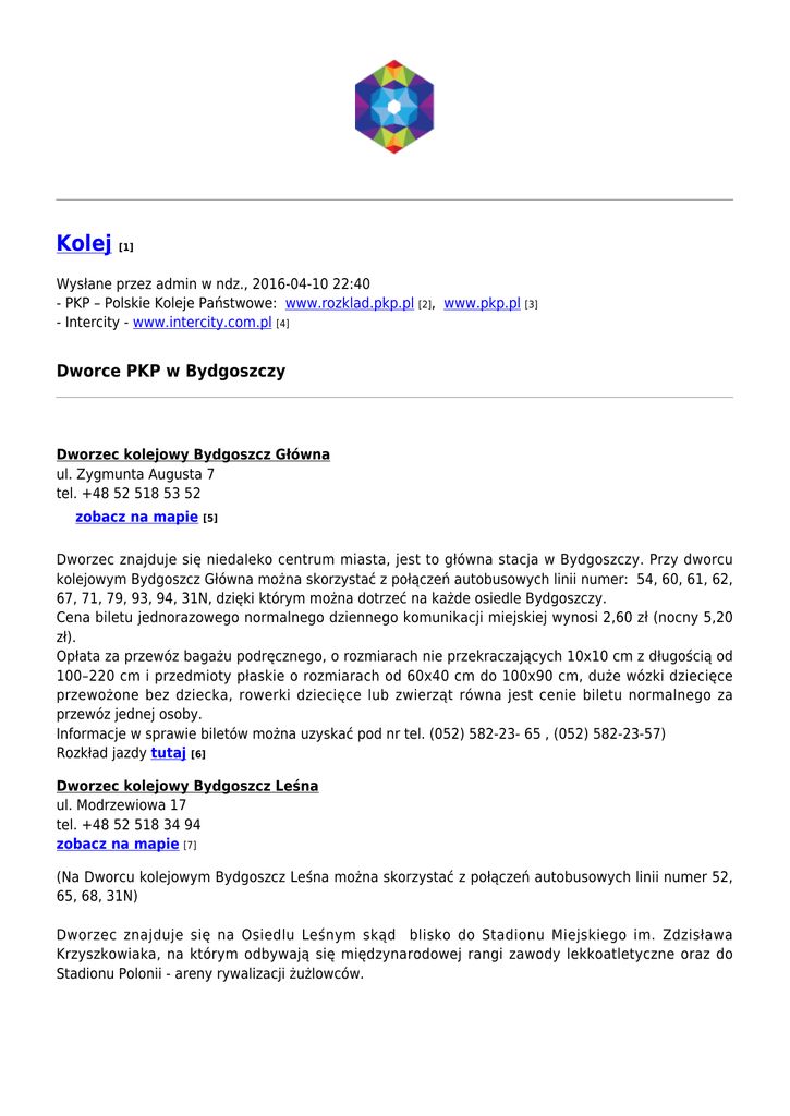 Kolej [1] Wysłane przez admin w ndz., 2016-04-10 22:40 - PKP – Polskie Koleje Państwowe: www.rozklad.pkp.pl [2], www.pkp.pl [3] - Intercity - www.intercity.com.pl [4] Dworce PKP w Bydgoszczy Dworzec kolejowy Bydgoszcz Główna ul. Zygmunta Augusta 7 tel. +48 52 518 53 52 zobacz na mapie [5] Dworzec znajduje się niedaleko centrum miasta, jest to główna stacja w Bydgoszczy. Przy dworcu kolejowym Bydgoszcz Główna można skorzystać z połączeń autobusowych linii numer: 54, 60, 61, 62, 67, 71, 79, 93, 94, 31N, dzięki którym można dotrzeć na każde osiedle Bydgoszczy. Cena biletu jednorazowego normalnego dziennego komunikacji miejskiej wynosi 2,60 zł (nocny 5,20 zł). Opłata za przewóz bagażu podręcznego, o rozmiarach nie przekraczających 10x10 cm z długością od 100–220 cm i przedmioty płaskie o rozmiarach od 60x40 cm do 100x90 cm, duże wózki dziecięce przewożone bez dziecka, rowerki dziecięce lub zwierząt równa jest cenie biletu normalnego za przewóz jednej osoby. Informacje w sprawie biletów można uzyskać pod nr tel. (052) 582-23- 65 , (052) 582-23-57) Rozkład jazdy tutaj [6] Dworzec kolejowy Bydgoszcz Leśna ul. Modrzewiowa 17 tel. +48 52 518 34 94 zobacz na mapie [7] (Na Dworcu kolejowym Bydgoszcz Leśna można skorzystać z połączeń autobusowych linii numer 52, 65, 68, 31N) Dworzec znajduje się na Osiedlu Leśnym skąd blisko do Stadionu Miejskiego im. Zdzisława Krzyszkowiaka, na którym odbywają się międzynarodowej rangi zawody lekkoatletyczne oraz do Stadionu Polonii - areny rywalizacji żużlowców. Dworce PKP w Toruniu Dworzec PKP Toruń Główny ul. Kujawska 1, informacja, tel. 94 36 lub +48 56 699 30 44 rezerwacja miejsc, kasa międzynarodowa, tel. +48 56 621 36 72, kasa ekspresowa, tel. +48 56 654 73 47 zobacz na mapie [8] Wychodząc przejściem podziemnym z dworca trafimy od razu na przystanki autobusowe. Stąd najlepiej wsiąść w autobusy linii 22 lub 27, które dalej przez centrum jadą odpowiednio do wschodniej (22) i północnej (27) części miasta. Można również skorzystać z autobusów linii nr: 11, 12, 14, 36, które zatrzymują się na przystanku po drugiej stronie ulicy. Wszystkie z nich przejeżdżają przez śródmieście (rozkład jazdy autobusów tutaj) [9]. Cena biletu jednorazowego normalnego dziennego wynosi 2,10 zł (nocny 4,20 zł). Opłata za przewóz bagażu podręcznego, którego suma trzech wymiarów wynosi 120 cm i więcej (m.in.: obrazy, sanki, narty, torby podróżne) lub zwierząt równa jest cenie biletu normalnego za przewóz jednej osoby. Dworzec PKP Toruń Wschodni pl. Fryderyka Skarbka 4, tel. +48 56 621 35 71 zobacz na mapie [10] Dworzec Toruń Wschodni (zlokalizowany w dzielnicy Mokre - do 1959 roku nosił nazwę Toruń Mokre) położony jest na głównej linii kolejowej Toruń Główny - Olsztyn i stanowi węzeł, z którego pociągi poza tymi dwoma kierunkami wyjeżdżają też w stronę Malborka (przez Grudziądz) oraz Sierpca (Nasielska). Dworzec ma dogodne połączenie komunikacyjne z dzielnicami Torunia, gdyż poza postojem taxi przy dworcu zatrzymują się autobusy i tramwaje wielu linii. Dworzec PKP Toruń Miasto pl. 18 Stycznia 4, tel. +48 56 621 30 12 zobacz na mapie [11] Dworzec Toruń Miasto usytuowany jest w centrum Torunia. Nie przyjeżdżają tu wszystkie pociągi jadące przez Toruń, dlatego trzeba się upewnić czy pociąg, którym chcemy jechać zatrzymuje się na tym dworcu. Polecić go można tym, których celem podróży jest centrum Torunia. Nieopodal dworca znajdują się przystanki autobusowe i tramwajowe kilku linii łączących jedynie wschodnie i zachodnie dzielnice miasta. W sąsiedztwie znajduje się ponadto dworzec autobusowy Toruńskiej Korporacji Autobusowej, gdzie zatrzymują się też dalekobieżne i międzynarodowe autobusy innych przewoźników.
