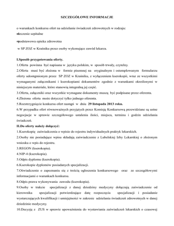 SZCZEGÓŁOWE INFORMACJE o warunkach konkursu ofert na udzielanie świadczeń zdrowotnych w rodzaju: •leczenie szpitalne •podstawowa opieka zdrowotna w SP ZOZ w Kraśniku przez osoby wykonujące zawód lekarza. I.Sposób przygotowania oferty. 1.Oferta powinna być napisana w języku polskim, w sposób trwały, czytelny. 2.Oferta musi być złożona w formie pisemnej na oryginalnym i ostemplowanym formularzu oferty udostępnionym przez SP ZOZ w Kraśniku, z wyłączeniem kserokopii, wraz ze wszystkimi wymaganymi załącznikami i kserokopiami dokumentów zgodnie z warunkami określonymi w niniejszym materiale, które stanowią integralną jej część. 3.Oferta, załączniki oraz wszystkie wymagane dokumenty muszą być podpisane przez oferenta. 4.Złożona oferta może dotyczyć tylko jednego oferenta. 5.Rozstrzygnięcie konkursu ofert nastąpi w dniu 29 listopada 2013 roku. 6.W przypadku ofert równoważnych przyjętych przez Komisję Konkursową przewidziane są ustne negocjacje w sprawie szczegółowego ustalenia ilości, miejsca, terminu i godzin udzielania świadczeń. II.Do oferty należy dołączyć: 1.Kserokopię zaświadczenia o wpisie do rejestru indywidualnych praktyk lekarskich. 2.Osoby nie posiadające wpisu składają zaświadczenie z Lubelskiej Izby Lekarskiej o złożonym wniosku o wpis do rejestru. 3.REGON (kserokopia). 4.NIP-4 (kserokopia). 5.Odpis dyplomu (kserokopia). 6.Kserokopie dyplomów posiadanych specjalizacji. 7.Oświadczenie o zapoznaniu się z treścią ogłoszenia konkursowego oraz ze szczegółowymi informacjami o warunkach konkursu. 8.Odpis prawa wykonywania zawodu (kserokopia). 9.Osoby w trakcie kierownika specjalizacji z danej dziedziny medycyny dołączają zaświadczenie od specjalizacji potwierdzające datę rozpoczęcia specjalizacji i posiadanie wystarczających kwalifikacji i umiejętności w zakresie udzielania świadczeń zdrowotnych w danej dziedzinie medycyny. 10.Decyzję z ZUS w sprawie upoważnienia do wystawiania zaświadczeń lekarskich o czasowej niezdolności do pracy (kserokopia). 11.Oświadczenie oferenta o niekaralności za przestępstwa oraz w związku z wykonywaną pracą lekarza. 12.Zaświadczenie o wpisie do ewidencji działalności gospodarczej (kserokopia). 13.Polisa ubezpieczeniowa potwierdzająca zawarcie umowy obowiązkowego ubezpieczenia odpowiedzialności cywilnej podmiotu przyjmującego zamówienia na świadczenie zdrowotne (dostarczyć najpóźniej w dniu obowiązywania umowy). III.Składanie ofert: Oferty należy składać do dnia 28 listopada 2013 roku do godziny 15.00 w zamkniętych kopertach, w formie pisemnej pod rygorem nieważności, w Sekretariacie SP ZOZ w Kraśniku, ul. Chopina 13, pokój 100 (budynek administracyjny) z określeniem na kopercie: •konkurs ofert na udzielanie świadczeń zdrowotnych z zaznaczeniem rodzaju świadczeń, I.Określenie przedmiotu świadczeń zdrowotnych. Świadczenia zdrowotne będą wykonywane na obszarze zgodnych z działalnością statutową SP ZOZ w Kraśniku, tj. Powiatu Kraśnickiego i zgodnie z wymaganiami Narodowego Funduszu Zdrowia. Świadczenia zdrowotne będą udzielane dla około 100 000 ludności, zamieszkałej w terenie Powiatu Kraśnickiego, a także w przypadkach pacjentów zgłaszających się z innych terenów oraz przypadków nagłych, wymagających natychmiastowej pomocy medycznej. Świadczenia w Szpitalnym Oddziale Ratunkowym Szpitala Powiatowego SP ZOZ w Kraśniku: W ramach leczenia szpitalnego świadczenia zdrowotne dotyczą dyżurów lekarskich w szpitalnym oddziale ratunkowym. Dyżury pełnione będą w Szpitalnym Oddziale Ratunkowym Szpitala Powiatowego przy ul. Chopina 13 w Kraśniku (dwa dyżury lekarskie). Konkursem objęte są godziny: 1) dla lekarzy chorób wewnętrznych: •od godz. 8.00 do 8.00 dnia następnego w dni powszednie oraz w dni wolne, świąteczne i niedziele; 2) dla lekarzy med. ratunkowej, chirurgii ogólnej, ortopedii i traumatologii narządu ruchu, anestezjologii i intensywnej terapii: •od godz. 8.00 do 8.00 dnia następnego w dni powszednie oraz w dni wolne, świąteczne i niedziele; (w przypadku, gdy lekarze Oddziału Ortopedyczno - Urazowego będą zatrudnieni w formie umowy cywilnoprawnej na tym oddziale); •od godz. 8.00 do 20.00 w dni powszednie, wolne, świąteczne i niedziele (w przypadku, gdy lekarze Oddziału Ortopedyczno - Urazowego będą zatrudnieni na umowie o pracę na tym oddziale) Zakres dyżurów lekarza SOR stanowią pacjenci ze schorzeniami chirurgicznymi i urazowymi oraz wszystkie przypadki nagłe, wymagające natychmiastowej pomocy lekarskiej. Do konkursu mogą przystąpić wyłącznie lekarze wyspecjalizowani w dziedzinie: medycyny ratunkowej, chirurgii ogólnej, ortopedii i traumatologii narządu ruchu, anestezjologii i intensywnej terapii oraz chorób wewnętrznych. Proponowane maksymalne stawki dla lekarzy dyżurnych SOR: lekarz specjalista – 50 zł/h w dni powszednie, wolne, świąteczne i niedziele; Proponowana minimalna liczba godzin miesięcznie do wykonania (dyżur lek. med. ratunkowej, chirurgii ogólnej, ortopedii i traumatologii narządu ruchu, anestezjologii i intensywnej terapii) – 12 h lub 24 h Proponowana minimalna liczba godzin miesięcznie do wykonania (dyżur lekarza chorób wewnętrznych) - 24 h. Proponowana maksymalna liczba godzin miesięcznie do wykonania – wg potrzeb SP ZOZ w Kraśniku. Konsultacje specjalistyczne w oddziałach szpitalnych: W ramach konsultacji specjalistycznych świadczenia zdrowotne dotyczą konsultacji lekarza neurochirurga w oddziale neurologii. Konsultacji mogą udzielać wyłącznie lekarze specjaliści w dziedzinie neurochirurgii. Świadczenia w Podstawowej Opiece Zdrowotnej: W ramach POZ świadczenia zdrowotne dotyczą dyżurów lekarskich. Dyżury pełnione będą w Izbie Przyjęć Szpitala Powiatowego przy ul. Al. Niepodległości 25 w Kraśniku ( jeden dyżur lekarza ogólnego ) oraz przy Szpitalnym Oddziale Ratunkowym Szpitala Powiatowego przy ul. Cho
