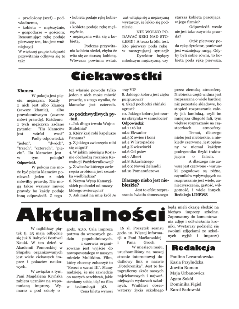 • przełożony (szef) – pod władnemu, • kobieta – mężczyźnie, • gospodarze – gościom; Reasumując: rękę podaje pierwszy ten, kto jest waż niejszy;) W większej grupie kolejność przywitania odbywa się to tak: • kobieta podaje rękę kobie cie, • kobieta podaje rękę męż czyźnie, • mężczyzna wita się z ko bietą; Podczas przywita nia kobieta siedzi, chyba że wita się ze starszą kobietą. Wówczas powinna wstać. zaś witając się z mężczyzną wystarczy, że lekko się pod niesie. NIE WOLNO PO DAWAĆ REKI NAD STO ŁEM!!! A teraz krótki test: Kto pierwszy poda rękę w następującej sytuacji: Dyrektor będący młodszym mężczyzną, czy starsza kobieta pracująca w jego firmie? Odpowiedź wcale nie jest taka oczywista praw da? Otóż pierwszy po da rękę dyrektor, ponieważ jest ważniejszy rangą. Gdy by byli sobie równi, to ko bieta poda rękę pierwsza. K ł a m ca . też właśnie powodu tylko jeden z nich może mówić prawdę, a z tego wynika, że kłamców jest czterech. rzy VI? 8. Jakiego koloru jest zięba purpurowa? 9. Skąd pochodzi chiński agrest? 10. Jakiego koloru jest czar na skrzynka w samolocie? O d p ow i e d z i : ad.1 116 lat ad.2 Ekwador ad.3 Z owiec i koni ad.4 W listopadzie ad.5 Z wiewiórki ad.6 Od psów ad.7 Albert ad.8 Szkarłatnego ad.9 Z Nowej Zelandii ad.10 Pomarańczowa przez ziemską atmosferę. Niebieska część widma jest rozpraszana o wiele bardziej niż pozostałe składowe, bo stopień rozpraszania zale ży jak lambda4, czyli im mniejsza długość fali, tym większe rozpraszanie na czą steczkach atmosfery. Temat, dlaczego niebo jest niebieskie, a nie kiedy czerwone, jest opisa ny w niemal każdym podręczniku fizyki traktu jącym o falach. A dlaczego nie za wsze jest czerwone warun ki pogodowe są różne, czynników wpływających na rozpraszanie jest wiele, za nieczyszczenia, gęstość, wil gotność, i wiele innych. R e d a k cj a L I NE W S W pokoju jest pię ciu mężczyzn. Każdy z nich jest albo kłamcą (zawsze kłamie), albo prawdomównym (zawsze mówi prawdę). Każdemu z tych mężczyzn zadano pytanie: "Ilu kłamców jest wśród was?" Padły odpowiedzi: "jeden", "dwóch", "trzech", "czterech", "pię ciu". Ilu kłamców jest w tym pokoju? O d p ow i e d ź . W pokoju nie mo że być pięciu kłamców po nieważ jeden z nich mówiłby prawdę. Nie mo gą także wszyscy mówić prawdy bo każdy podaje inną odpowiedź. Z tego Ciekawostki 10 podchwytliwych py t a ń . 1. Jak długo trwała Wojna Stuletnia? 2. Który kraj robi kapelusze Panama? 3. Z jakiego zwierzęcia robi się catgut? 4. W jakim miesiącu Rosja nie obchodzą rocznicę Re wolucji Październikowej? 5. Z włosów którego zwie rzęcia zrobiona jest szczot ka wielbłądzia? 6. Nazwa Wysp Kanaryj skich pochodzi od nazwy którego zwierzęcia? 7. Jak miał na imię król Je Dlaczego niebo jest nie bi e s k i e ? Aktualności W najbliższy pią tek tj. 25 maja odbędzie się już X Bałtycki Festiwal Nauki. W ten dzień w Akademii Pomorskiej w Słupsku organizowanych jest wiele ciekawych im prez i pokazów nauko wych. W związku z tym, Pani Magdalena Kryńska zabiera uczniów na wspo mnianą imprezę. Wy marsz z pod szkoły o godz. 9:30. Cała impreza potrwa do wczesnych go dzin popołudniowych. 1 czerwca organi zowane jest wyjście do nowopowstałego w naszym mieście Mulitkina. Film, który chcemy zobaczyć to "Faceci w czerni III". Mamy nadzieję, że nie zawiedzie on naszych oczekiwań, jakie stawiamy sobie, idąć na film w technologii 3D. Cena biletu wynosi Jest to efekt rozpra szania światła słonecznego 16 zł. Początek seansu godz. 10. Więcej informa cji u Pani Maćkowskiej i Pana Groch. W miesiącu maju, uruchomiliśmy na naszej stronie internetowej do datkowy link o nazwie „Fotokronika”. Jest to fo tograficzny skrót naszych najciekawszych i najważ niejszych wydarzeń szkol nych. Wnikliwi obser watorzy życia szkolnego będą mieli okazję śledzić na bieżąco imprezy szkolne. Zapraszamy do komentowa nia zdjęć i odświeżania kro niki. Wystarczy podzielić się swoimi zdjęciami ze szkol nych wyjść i imprez:) Redakcja Paulina Lewandowska Kasia Przyłudzka Jowita Roman Maja Urbanowicz Agata Sokół Dominika Figiel Karol Sadowski