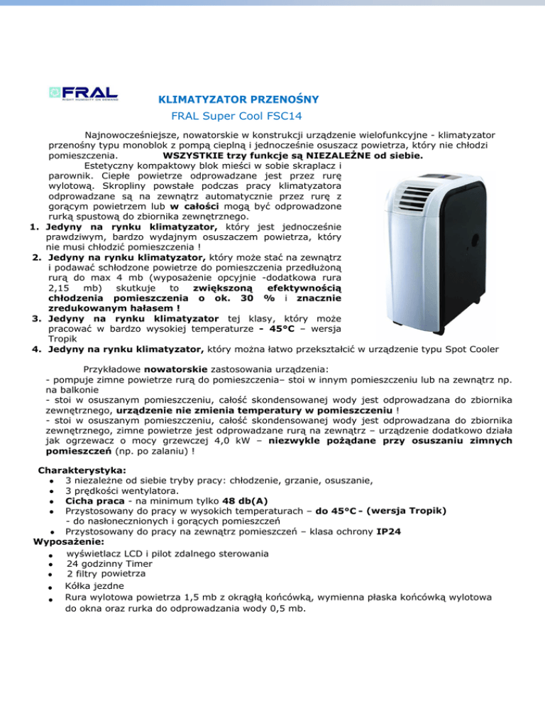 KLIMATYZATOR PRZENOŚNY FRAL Super Cool FSC14 1. 2. 3. 4. Najnowocześniejsze, nowatorskie w konstrukcji urządzenie wielofunkcyjne - klimatyzator przenośny typu monoblok z pompą cieplną i jednocześnie osuszacz powietrza, który nie chłodzi pomieszczenia. WSZYSTKIE trzy funkcje są NIEZALEŻNE od siebie. Estetyczny kompaktowy blok mieści w sobie skraplacz i parownik. Ciepłe powietrze odprowadzane jest przez rurę wylotową. Skropliny powstałe podczas pracy klimatyzatora odprowadzane są na zewnątrz automatycznie przez rurę z gorącym powietrzem lub w całości mogą być odprowadzone rurką spustową do zbiornika zewnętrznego. Jedyny na rynku klimatyzator, który jest jednocześnie prawdziwym, bardzo wydajnym osuszaczem powietrza, który nie musi chłodzić pomieszczenia ! Jedyny na rynku klimatyzator, który może stać na zewnątrz i podawać schłodzone powietrze do pomieszczenia przedłużoną rurą do max 4 mb (wyposażenie opcyjnie -dodatkowa rura 2,15 mb) skutkuje to zwiększoną efektywnością chłodzenia pomieszczenia o ok. 30 % i znacznie zredukowanym hałasem ! Jedyny na rynku klimatyzator tej klasy, który może pracować w bardzo wysokiej temperaturze - 45°C – wersja Tropik Jedyny na rynku klimatyzator, który można łatwo przekształcić w urządzenie typu Spot Cooler Przykładowe nowatorskie zastosowania urządzenia: - pompuje zimne powietrze rurą do pomieszczenia– stoi w innym pomieszczeniu lub na zewnątrz np. na balkonie - stoi w osuszanym pomieszczeniu, całość skondensowanej wody jest odprowadzana do zbiornika zewnętrznego, urządzenie nie zmienia temperatury w pomieszczeniu ! - stoi w osuszanym pomieszczeniu, całość skondensowanej wody jest odprowadzana do zbiornika zewnętrznego, zimne powietrze jest odprowadzane rurą na zewnątrz – urządzenie dodatkowo działa jak ogrzewacz o mocy grzewczej 4,0 kW – niezwykle pożądane przy osuszaniu zimnych pomieszczeń (np. po zalaniu) ! Charakterystyka: 3 niezależne od siebie tryby pracy: chłodzenie, grzanie, osuszanie, 3 prędkości wentylatora. Cicha praca - na minimum tylko 48 db(A) Przystosowany do pracy w wysokich temperaturach – do 45°C - (wersja Tropik) - do nasłonecznionych i gorących pomieszczeń Przystosowany do pracy na zewnątrz pomieszczeń – klasa ochrony IP24 Wyposażenie: wyświetlacz LCD i pilot zdalnego sterowania 24 godzinny Timer 2 filtry powietrza Kółka jezdne Rura wylotowa powietrza 1,5 mb z okrągłą końcówką, wymienna płaska końcówką wylotowa do okna oraz rurka do odprowadzania wody 0,5 mb. Jako SpotCooler z dodatkową rurą o długości 2,15 mb Na balkonie, pompuje zimne powietrze Jako wydajny osuszacz powietrza DANE TECHNICZNE Wydajność chłodzenia (28°C , 55%RH) Wydajność chłodzenia (28°C , 55%RH) Wydajność grzania (18°C , 55%RH) Wydajność grzania (18°C , 55%RH) Wydajność osuszania ( 30°C i 80%RH) Przepływ powietrza procesowego zimnego - max. - min Przepływ powietrza roboczego Czynnik chłodniczy Długość rury wylotowej Natężenie prądu Pobór prądu chłodzenie/grzanie Głośność min.-max. Zakres temperatury pracy - chłodzenie Zakres temperatury pracy - grzanie Zakres temperatury pracy - osuszanie Niezależne tryby pracy – chłodzenie, osuszanie, grzanie, Sleep, Wymiary Szerokość x Głębokość x Wysokość Kolor Waga Standard bezpieczeństwa/klasa ochrony IP Klasa energetyczna Gwarancja 4,0 kW 14 000 BTU 4,0 kW 14 000 BTU 70 litrów/24 godz 450m3_320m3/godz. 450m3 /godz. R410 150 cm, fi 15 cm 8A 1,7 kW / 1,5 kW 48-54 db(A) 5-45oC 8-25oC 8-40oC 4 300x505x778 mm biały/czarny 31,0/33 kg CE/ IP 24 A 3 lata