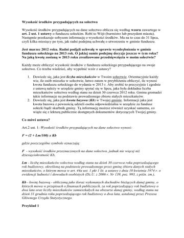 Wysokość środków przypadających na sołectwo Wysokość środków przypadających na dane sołectwo oblicza się według wzoru zawartego w art. 2 ust. 1 ustawy o funduszu sołeckim. Robi to Wójt (burmistrz lub prezydent miasta). Następnie przekazuje sołtysom informację o wysokości środków. Ma na to czas do 31 lipca, czyli kilka miesięcy po tym, jak radni podejmą uchwałę o utworzeniu w gminie funduszu. Jest marzec 2012 roku. Radni podjęli uchwałę w sprawie wyodrębnienia w gminie funduszu sołeckiego na 2013 rok. O jakiej sumie podejmę decyzje jeszcze w tym roku? Na jaką kwotę zostaną w 2013 roku zrealizowane przedsięwzięcia w moim sołectwie? Każdy może obliczyć wysokość środków z funduszu sołeckiego przypadającego na swoje sołectwo. Co trzeba wiedzieć, aby wypełnić wzór z ustawy? 1. Dowiedz się, jaka jest liczba mieszkańców w Twoim sołectwie. Orientacyjnie każdy wie, ile osób mieszka w sołectwie, łatwo zatem w przybliżeniu obliczyć, ile wynosi kwota funduszu sołeckiego do wydania w 2013 r. Aby zrobić to precyzyjnie i zgodnie z ustawą należy w urzędzie gminy spytać się w lipcu, jaka była dokładna liczba mieszkańców sołectwa według stanu na dzień 30 czerwca 2012 roku. Gmina gromadzi takie informacje na podstawie prowadzonego zbioru stałych mieszkańców. 2. Dowiedz się, jaka jest kwota bazowa (Kb) w Twojej gminie. Informacji jaka jest kwota bazowa z pewnością udzieli osoba odpowiedzialna w urzędzie za fundusz sołecki bądź skarbnik gminy. Tą informację możesz również uzyskać samemu, co wiąże się z lekturą publicznie dostępnych dokumentów dotyczących Twojej gminy. Co mówi ustawa? Art.2 ust. 1: Wysokość środków przypadających na dane sołectwo wynosi: F = (2 + Lm/100) x Kb gdzie poszczególne symbole oznaczają: F - wysokość środków przeznaczonych na dane sołectwo, jednak nie więcej niż dziesięciokrotność Kb, Lm - liczbę mieszkańców sołectwa według stanu na dzień 30 czerwca roku poprzedzającego rok budżetowy, określoną na podstawie prowadzonego przez gminę zbioru danych stałych mieszkańców, o którym mowa w art. 44a ust. 1 pkt 1 lit. a ustawy z dnia 10 kwietnia 1974 r. o ewidencji ludności i dowodach osobistych (Dz.U. z 2006 r. Nr 139, poz. 993, z późn. zm.), Kb - kwotę bazową - obliczoną jako iloraz wykonanych dochodów bieżących danej gminy, o których mowa w przepisach o finansach publicznych, za rok poprzedzający rok budżetowy o dwa lata oraz liczby mieszkańców zamieszkałych na obszarze danej gminy, według stanu na dzień 31 grudnia roku poprzedzającego rok budżetowy o dwa lata, ustalonej przez Prezesa Głównego Urzędu Statystycznego. Przykład 1 W 2011 roku radni zdecydowali o utworzeniu funduszu sołeckiego. Ile wyniósł fundusz sołecki w przypadku każdego sołectwa gminy Laskowice Wielkie na rok 2012? 1. Liczba mieszkańców sołectwa na dzień 30 czerwca roku w którym radni podejmują uchwałę, czyli na 30.06.2011 - z ewidencji mieszkańców prowadzonej przez gminę: znajdziesz ją w tabelce poniżej. 2. Kwota bazowa obliczana jest według zasad przedstawionych w ustawie. Należy podzielić dochody bieżące gminy przez liczbę mieszkańców gminy. Chodzi o dochody bieżące gminy sprzed dwóch lat w stosunku do roku, w którym fundusz będzie fizycznie realizowany. Czyli radni i mieszkańcy podejmowali decyzje w 2011 roku, fundusz ma być realizowany w 2012 r. zatem do obliczeń muszą być wzięte dochody bieżące z 2010 r. Liczba mieszkańców dotyczy stanu na 31 grudnia również na dwa lata wstecz w stosunku do roku w którym fundusz ma być realizowany, czyli w tym przypadku na 31 grudnia 2010 r. Ustala ją Prezes Głównego Urzędu Statystycznego. dochody bieżące gminy (wykonanie w 2010 r.) 17 644 998,60 zł Kb = ----------------------------------------------------------------------------------------------------------------------liczba mieszkańców gminy (ustalona przez Prezesa GUS na 31.12.2010) 7026 Kb na rok 2012 wynosi 2511,39 zł Wszystkie informacje potrzebne do powyższych obliczeń są jawne. Ile wyniósł fundusz sołecki Chocianowicach, o którym w 2011 roku zdecydowali mieszkańcy? F = (2 + Lm/100) x Kb F = (2 + 1131/100) x 2511,39 zł = (2+11,31)x2511,39 =…25113,90 zł Dlaczego kwota przypadająca na sołectwo Chocianowice nie równa się 33426,60 zł? W art. 2 ust. 1 ustawy o funduszu sołeckim, w wyjaśnieniu oznaczenia kwoty bazowej znalazł się bowiem zapis, iż wysokość środków przeznaczonych na dane sołectwo nie może przekroczyć dziesięciokrotność Kb - kwoty bazowej. Ponieważ wyniosła ona 2511,39 zł fundusz sołecki dla Chocianowic nie mógł wynieść więcej niż 25113,90 zł. W przypadku sołectw gminy Laskowice Wielkie fundusz sołecki przypadający na poszczególne sołectwa wyniósł: Źródło tabeli: http://lasowicewielkie.pl/fundusze-soleckie-na-rok-2012,news,105,293.html Przykład 2 Z obliczeniem funduszu sołeckiego na 2010 rok w gminie Kłodawa można zapoznać się tutaj. Przykład 3 Z obliczeniem funduszu sołeckiego na 2012 rok w gminie Gniezno można zapoznać się tutaj. Często powtarzające się błędy Regionalne Izby Obrachunkowe oraz Naczelna Izba Kontroli zwracają uwagę na właściwe policzenie środków przypadających na sołectwo. Kontrole wskazują, iż jest to jeden z często powtarzających się błędów. Warto upewnić się, aby dane o liczbie mieszkańców w poszczególnych sołectwach były przez Gminę aktualizowane. Zdarza się, że w obliczeniach występują również błędy rachunkowe. Informacje uzupełniające Co to są dochody bieżące gminy? Mówi o tym ustawa o finansach publicznych z dnia 27 sierpnia 2009 r. w art. 235 ust. 2 i 3: 2. Przez dochody bieżące budżetu jednostki samorządu terytorialnego rozumie się dochody budżetowe niebędące dochodami majątkowymi. 3. Do dochodów majątkowych zalicza się: 1) dotacje i środki przeznaczone na inwestycje; 