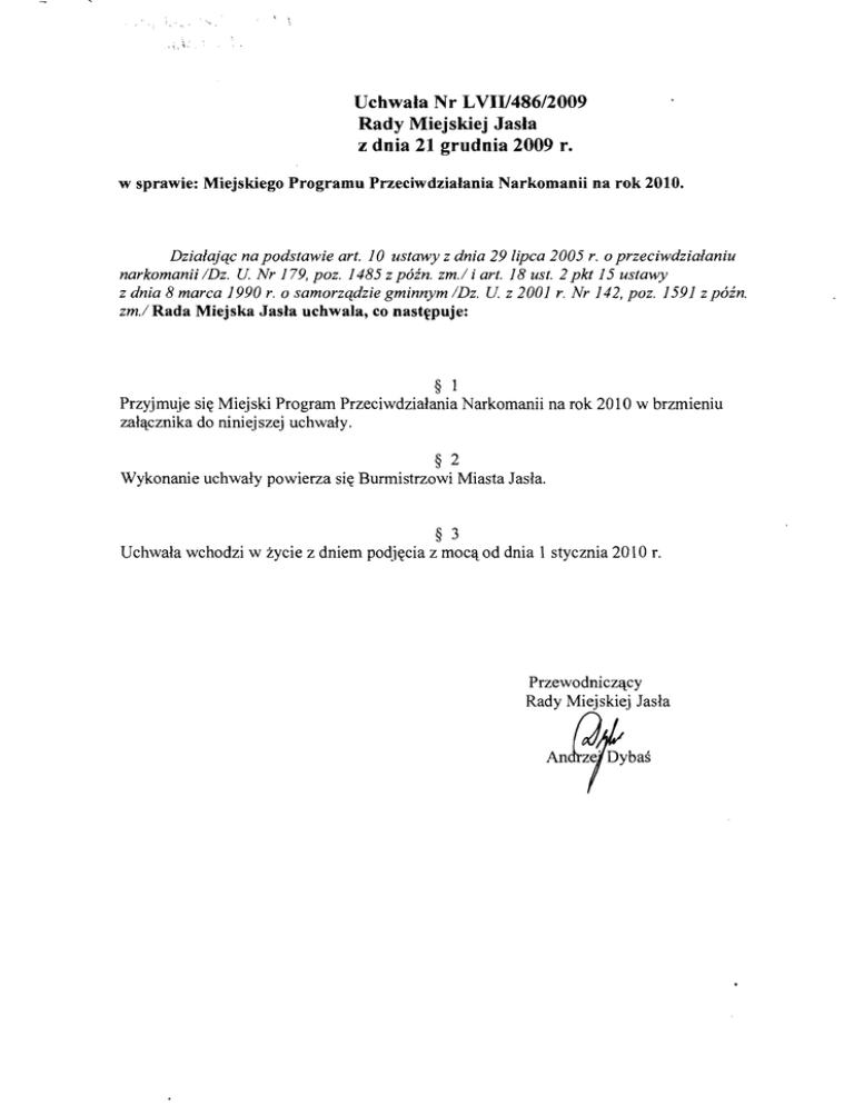 , ," ~- Uchwala Nr LVII/486/2009 Rady Miejskiej Jasia z dnia 21 grudnia 2009 r. w sprawie: Miejskiego Programu Przeciwdziałania Narkomanii na rok 2010. Działając na podstawie art. 10 ustawy z dnia 29 lipca 2005 r. o przeciwdziałaniu narkomanii /Dz. U Nr 179, poz. 1485 z późno zm./ i art. 18 ust. 2 pkt 15 ustawy z dnia 8 marca 1990 r. o samorządzie gminnym /Dz. U z 2001 r. Nr 142, poz. 1591 zpóźn. zm./ Rada Miejska Jasła uchwala, co następuje: § 1 Miejski Program Przeciwdziałania Narkomanii na rok 2010 w brzmieniu załącznika do niniejszej uchwały. Przyjmuje się Wykonanie Uchwała uchwały wchodzi w § 2 powierza się Burmistrzowi Miasta Jasła. życie § 3 z dniem podjęcia z mocą od dnia 1 stycznia 2010 r. Przewodniczący Rady Miejskiej Jasła Angfbaś Załącznik do Uchwały Nr LVII/486/2009 Rady Miejskiej Jasła z dnia 21 grudnia 2009 r. Miejski Program Przeciwdziałania Narkomanii na rok 2010 I. WPROWADZENIE Narkomania jest zjawiskiem ogólnoświatowym. Powstaje na podłożu przeobrażeń zachodzących we współczesnym cywilizowanym świecie i staje się poważnym problemem społecznym. Narkomania powstaje na skutek zanikania tradycyjnych więzi społecznych, zwłaszcza rodzinnych oraz osłabienia funkcji wychowawczej rodziny i szkoły. Jest niepokojącym przejawem trudności dojrzewania psychospołecznego, a zwłaszcza emocjonalnego młodych ludzi. Zażywanie narkotyków wywołuje wiele różnych problemów rodzinnych, szkolnych, prawnych oraz zdrowotnych. Jednym z nich jest wystąpienie tzw. zespołu uzależnienia, a także ostrych i przewlekłych chorób, w tym zakażenia wirusem HIV. Narkomania jest przyczynątragedii wielu młodych ludzi i ich rodzin. Stanowi poważne zagrożenie dla zdrowia społeczeństwa. Dlatego też istotnym jest, aby działania zapobiegawcze miały charakter interdyscyplinarny i międzysektorowy. Program winien być dostosowany do warunków lokalnych, do problemu, jakim jest narkomania. , II. GLOWNE CELE MIEJSKIEGO PROGRAMU PRZECIWDZIAŁANIANARKOMANII Miejski Program Przeciwdziałania Narkomanii został opracowany w oparciu o ustawę z dnia 29 lipca 2005 r. o przeciwdziałaniu narkomanii (Dz. U. Nr 179, poz. 1485 ze zm.) określa lokalną strategię w zakresie narkomanii i związanych z nią problemów. Przeciwdziałanie narkomanii realizuje się przez odpowiednie kształtowanie polityki społecznej, gospodarczej, oświatowo - wychowawczej i zdrowotnej, a w szczególności poprzez: a) b) działalność zmianę edukacyjno - informacyjną wśród młodzieży; struktury spożywania środków psychotropowych, w kierunku minimalizacji spożycia. Podstawę do działań w zakresie przeciwdziałania narkomanii stanowi Krajowy Program opracowany przez Krajowe Biuro ds. Przeciwdziałania Przeciwdziałania Narkomanii Narkomanii. Celem głównym Miejskiego Programu Przeciwdziałania Narkomanii jest: "Zmniejszenie zjawiska rozwoju uzależnień 1 od środków psychoaktywnych". Osiągnięcie celu głównego będzie możliwe poprzez realizację celów szczegółowych: 1. Wzmacnianie więzi rodzinnych. 2. Podniesienie poziomu samooceny wśród młodzieży. 3. Zagospodarowanie czasu wolnego młodzieży. 4. Działania zmierzające do ograniczania pierwszego kontaktu młodzieży z środkami psychoaktywnymi. Propagowanie zachowań prozdrowotnych dla dzieci i młodzieży. 5. Uwrażliwienie społeczności lokalnej Jasła na problem narkomanii. 6. Podnoszenie kwalifikacji kadry zaangażowanej w przeciwdziałanie zjawisku narkomanii w Jaśle. Cele szczegółowe Miejskiego Programu Przeciwdziałania Narkomanii osiągnięte zostaną poprzez realizację niżej wymienionych projektów. 2 III. PROJEKTY W ZAKRESIE PROFILAKTYKI I EDUKACJI DOTYCZĄCEJNARKOMANII 1. Wzmacnianie więzi rodzinnych. Projekt i jego cel Działania Zajęcia - wybór odpowiedniego programu, - szkolenie nauczycieli, - przygotowanie pomocy dydaktycznych (plakaty, ulotki) - wdrażanie programu profilaktyczne dla młodzieży Wskaźniki lista osób Źródła Termin realizacji weryfikacji rok szkolny lista uczniów uczestniczących uczestniczących w w tych formach zajęciach Realizatorzy Niezbędne zasoby rzeczowe pedagog, wychowawca szkolnej świetlicy klasa szkolna opiekuńczo- wychowawczej. 2.Podniesienie poziomu samooceny wśród młodzieży. Projekt i jego cel Działania Zajęcia - wybór odpowiedniego programu, - szkolenie nauczycieli, - przygotowanie pomocy dydaktycznych (plakaty, ulotki) - wdrażanie programu integracyjno profilaktyczne dla młodzieży np. III ELEMENTARZ "POMOST" Udział młodzieży w lokalnych i ogóinopolskich kampaniach profilaktyczno edukacyjnych - zgłoszenie udziału w kampanii, - pozyskanie środków, - informacja dla dyrektorów i uczniów, - doradztwo w realizowaniu działań kampanii Wskaźniki liczba uczniów Termin realizacji rok szkolny Źródła Realizatorzy weryfikacji lista uczniów Niezbędne zasoby rzeczowe uczestniczących uczestniczących pedagog, psycholog, wychowawca w tych formach w zajęciach świetlicy opiekuńczo- klasa szkolna wychowawczej, organizacje pozarządowe, kwiecień- liczba uczniów chętnych do czerwiec, udziału wrzesień w kampanii 3 lista uczniów, którzy wzięli udział w kampanii, lista uczniów nagrodzonych funkcjonariusze Straży Miejskiej wychowawcy świetlic - szkolni koordynatorzy, Urząd Miasta, organizacje pozarządowe szkolna świetlica 3. Zagospodarowanie czasu wolnego Projekt i jego cel Działania Wspieranie - zajęcia pozalekcyjne, - kółka dzhdalności szkolnych świetlic młodzieży. opiekuńczo- zainteresowań, wychowawczych - zajęcia sportowo rekreacyjne na MOSiR. - pozyskanie Wspieranie finansowe letniego i zimowego wypoczynku dla dzieci i młodzieży z rodzin dysfunkcyjnych przez szkołę i organizacje pozarządowe środków, - sporządzenie listy uczestników, - opracowanie programu kolonii lub Wskaźniki liczba uczniów Termin realizacji rok szkolny Źródła Realizatorzy weryfikacji lista uczniów uczestniczący